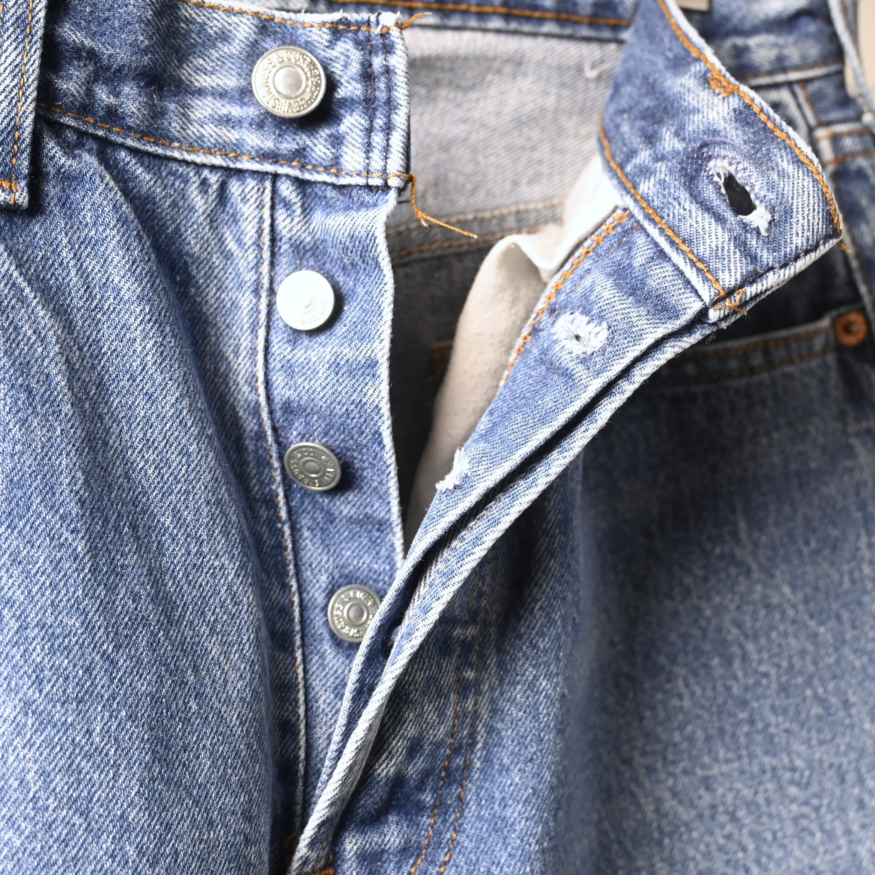 全体に淡くきれいなブルーフェードが入り、フロントからバックにかけて均一すぎない縦方向の色落ちが出ており、ヴィンテージ501らしい柔らかな表情に仕上がっています。ヒゲやアタリも控えめで、日常に取り入れやすいクリーンな印象です。