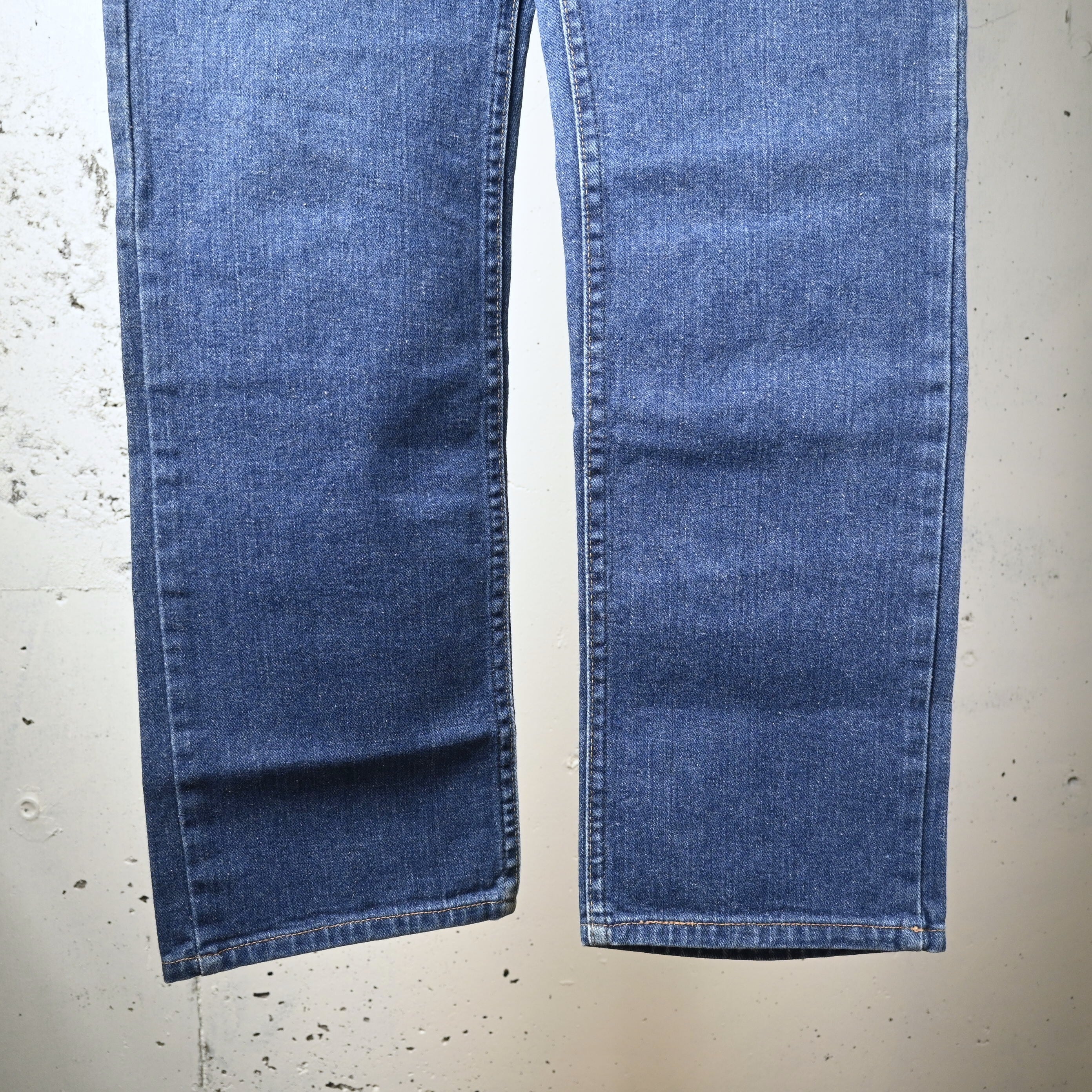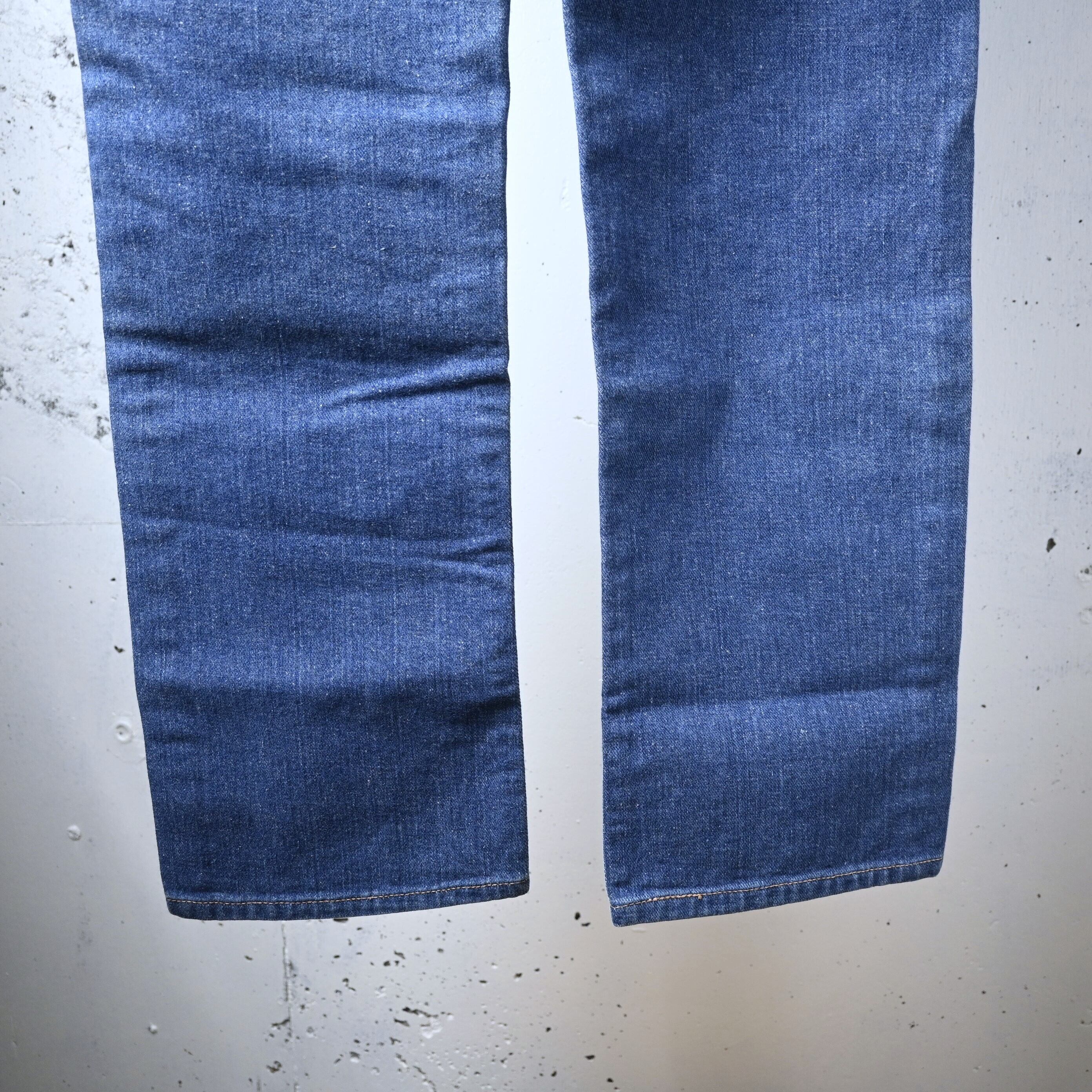 色落ちは全体にきれいなブルーフェードで、腿から膝にかけて自然に淡くなり、裾へ向かって濃さが残るバランスの良いグラデーション。縦方向の色落ちも入り、70〜80年代USA製らしいデニムの風合いがしっかり出ています。