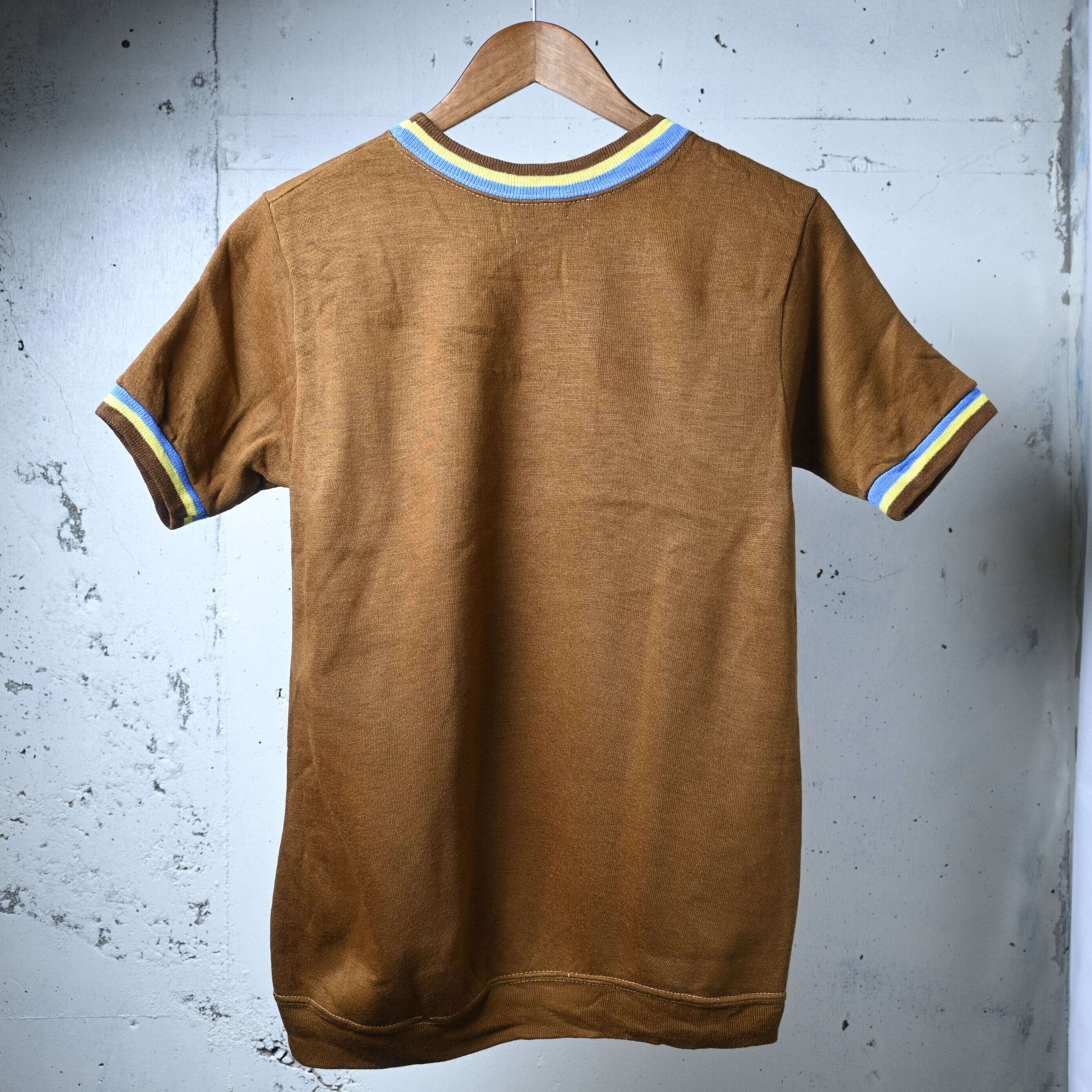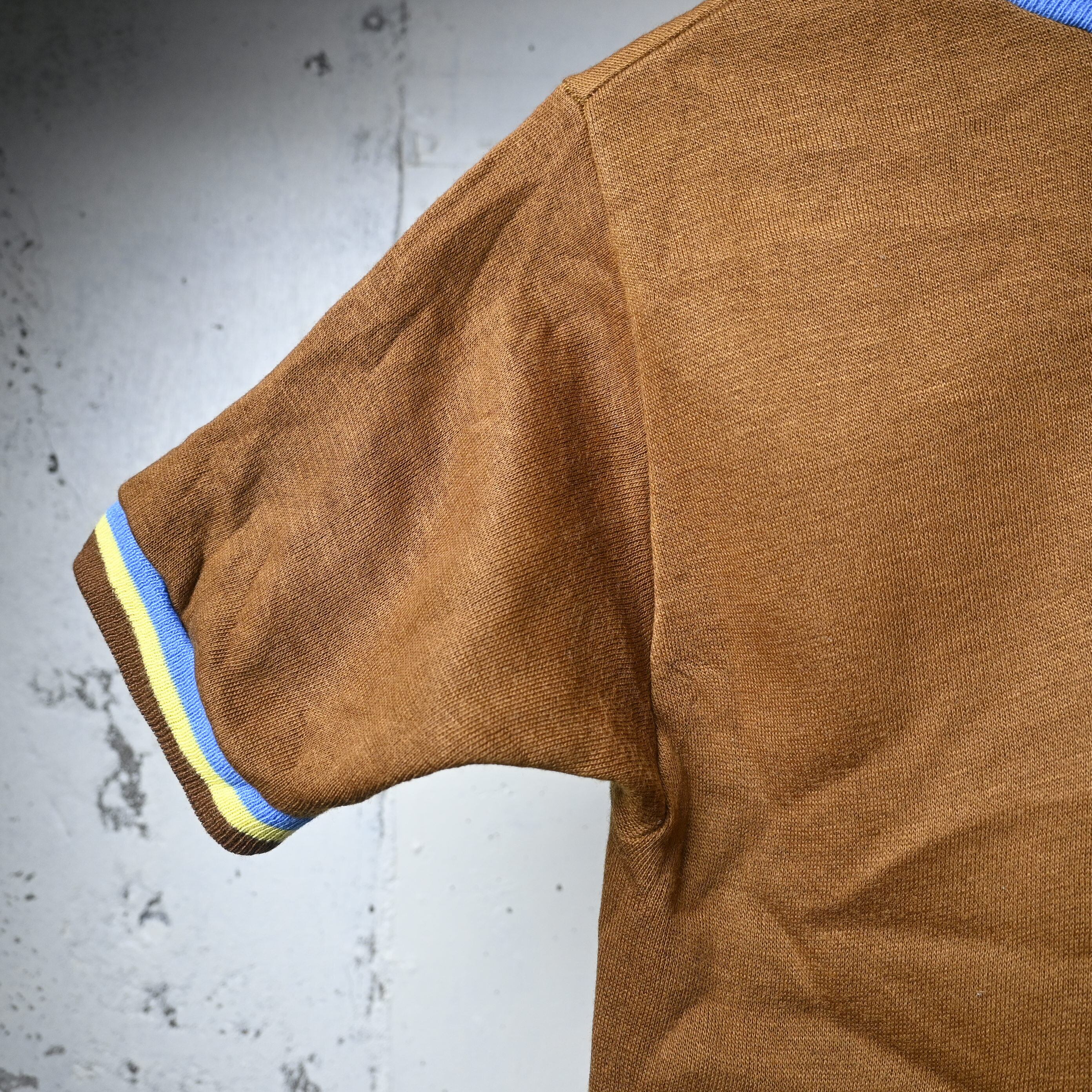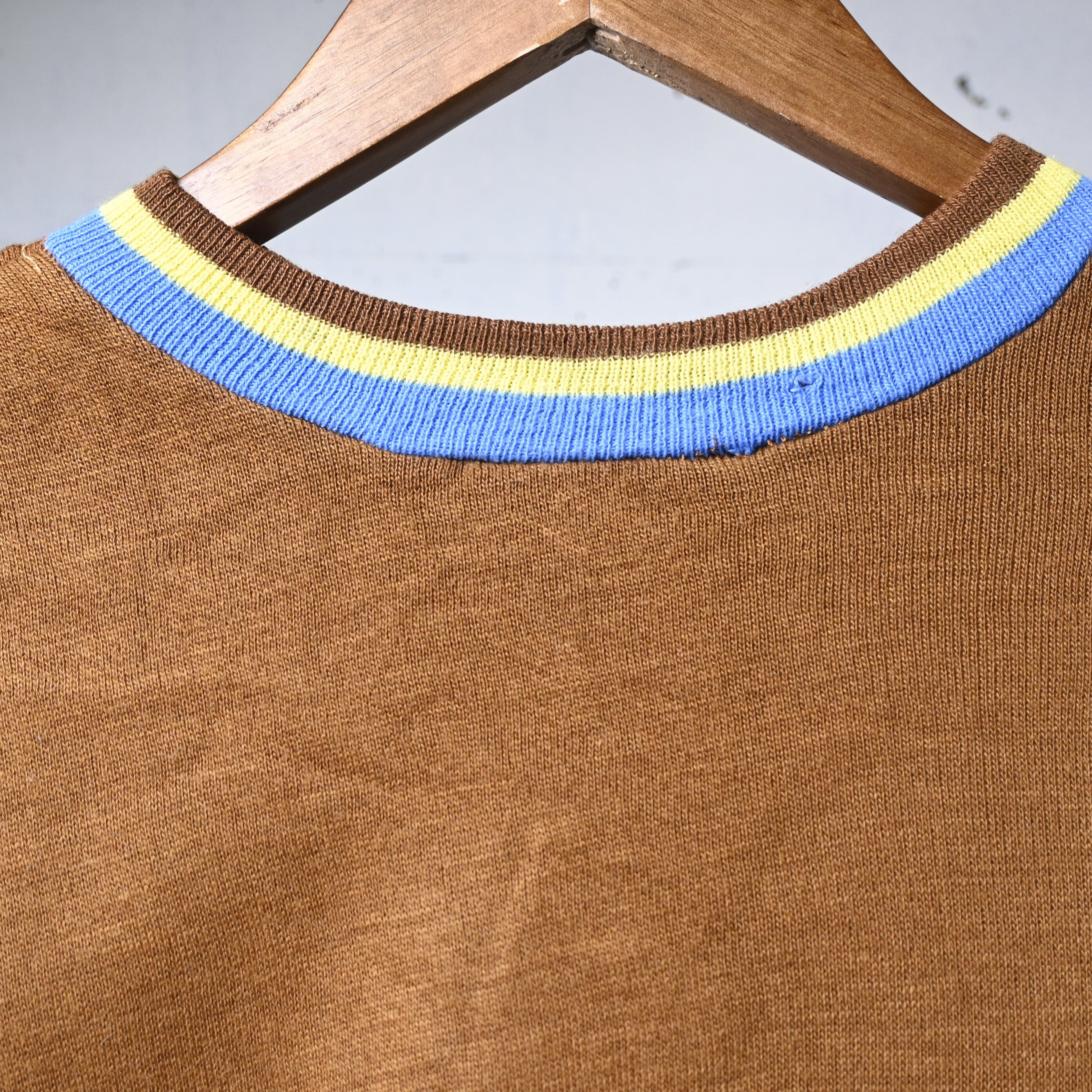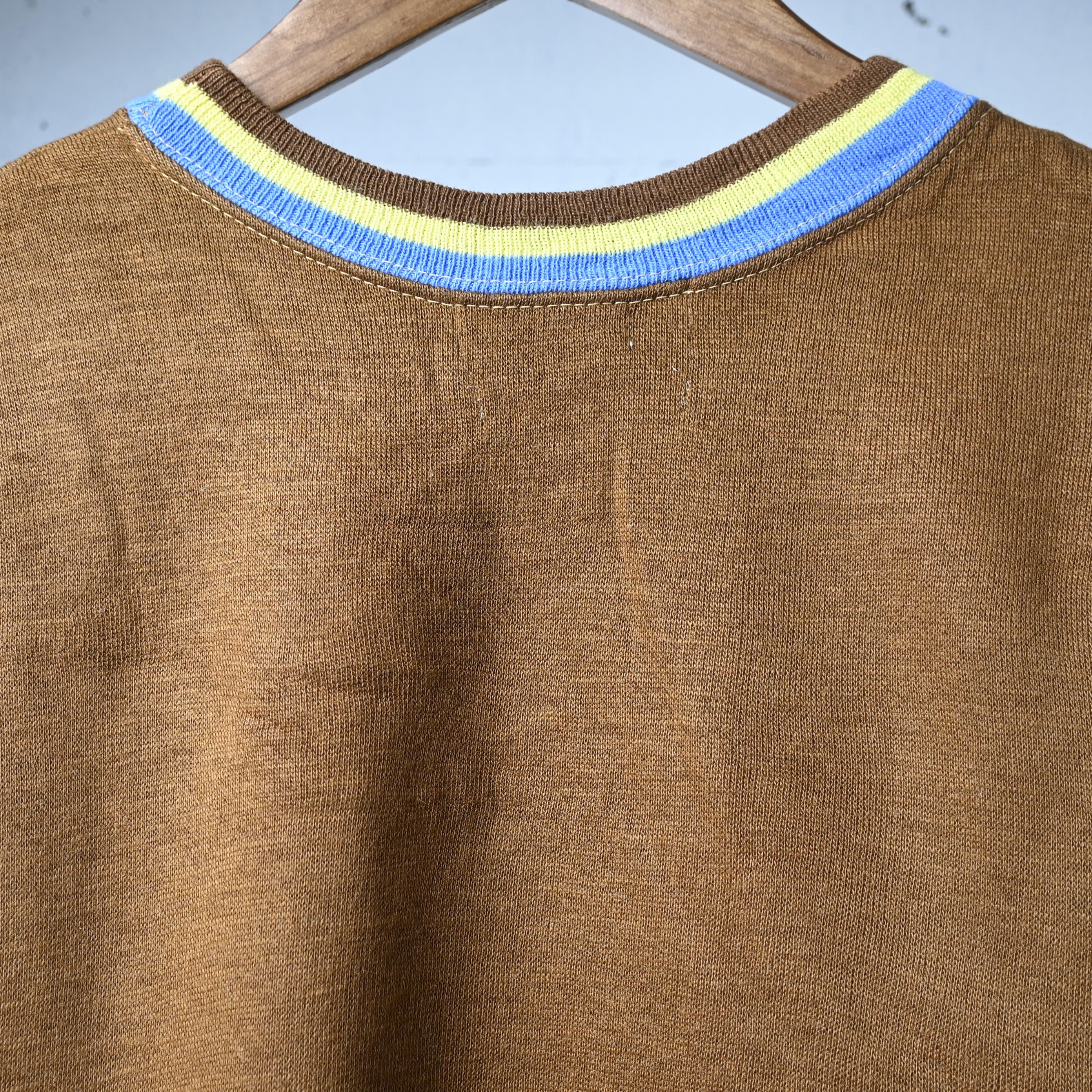 ボディは深みのあるブラウンカラーで、首元と袖口に入るブルー×イエローのライン入りリブが非常に印象的です。単色ボディに対してリブ配色が効いており、70年代らしいスポーティーな雰囲気がしっかり出ています。