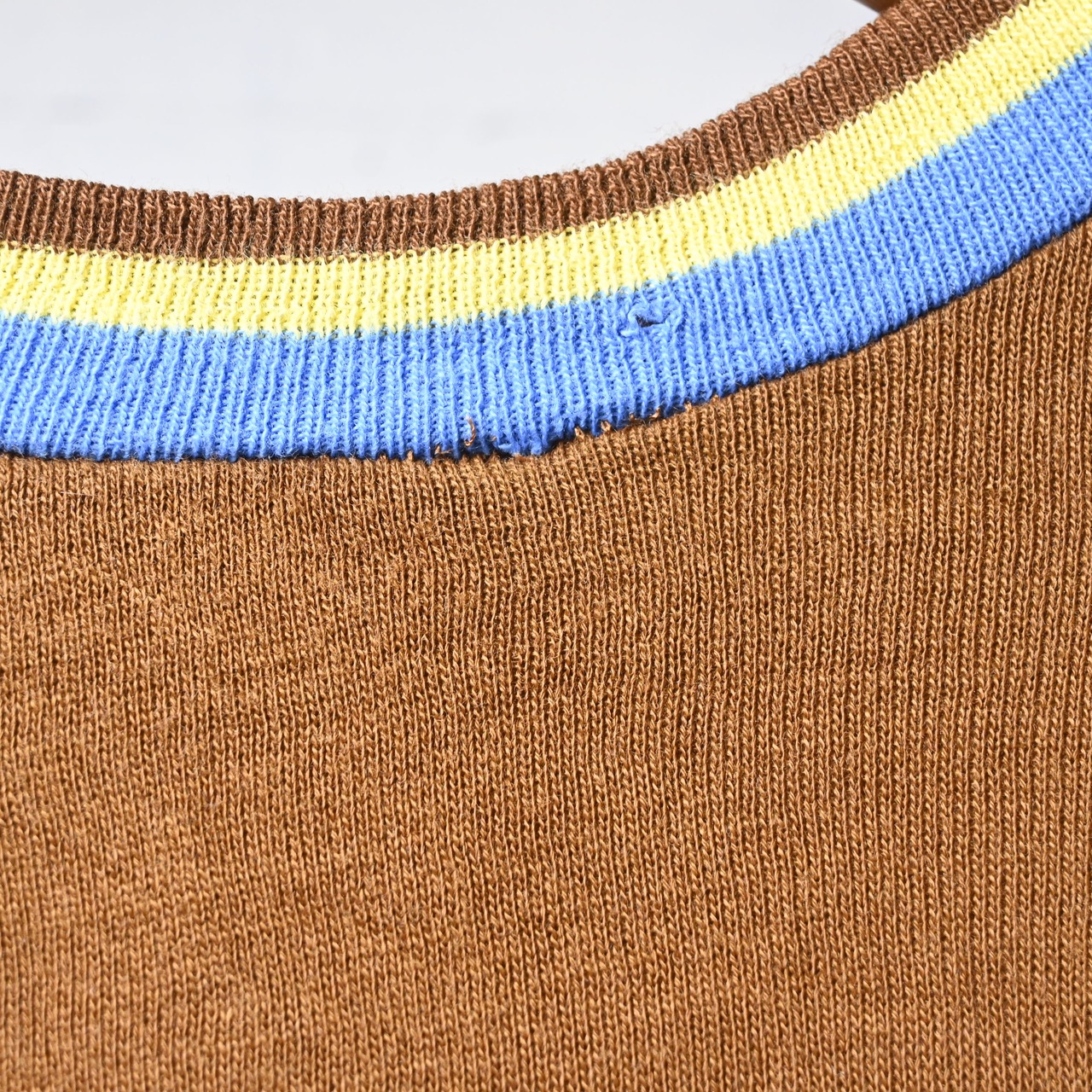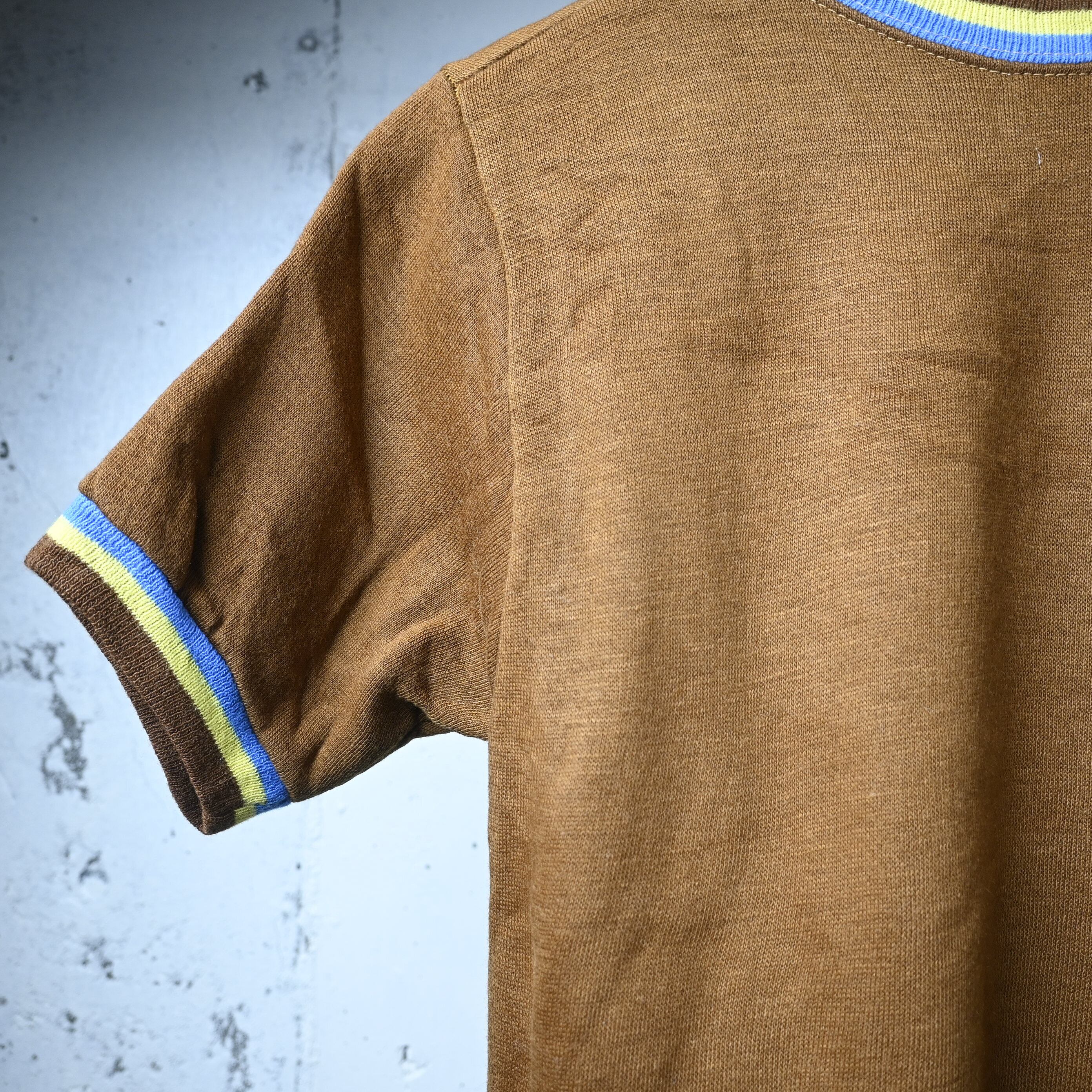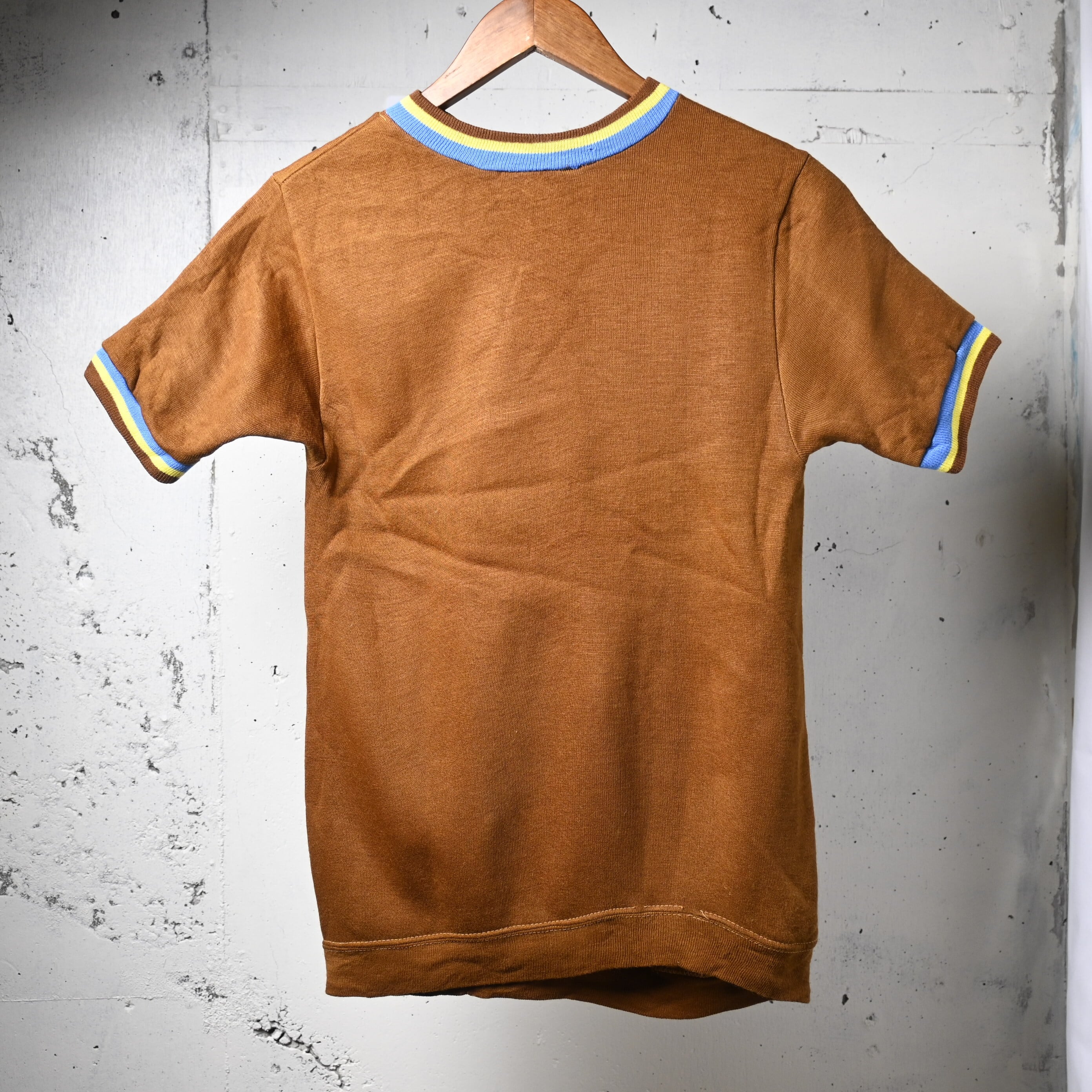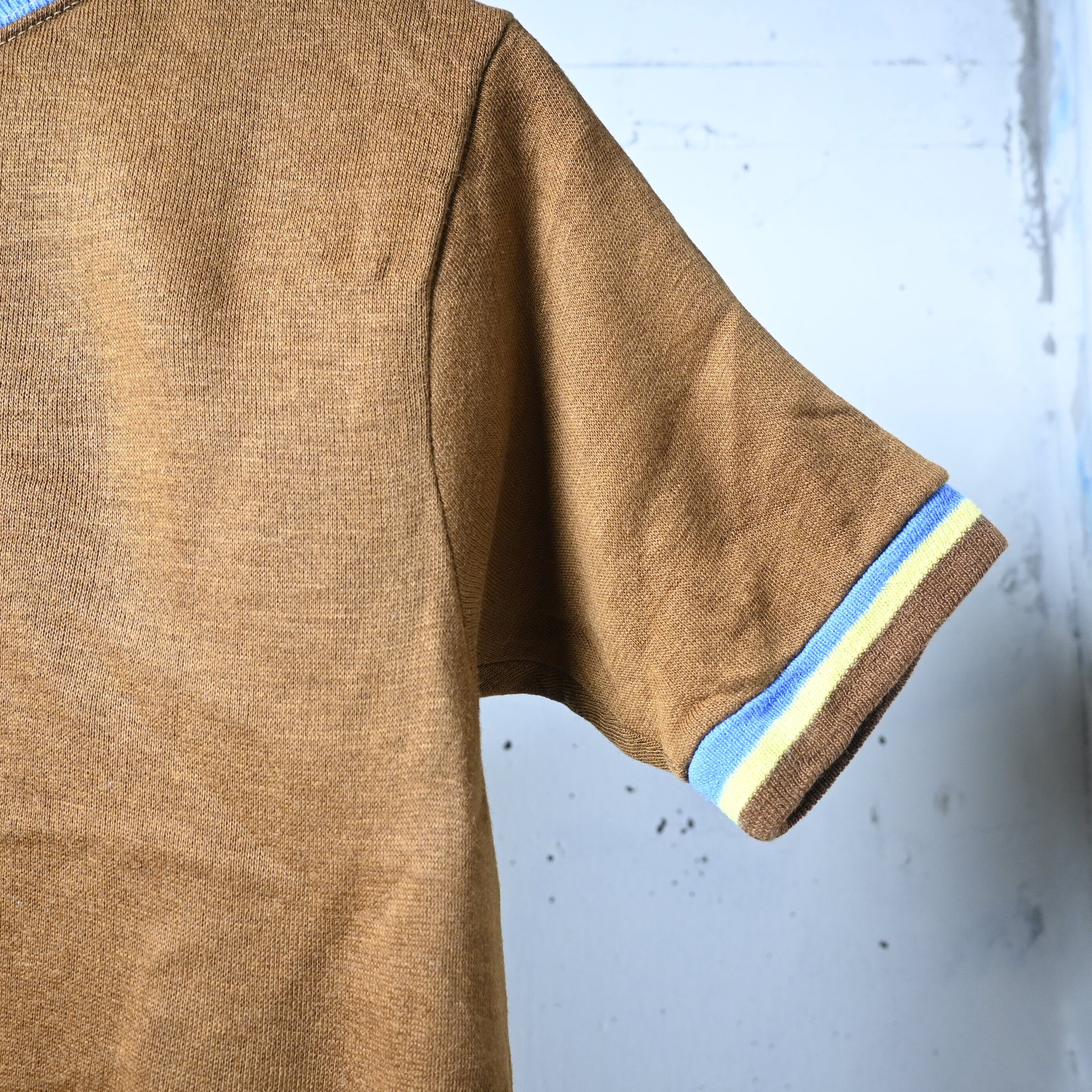 ボディは深みのあるブラウンカラーで、首元と袖口に入るブルー×イエローのライン入りリブが非常に印象的です。単色ボディに対してリブ配色が効いており、70年代らしいスポーティーな雰囲気がしっかり出ています。