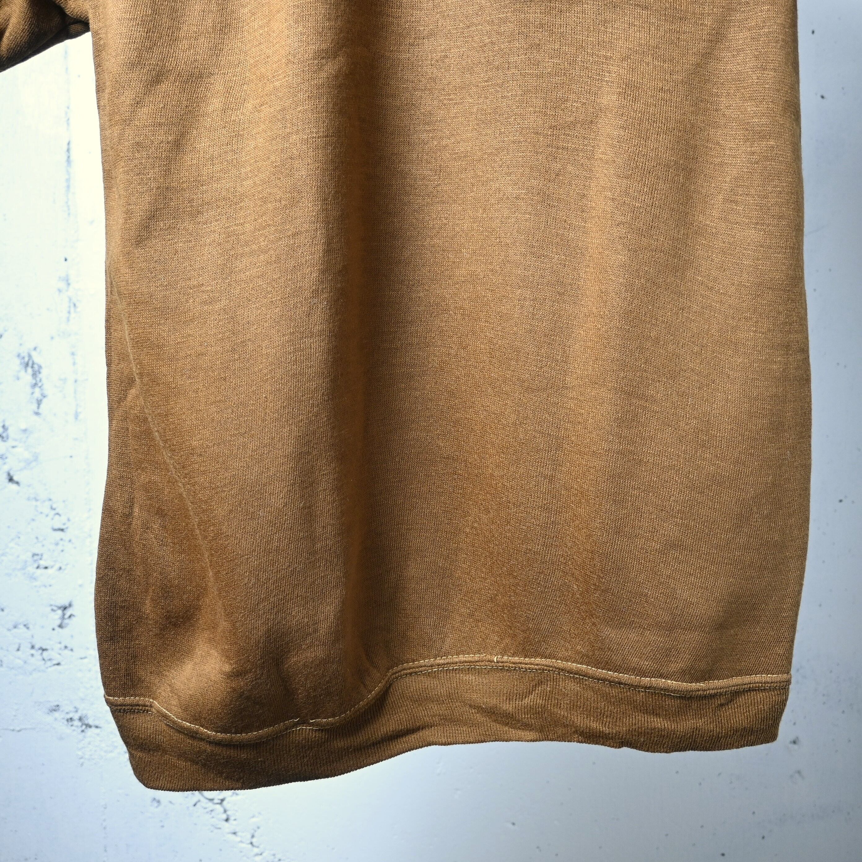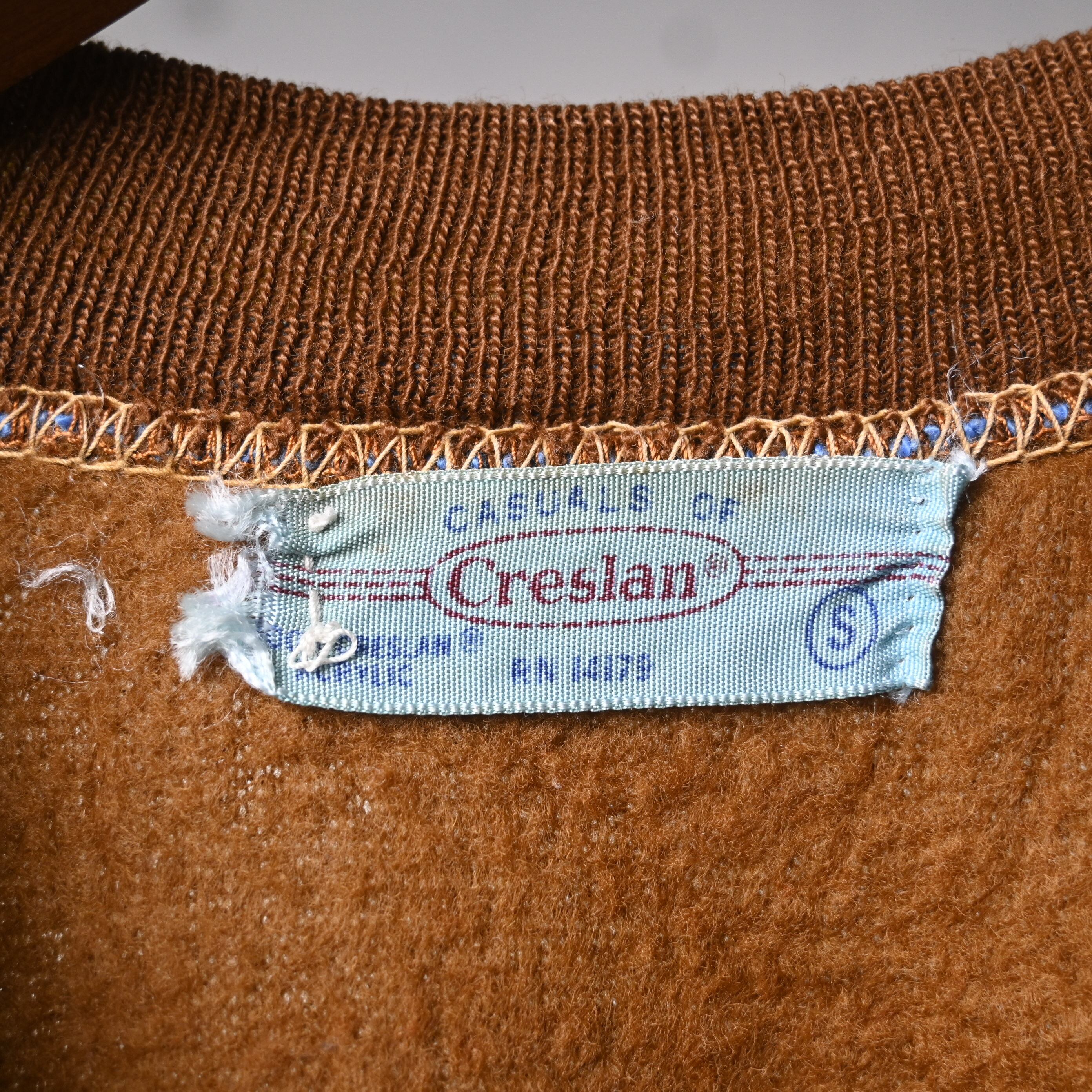 タグに記載のある Creslan は、DuPont が開発したアクリル繊維の名称で、当時は軽さ・保温性・発色の良さからスウェットやニット製品にも広く使われていました。こちらも独特のやわらかさと少し起毛した風合いがあり、コットンスウェットとは異なる軽い着心地が特徴です。