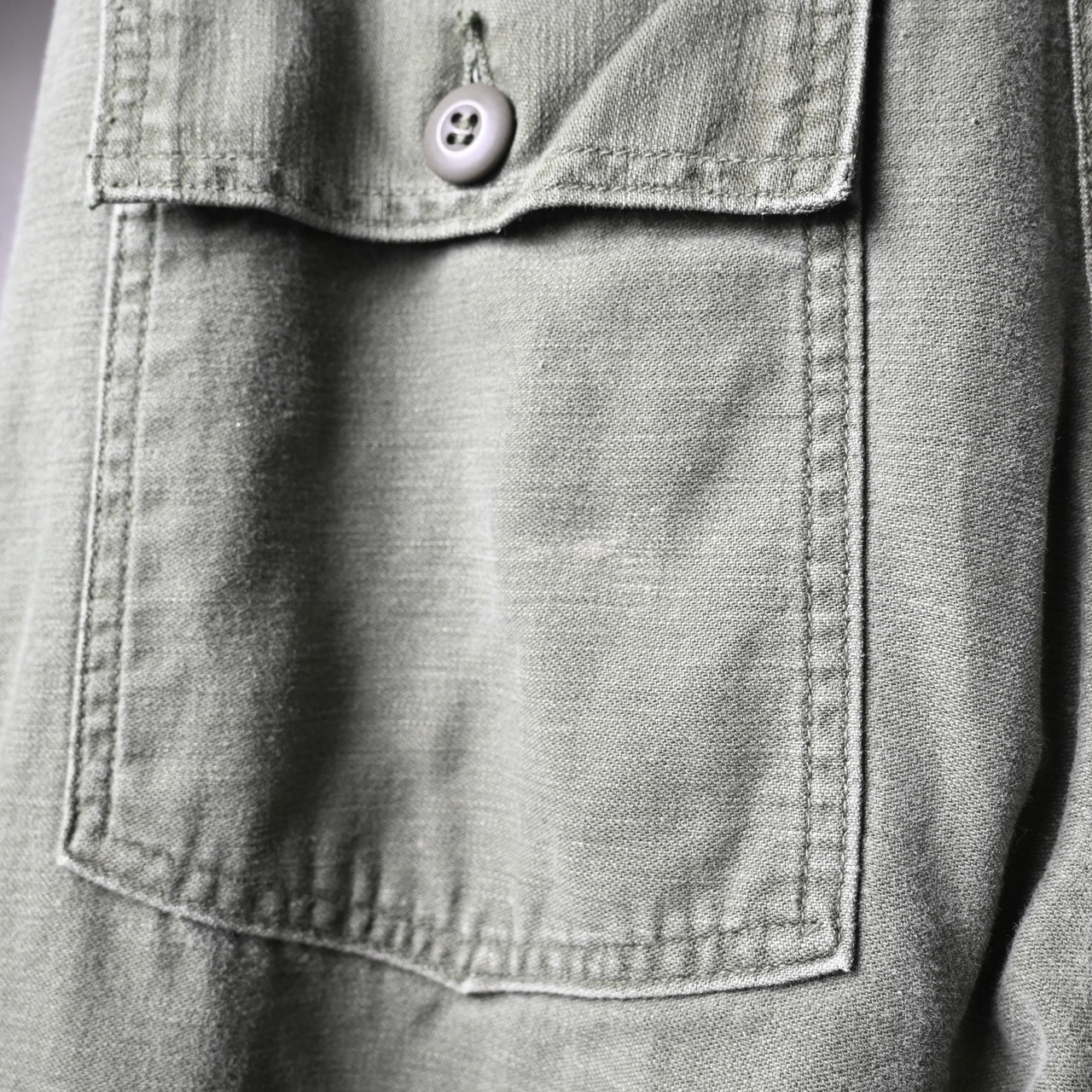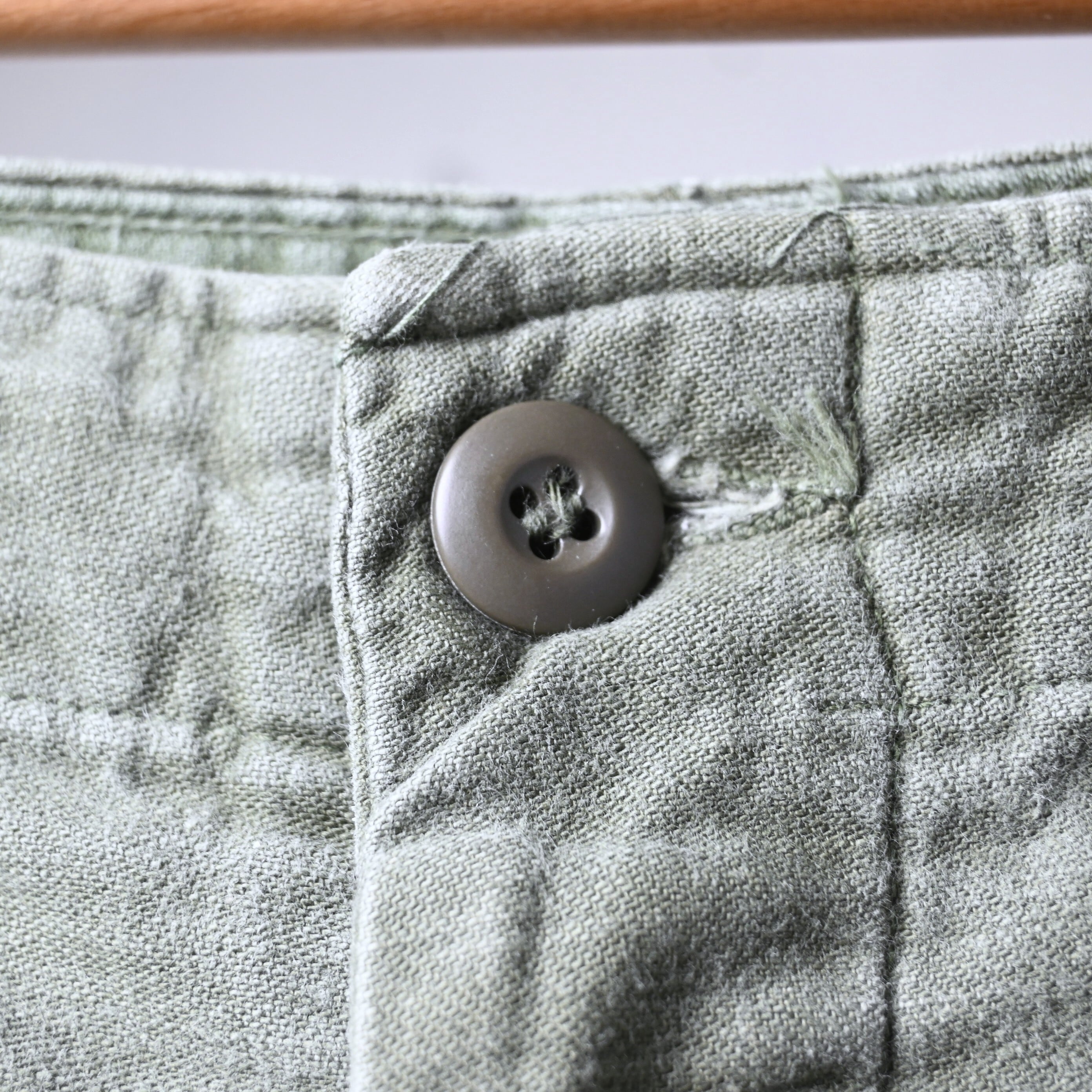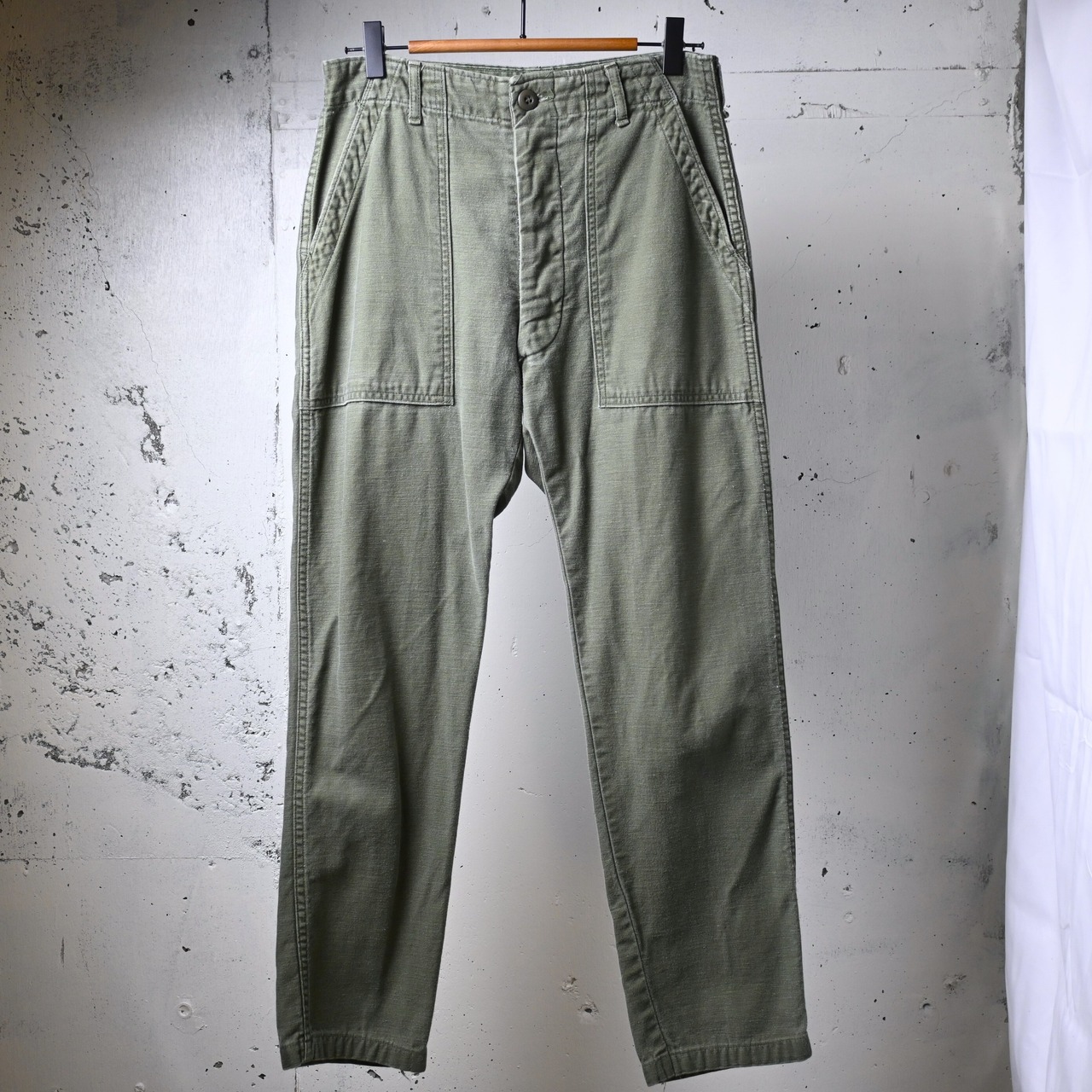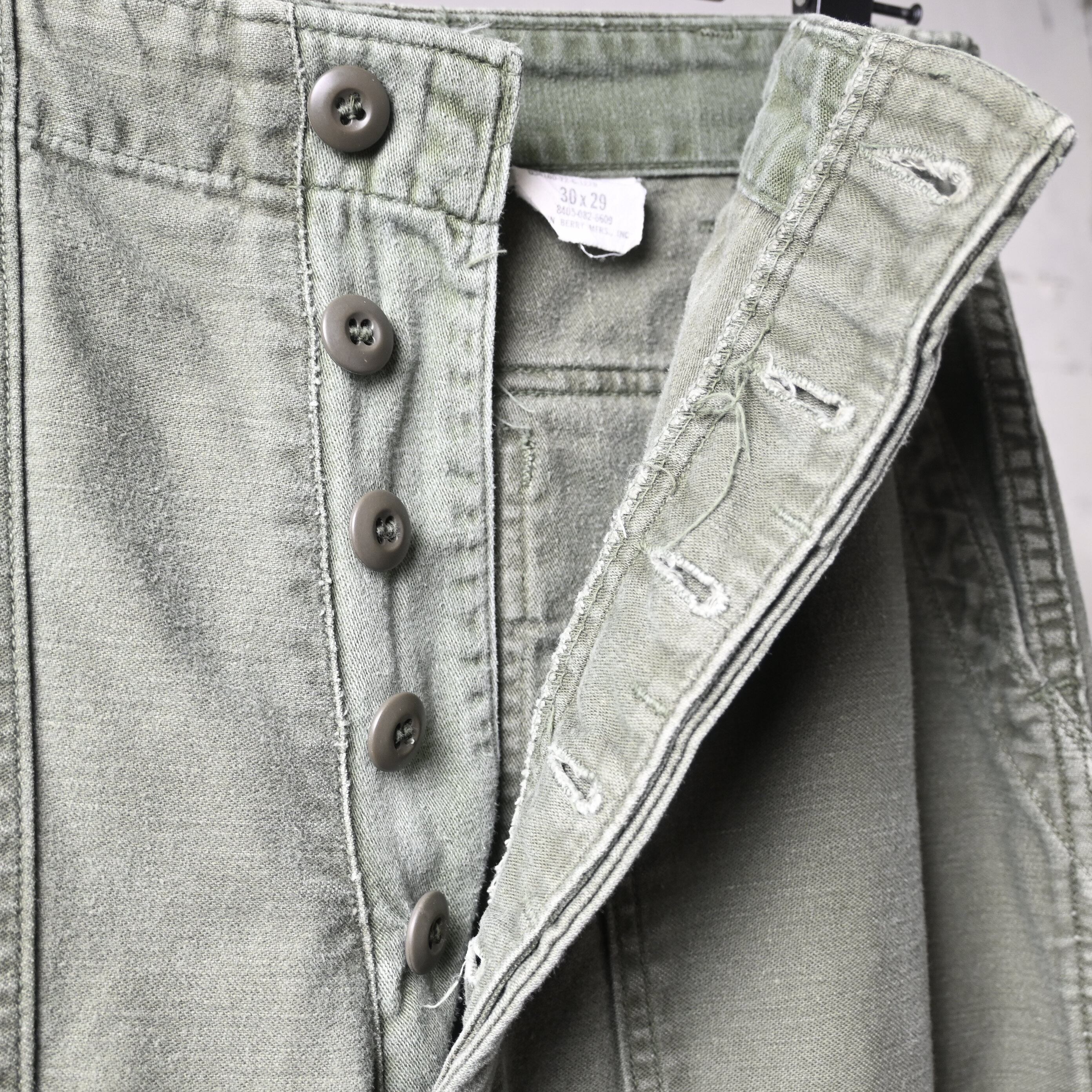 生地はコットンサテン。ややマットな光沢感と、穿き込むほどに現れる縦落ちやパッカリングが魅力で、ヴィンテージミリタリーらしい経年変化をしっかり楽しめる素材です。70年代個体は初期に比べて生地感がやや柔らかく、日常使いしやすいバランスも特徴です。
