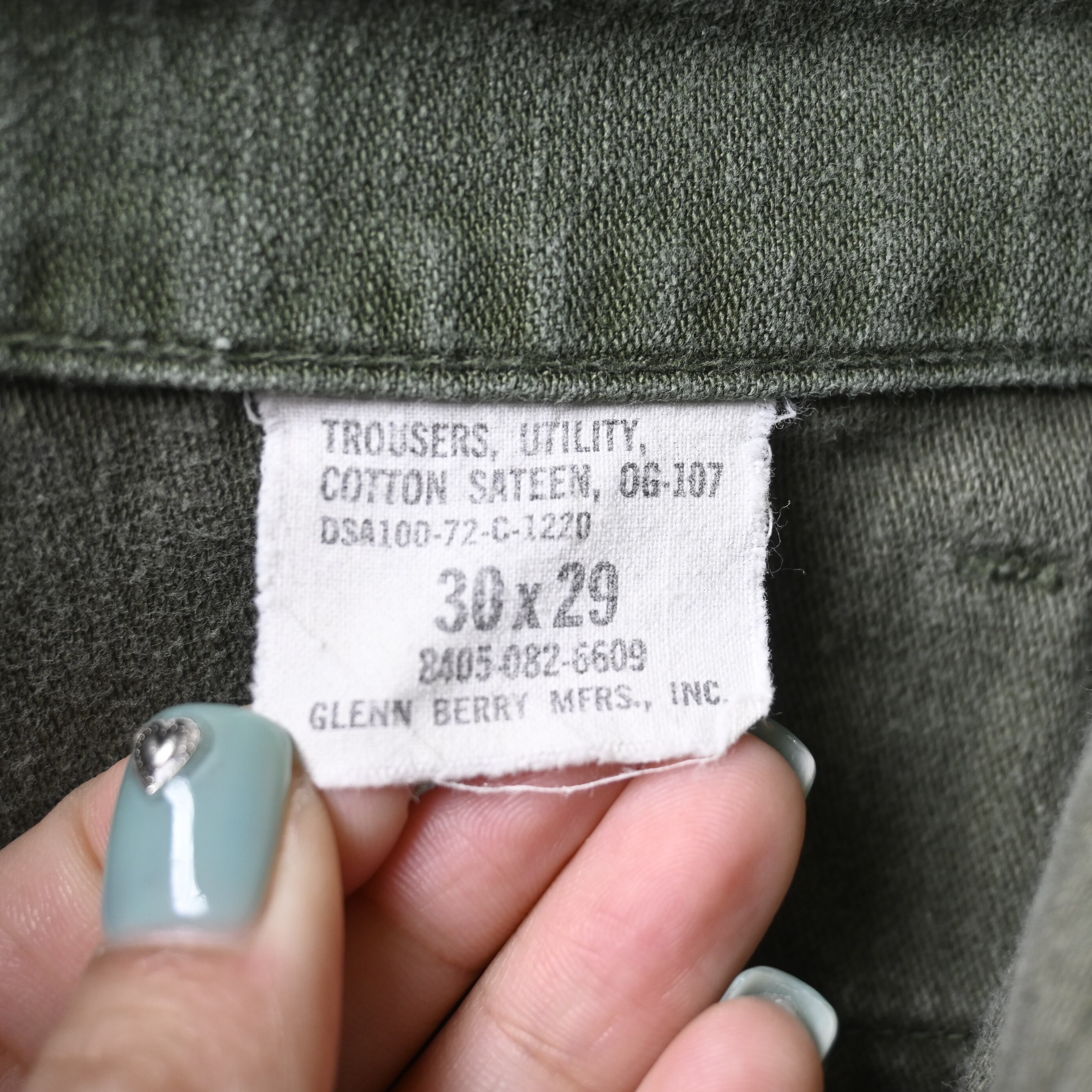 タグ表記は「TROUSERS, UTILITY, COTTON SATEEN, OG-107」、コントラクトナンバーは DSA100-72-C-1220、メーカーは GLENN BERRY MFRS., INC.。1972年会計の個体で、ベイカーパンツの完成形として評価の高い後期仕様にあたります。