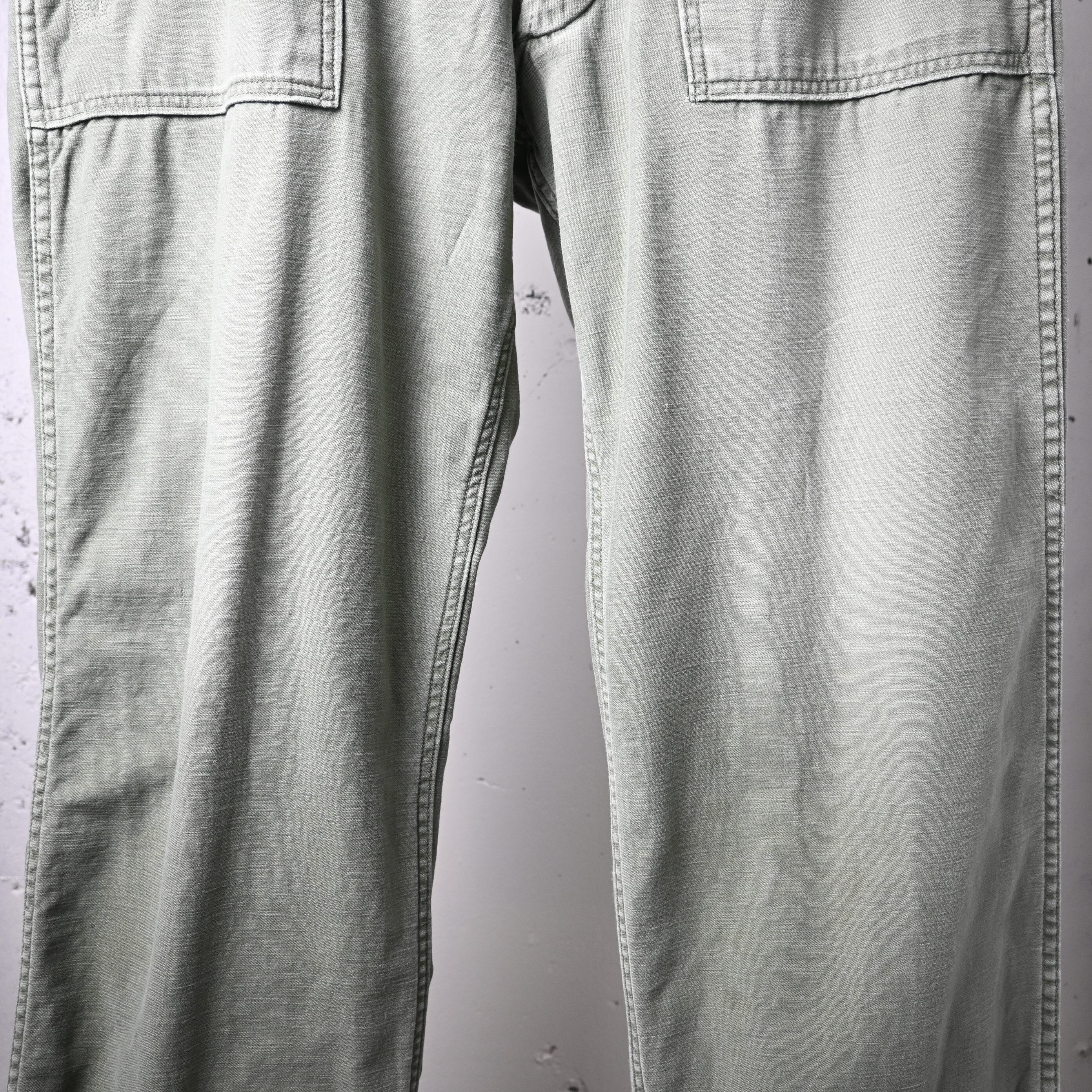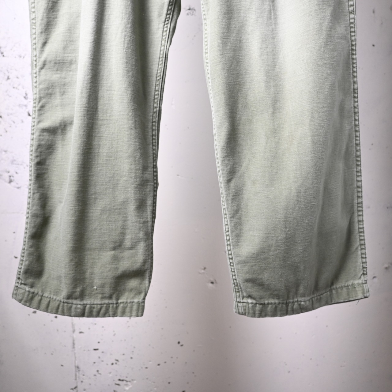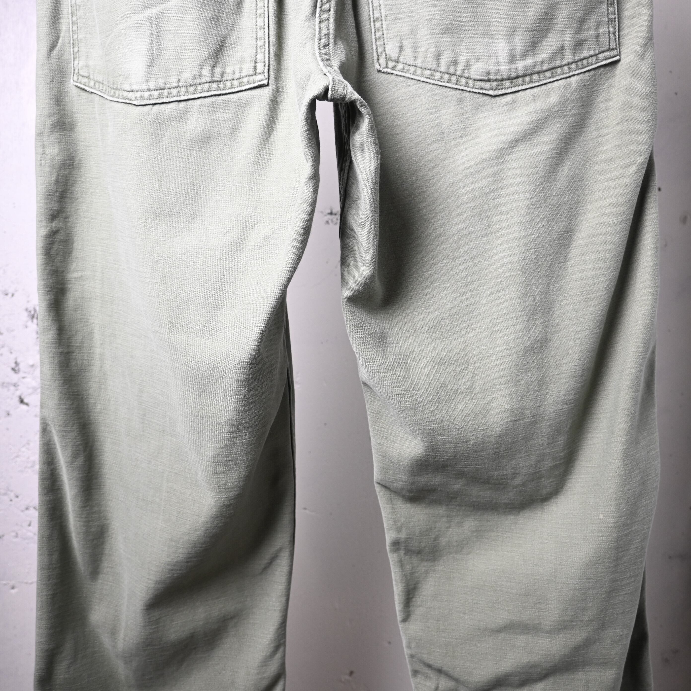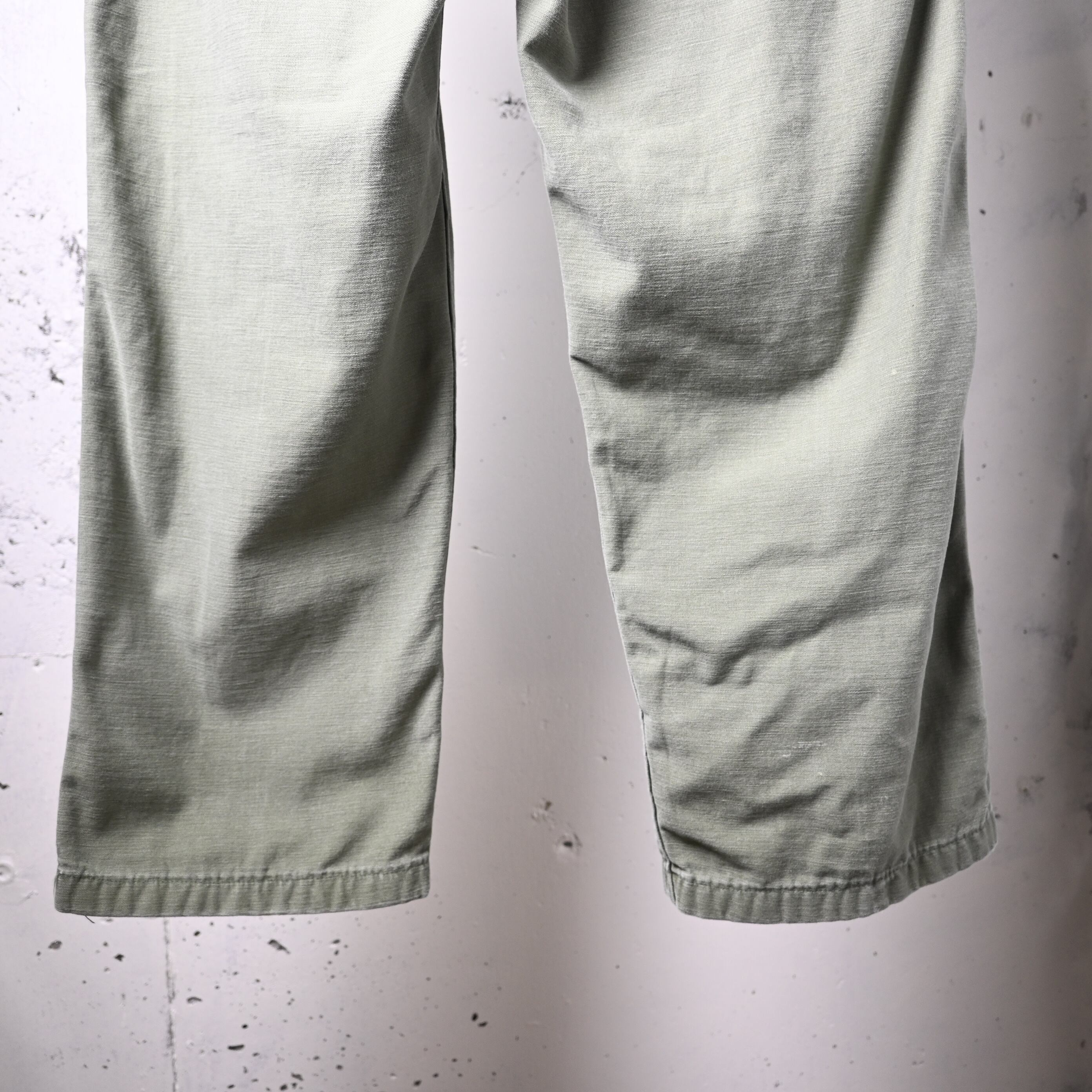 1950年代から長く米軍で採用されたOG-107は、アメリカ軍ユーティリティウェアを代表する定番パンツで、ベイカーパンツの愛称でも広く知られる一本です。こちらはコットンサテン素材を使用したヴィンテージらしい個体で、洗い込みによって生まれたやわらかな風合いと、淡くフェードしたオリーブカラーが非常に良い雰囲気です。