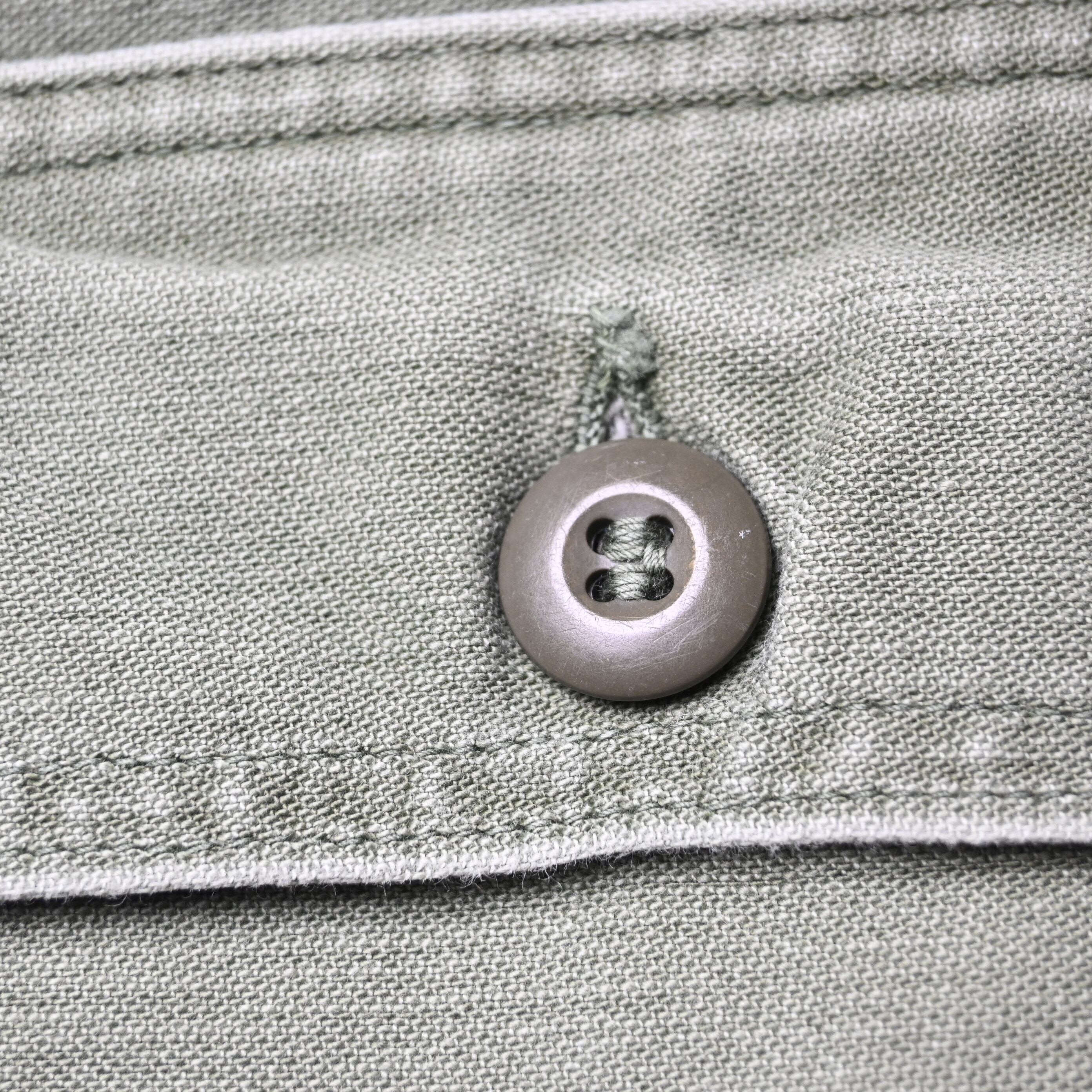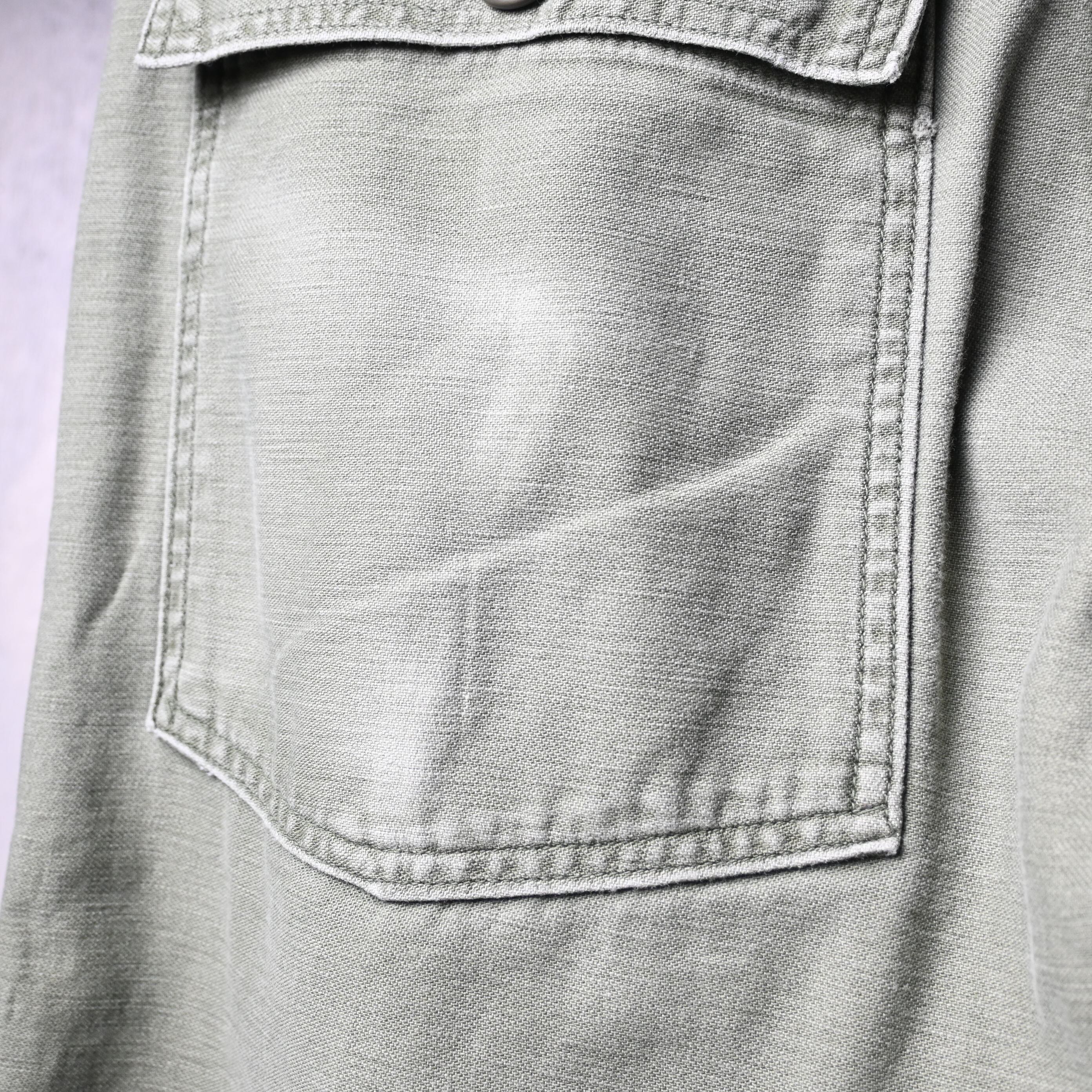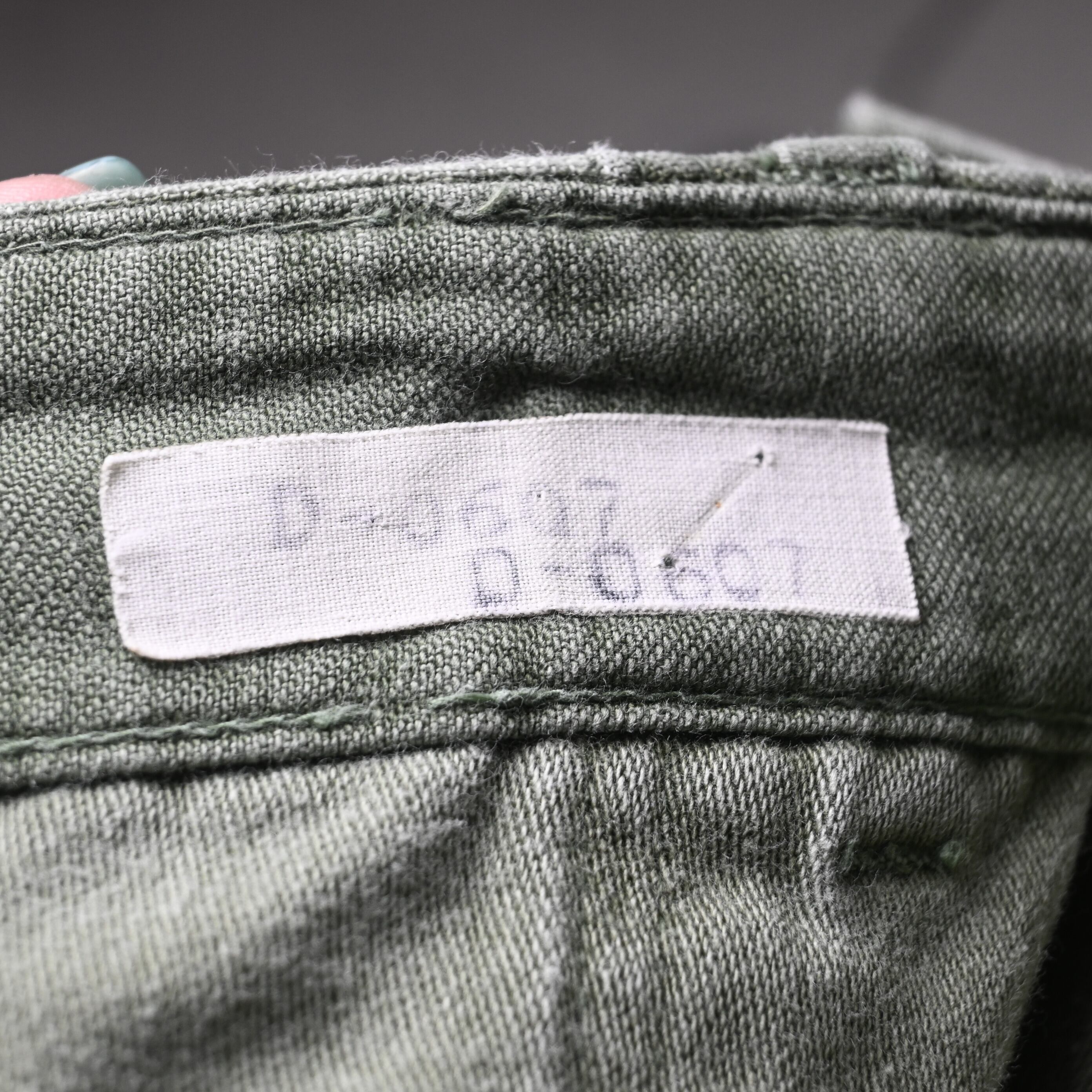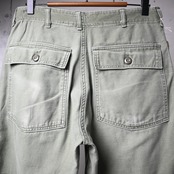 1950年代から長く米軍で採用されたOG-107は、アメリカ軍ユーティリティウェアを代表する定番パンツで、ベイカーパンツの愛称でも広く知られる一本です。こちらはコットンサテン素材を使用したヴィンテージらしい個体で、洗い込みによって生まれたやわらかな風合いと、淡くフェードしたオリーブカラーが非常に良い雰囲気です。