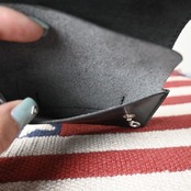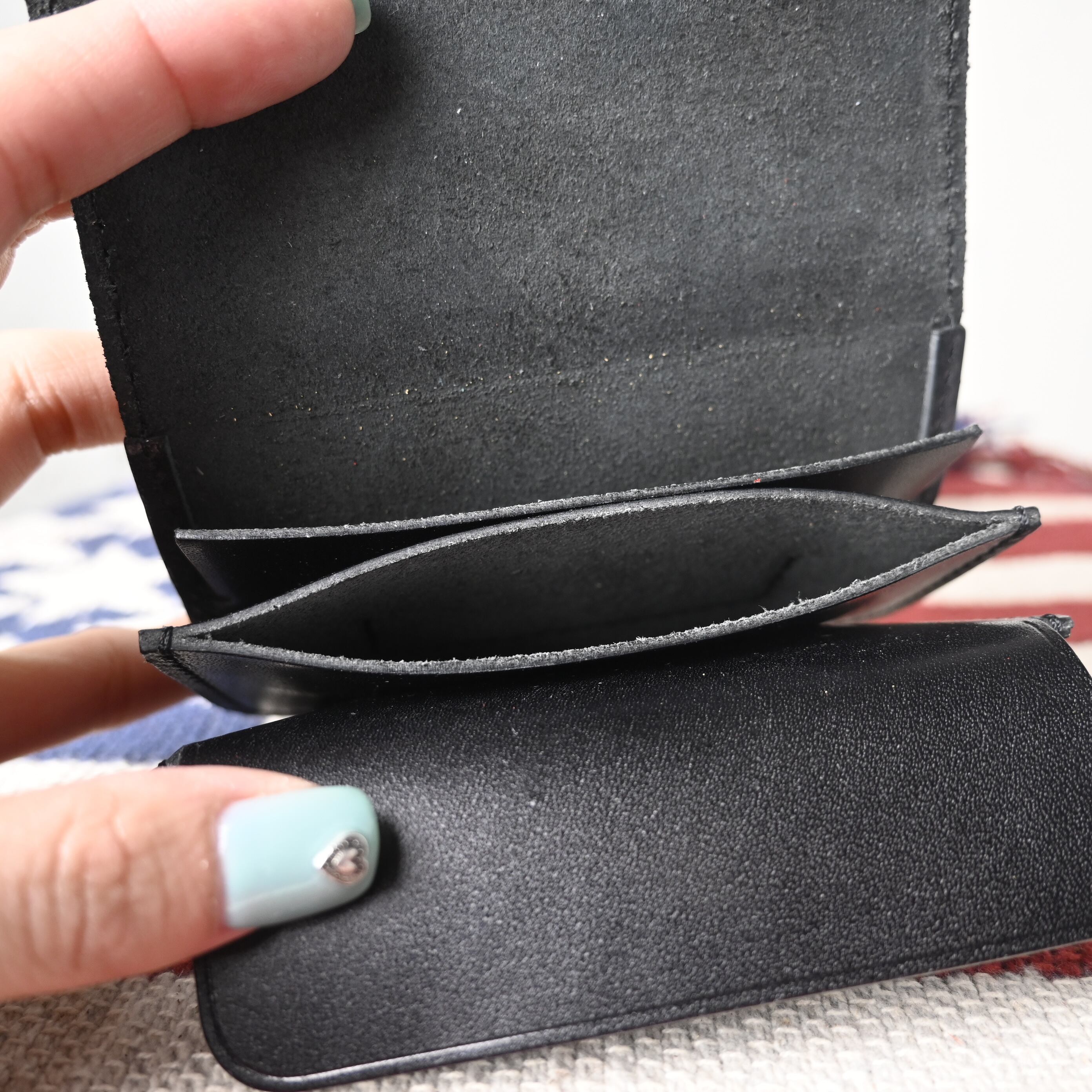 内部は2層構造で、札12枚程度・カード10枚程度を収納可能。紙幣、カード、領収書などを整理しやすく、コンパクトながら十分な収納力を備えています。スナップ開閉で使いやすく、下部ハトメにはウォレットチェーンなども取り付け可能です。