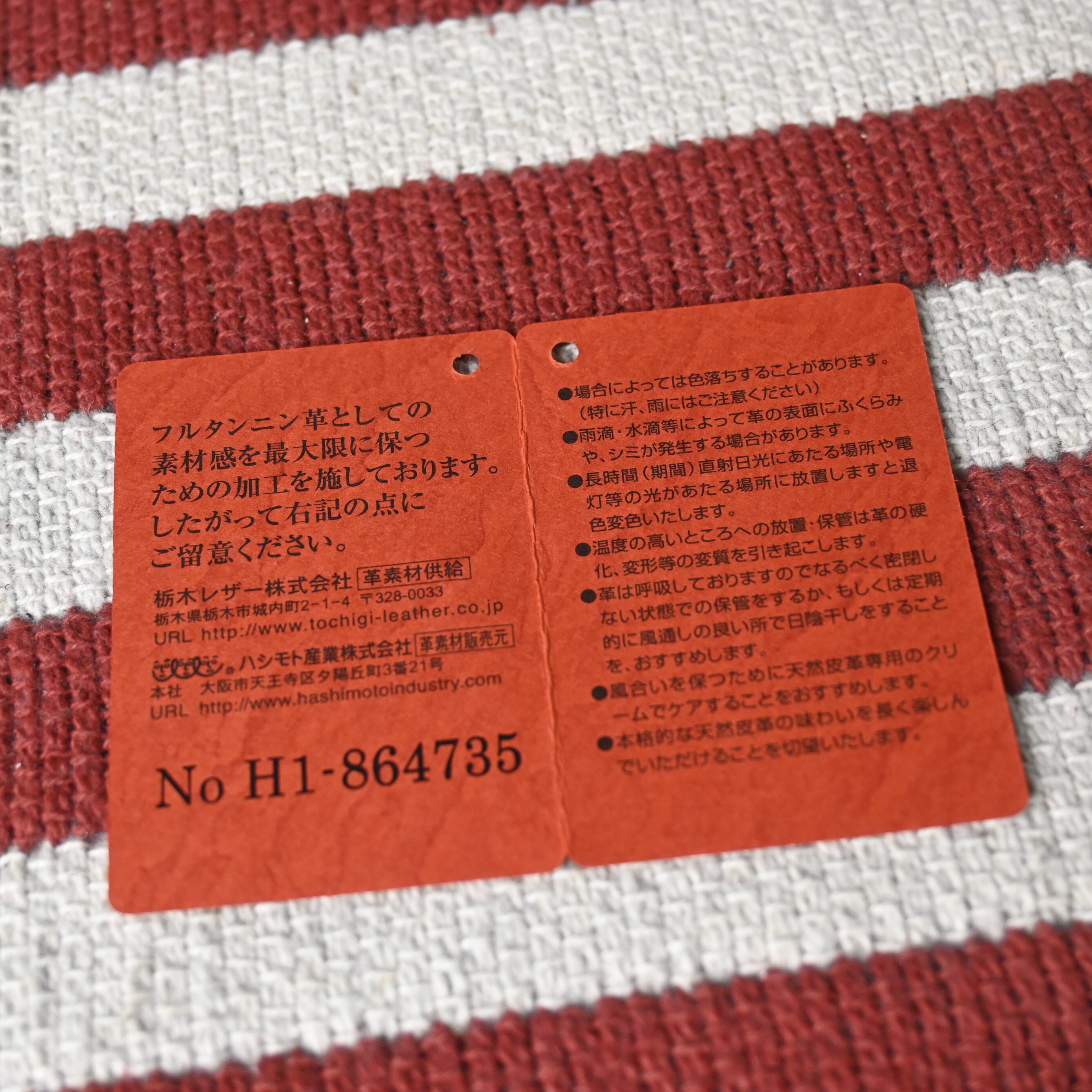 本体には国内タンナーとして高い評価を受ける栃木レザーの牛革を採用。しっかりとしたコシと滑らかな質感を持ち、使い込むほどに自然な艶が増し、革本来の深みある表情へと変化していきます。