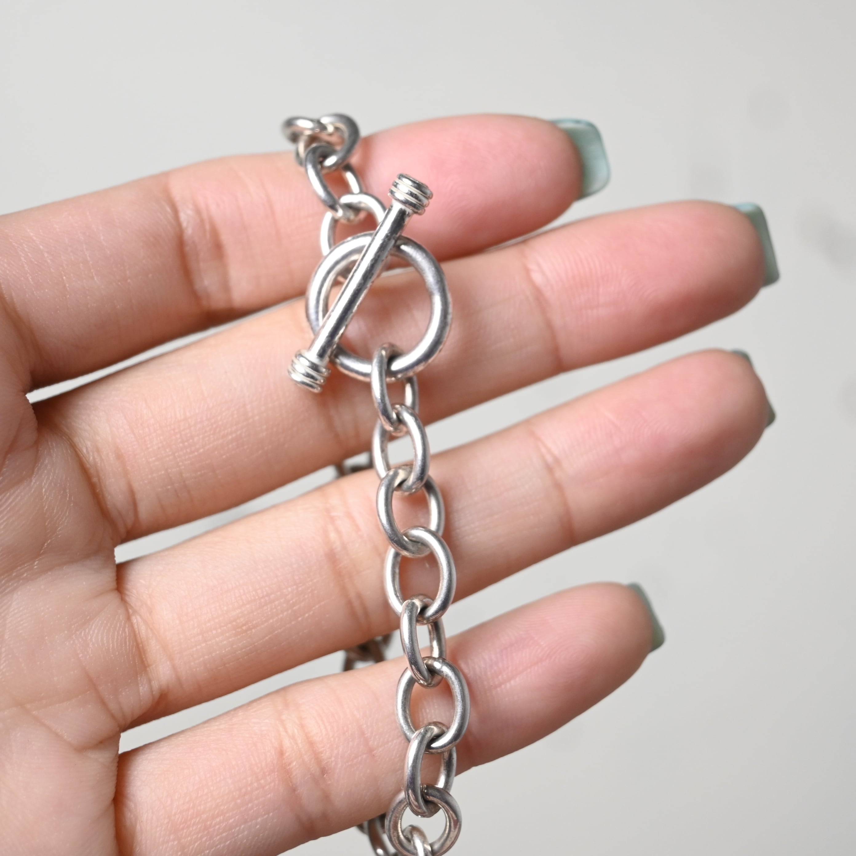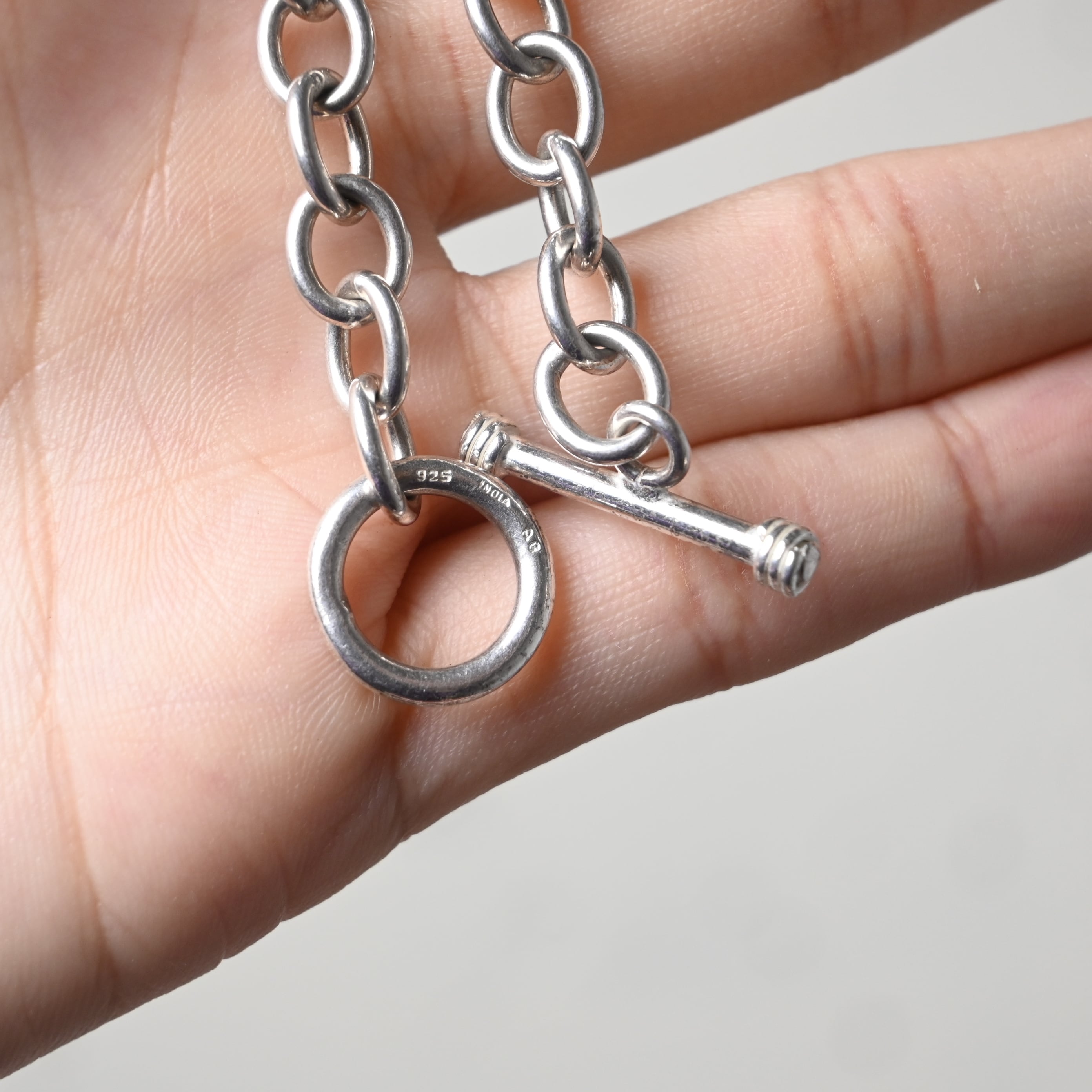 程よいボリューム感のあるチェーンとトグル留め具が特徴の、スターリングシルバー925製ブレスレットです。
