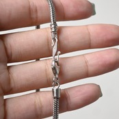 表面は細かな編み込みのように連続した滑らかな構造になっており、角度によって自然な光沢が生まれる上品な仕上がりです。余計な装飾を省いたシンプルなデザインながら、チェーンそのものの質感が際立ち、手元にさりげない存在感を与えてくれます。