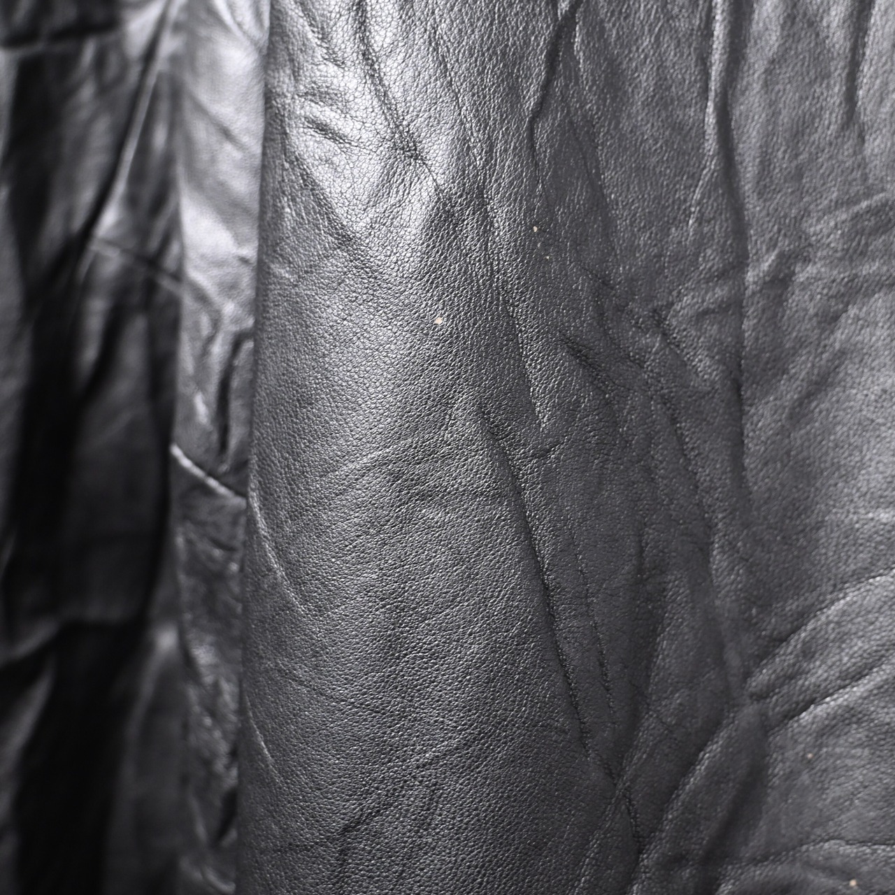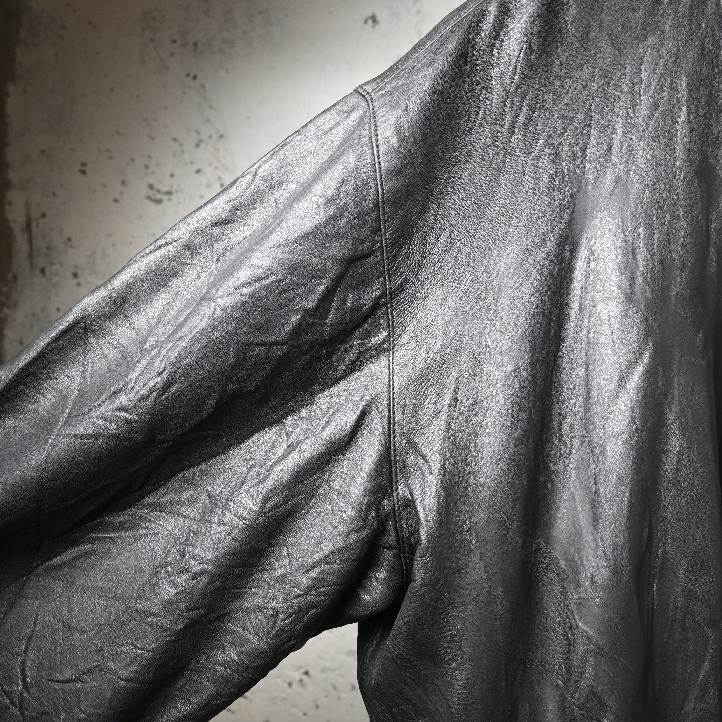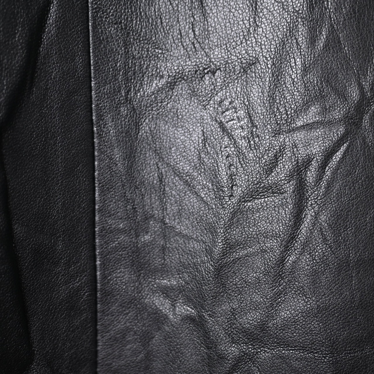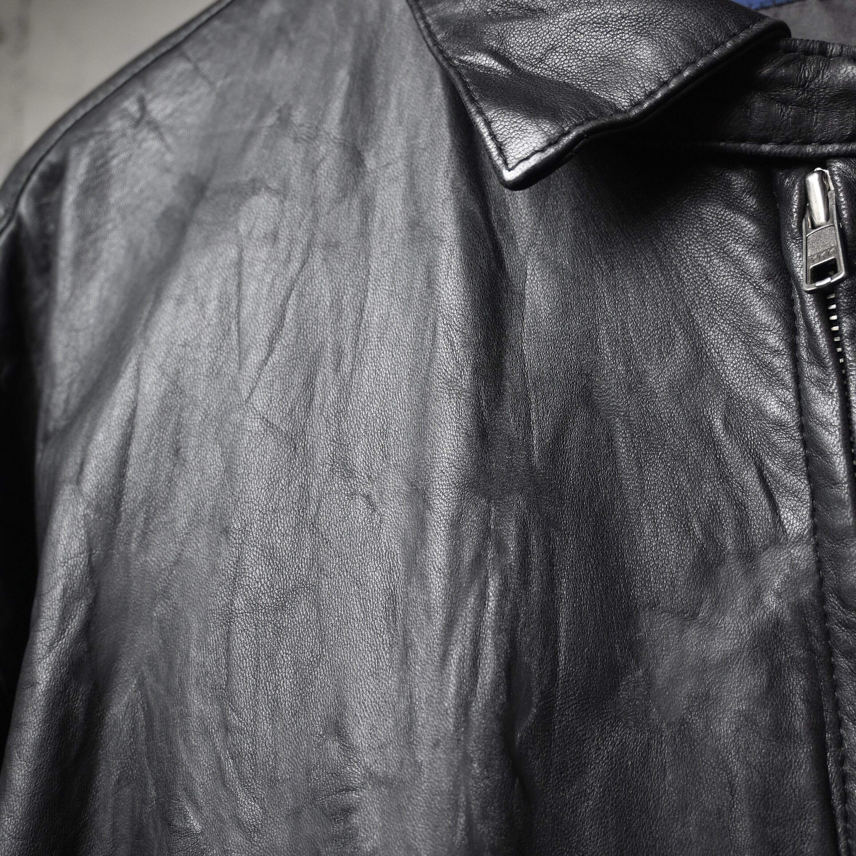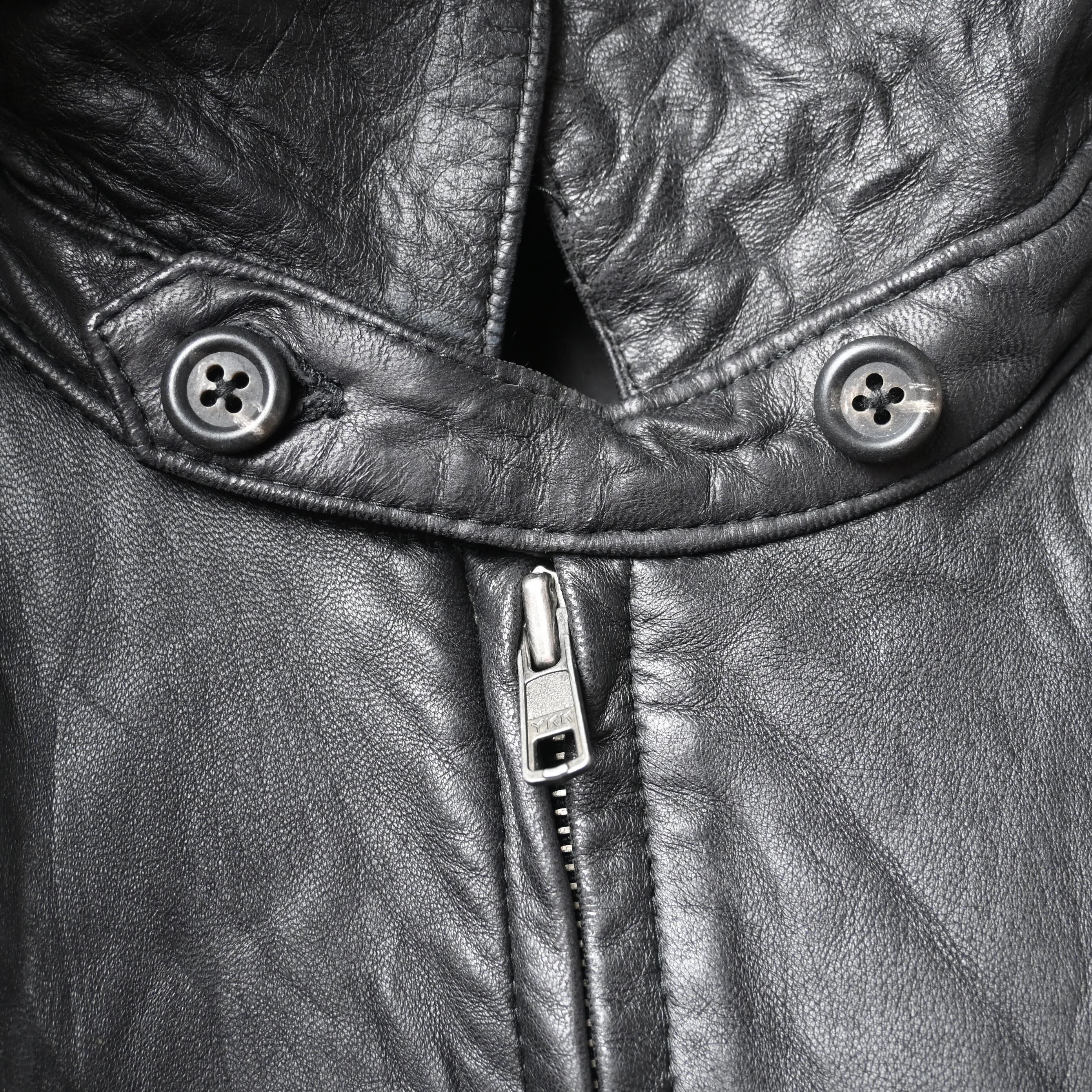 全体に着用に伴うシワやレザー特有の表情があります。右肩付近にこすれたようなダメージあり。背面にごく小さな汚れ、跡がありますが大きなダメージはなく、年代を考慮すると良好なコンディションです。