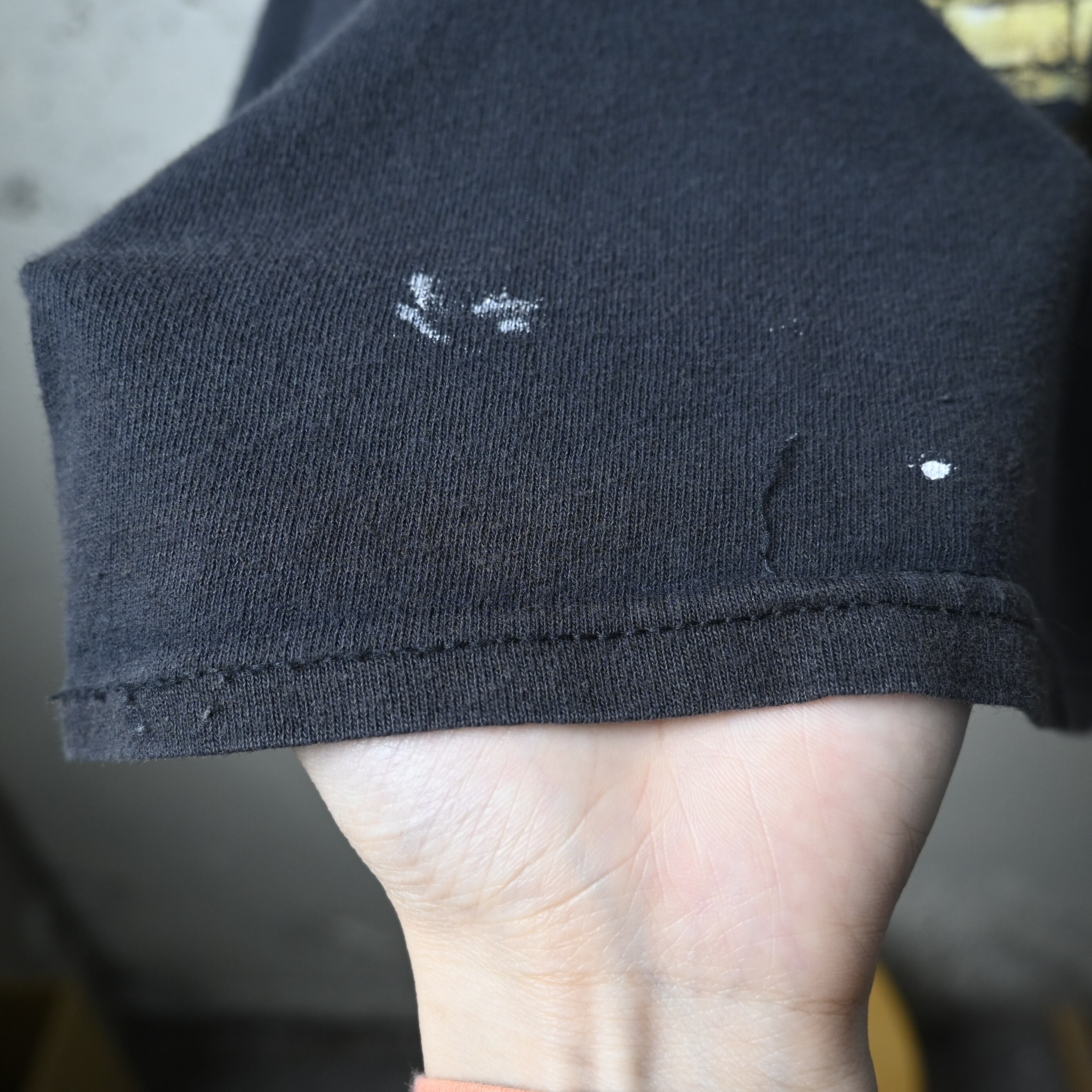 フロントにはペンキ跡のような白い付着、袖にも小さな付着がありますが、古着らしい一点ものの表情として楽しめるコンディションです。裾には軽いステッチ補修跡があります。