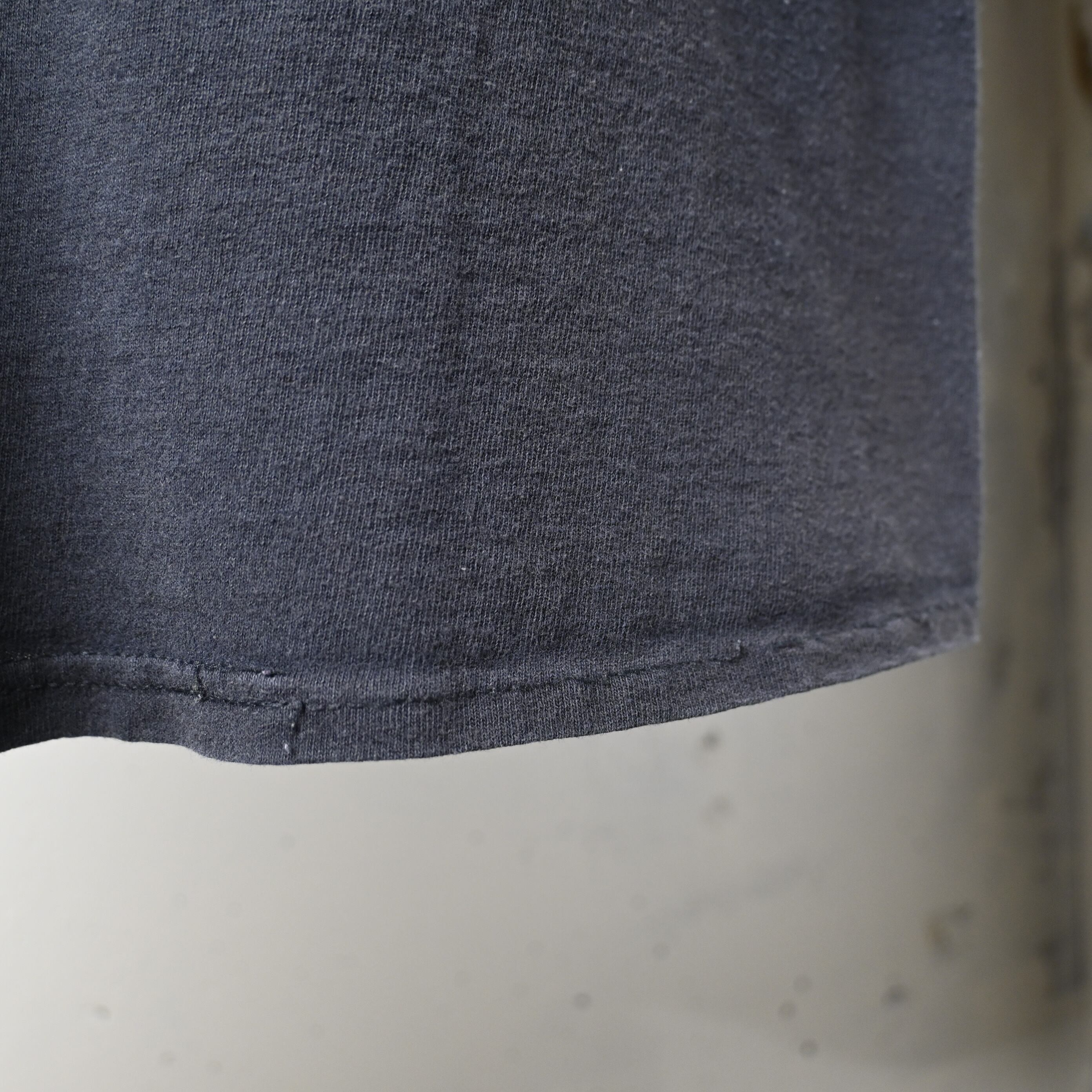 フロント下部・袖に白い付着汚れあり。裾ステッチに軽い補修跡があります。全体に着用感と軽いフェードがありますが、着用に支障のあるダメージはありません。