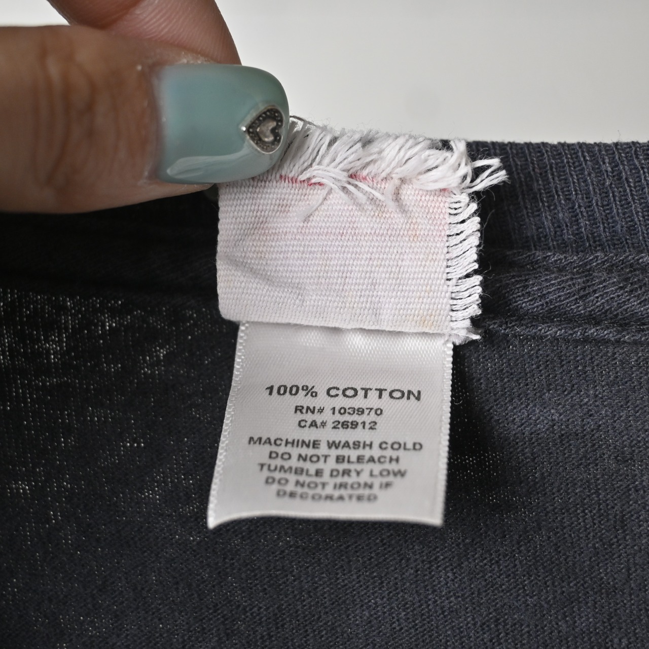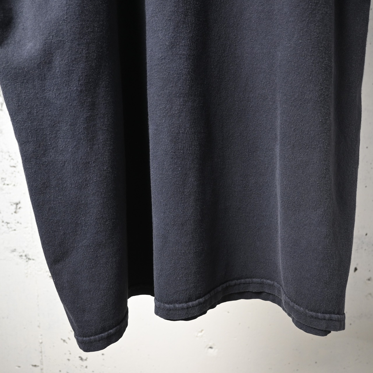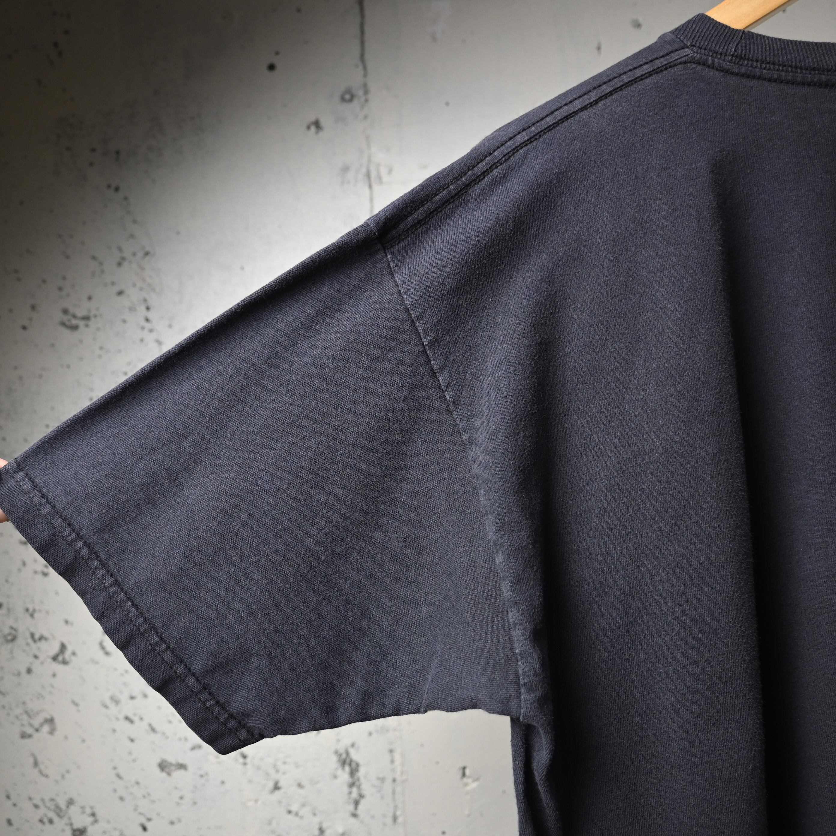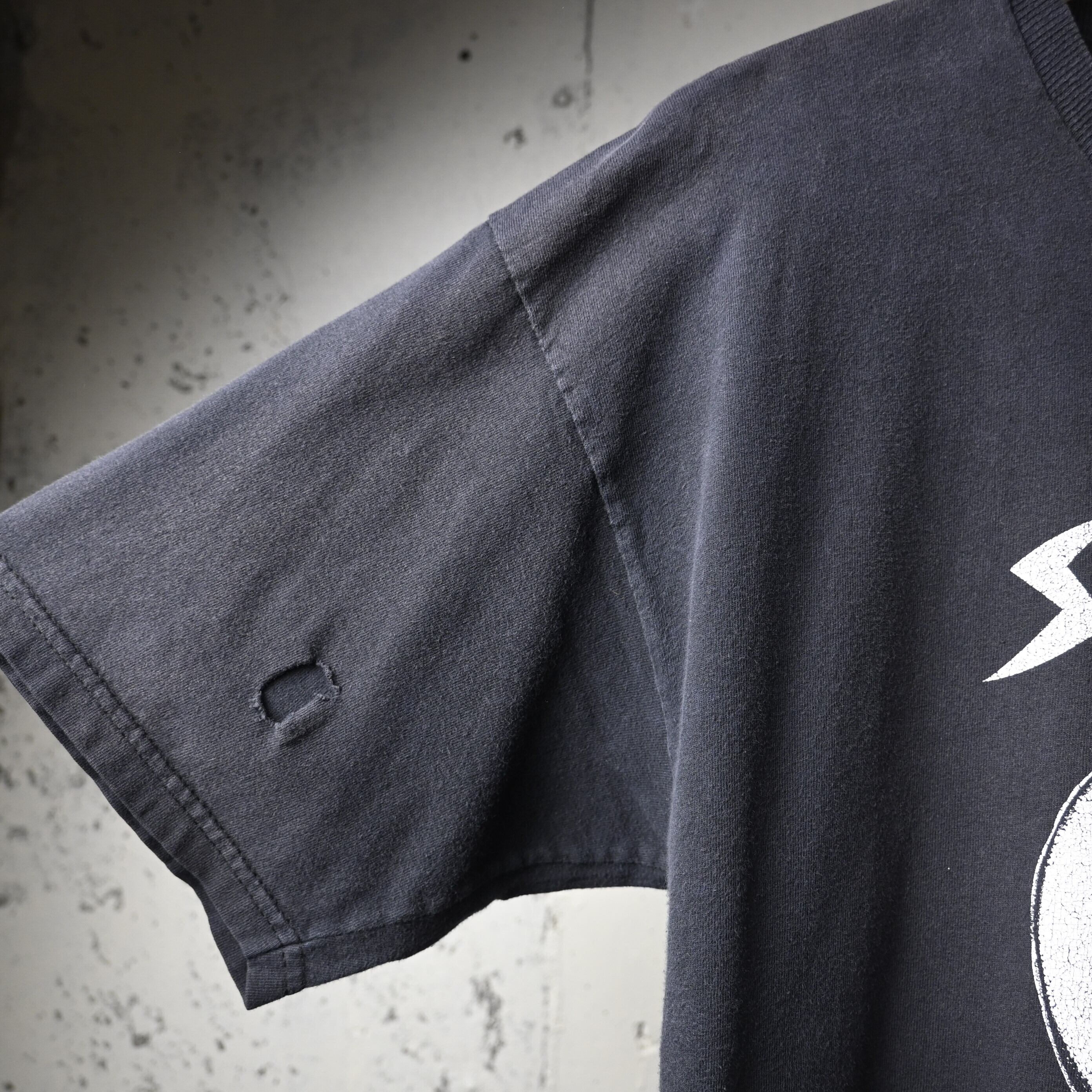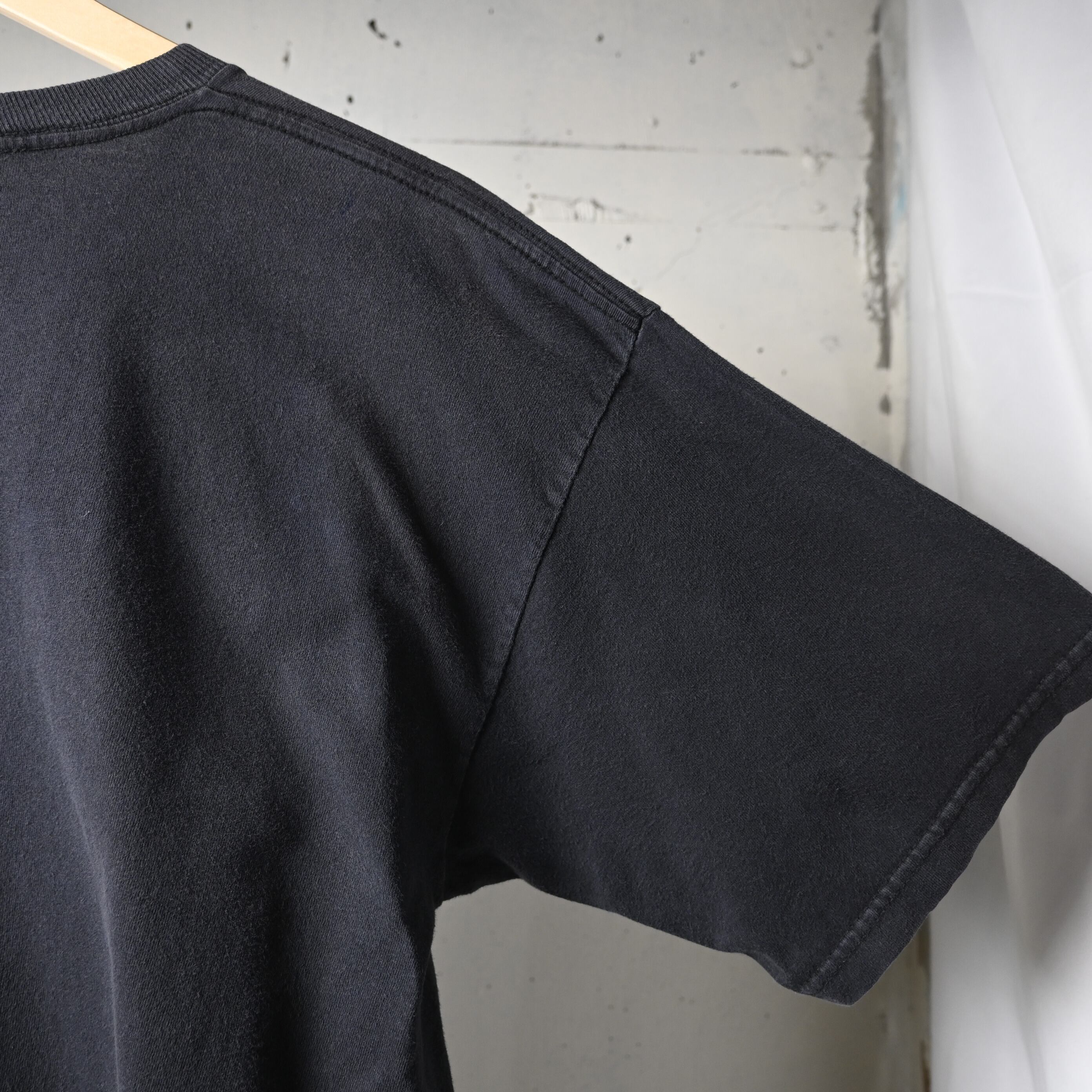 全体に着用感、軽いフェードがあります。右袖部分に小穴あり。タグ上部にほつれがありますが、着用に支障のある大きなダメージはありません。