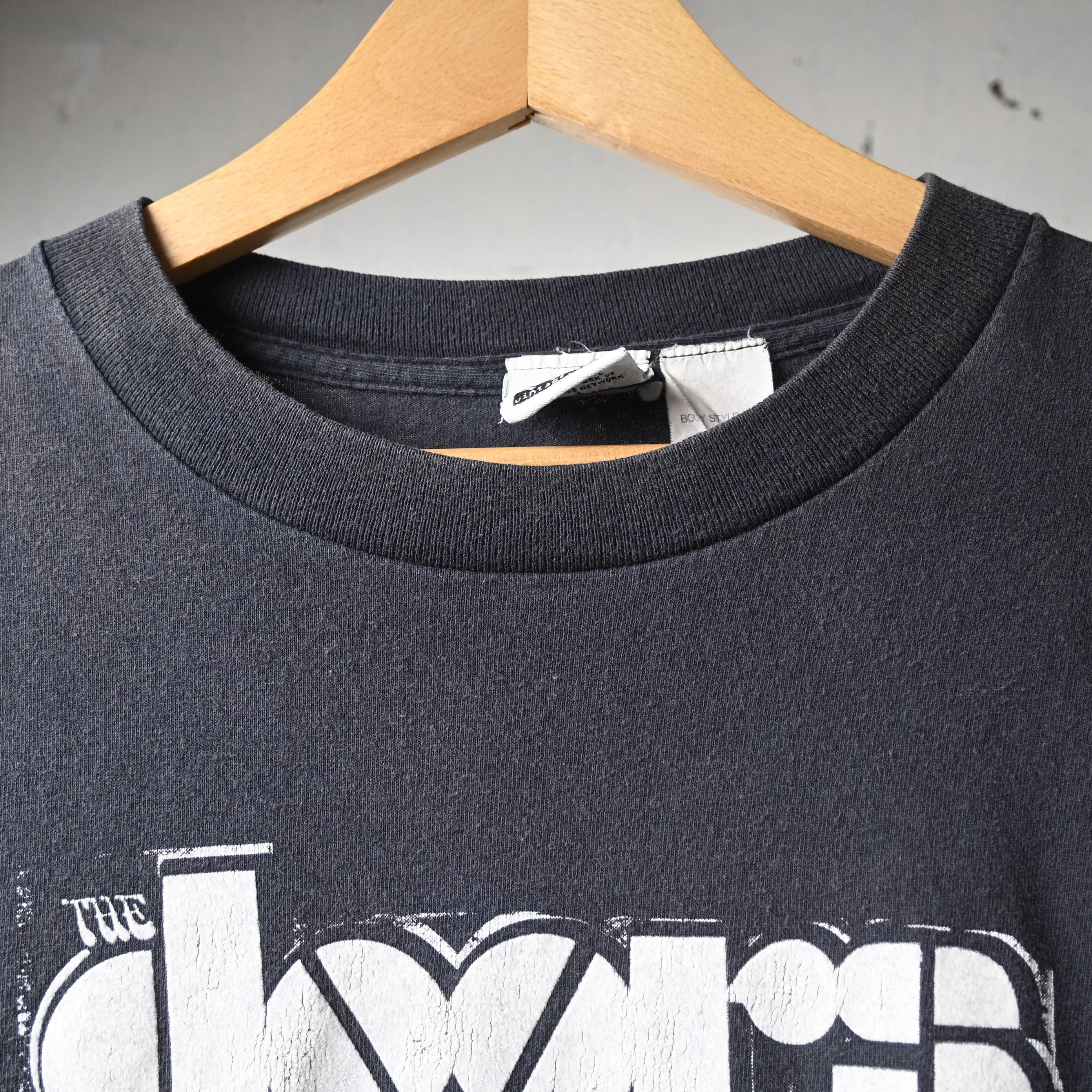 プリントはやや立体感のあるフロッキー仕様で、擦れたような加工が入ることで、着込まれたヴィンテージTシャツのような雰囲気に仕上がっています。ブラックボディに白ロゴのみというミニマルな構成ながら、バンドの存在感がしっかり伝わる一枚です。