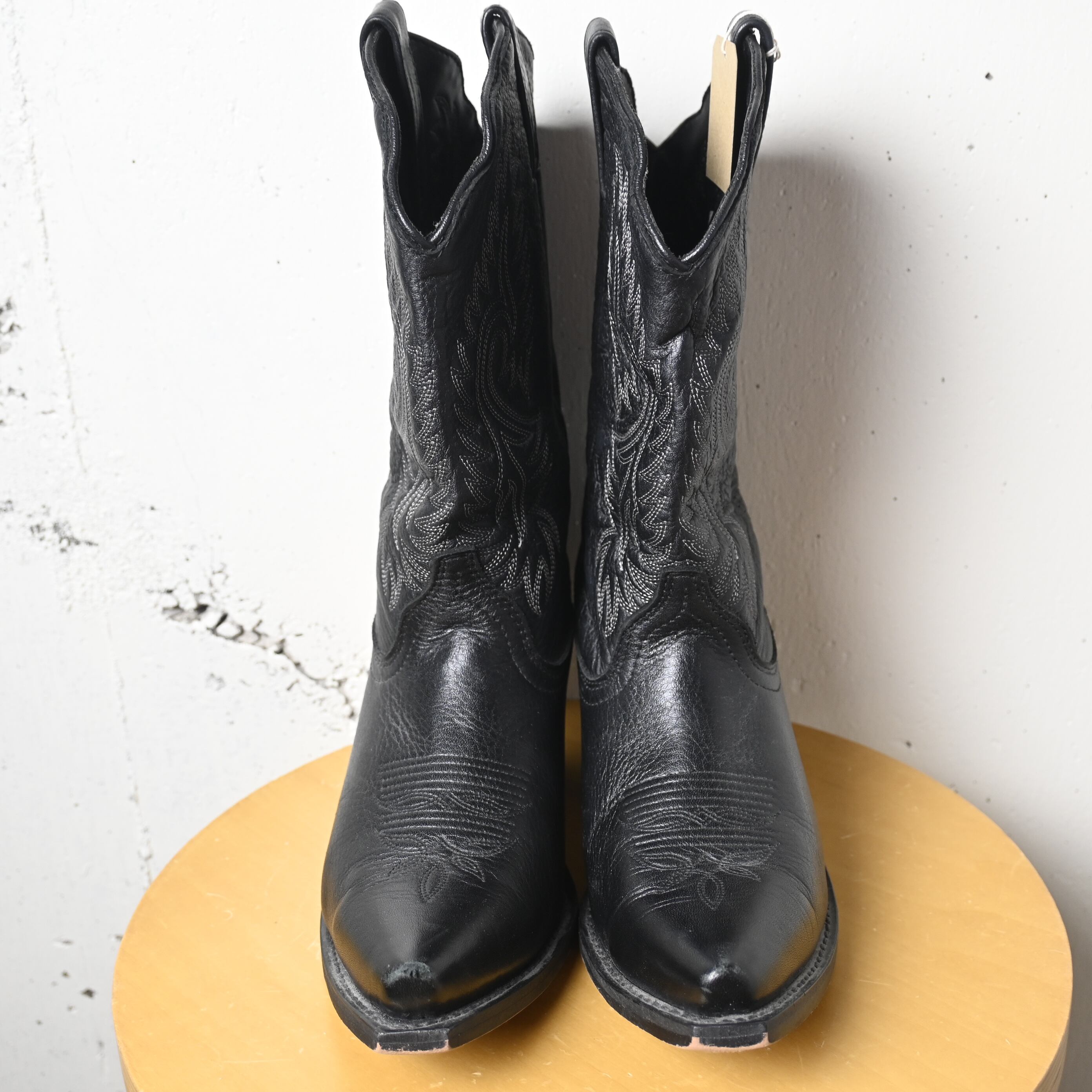 無駄のないブラックレザーに、シャフト部分の繊細な刺繍がさりげなく映える一足。派手すぎないデザインながら、ウエスタンらしい空気感はしっかりと感じられるバランスの良い仕上がりです。