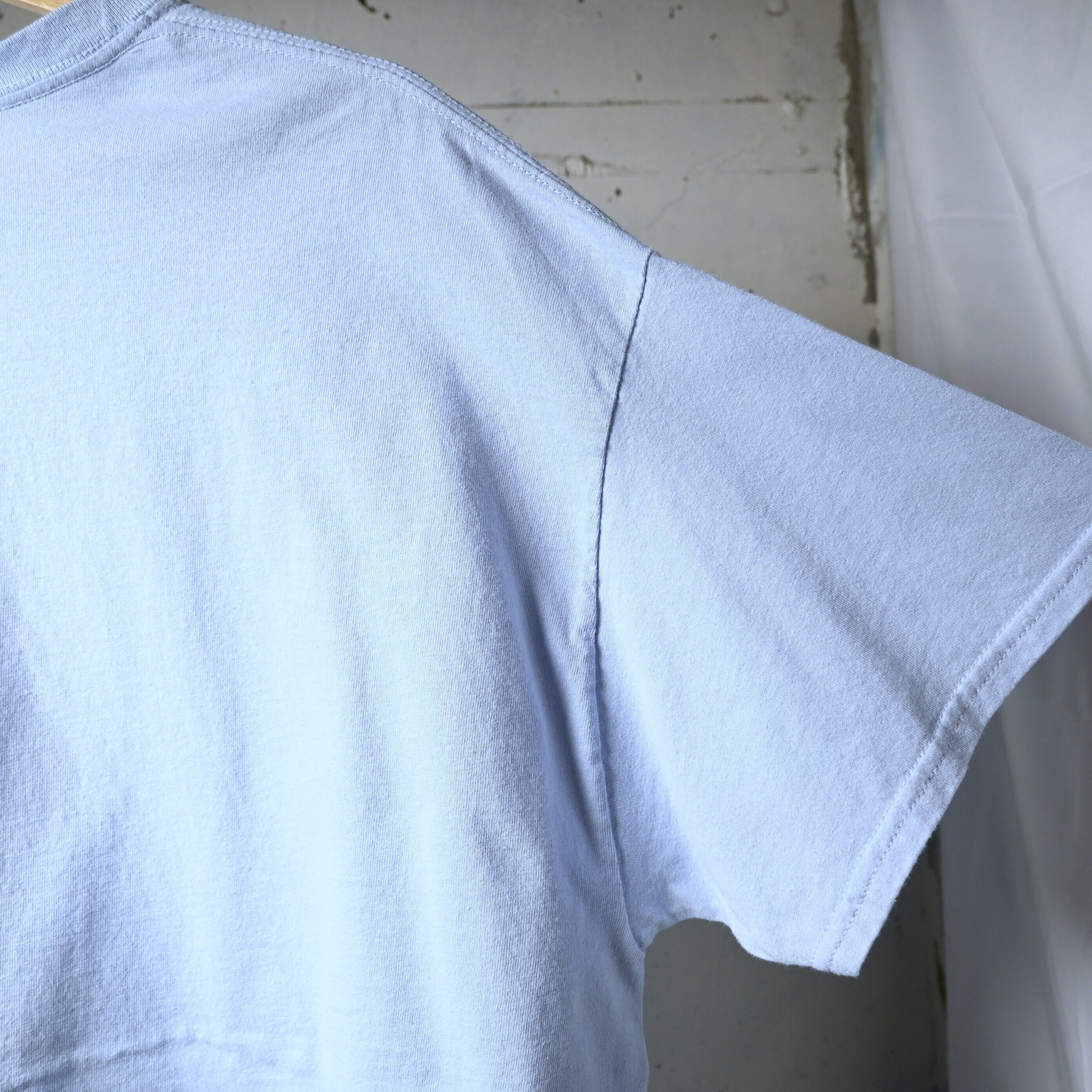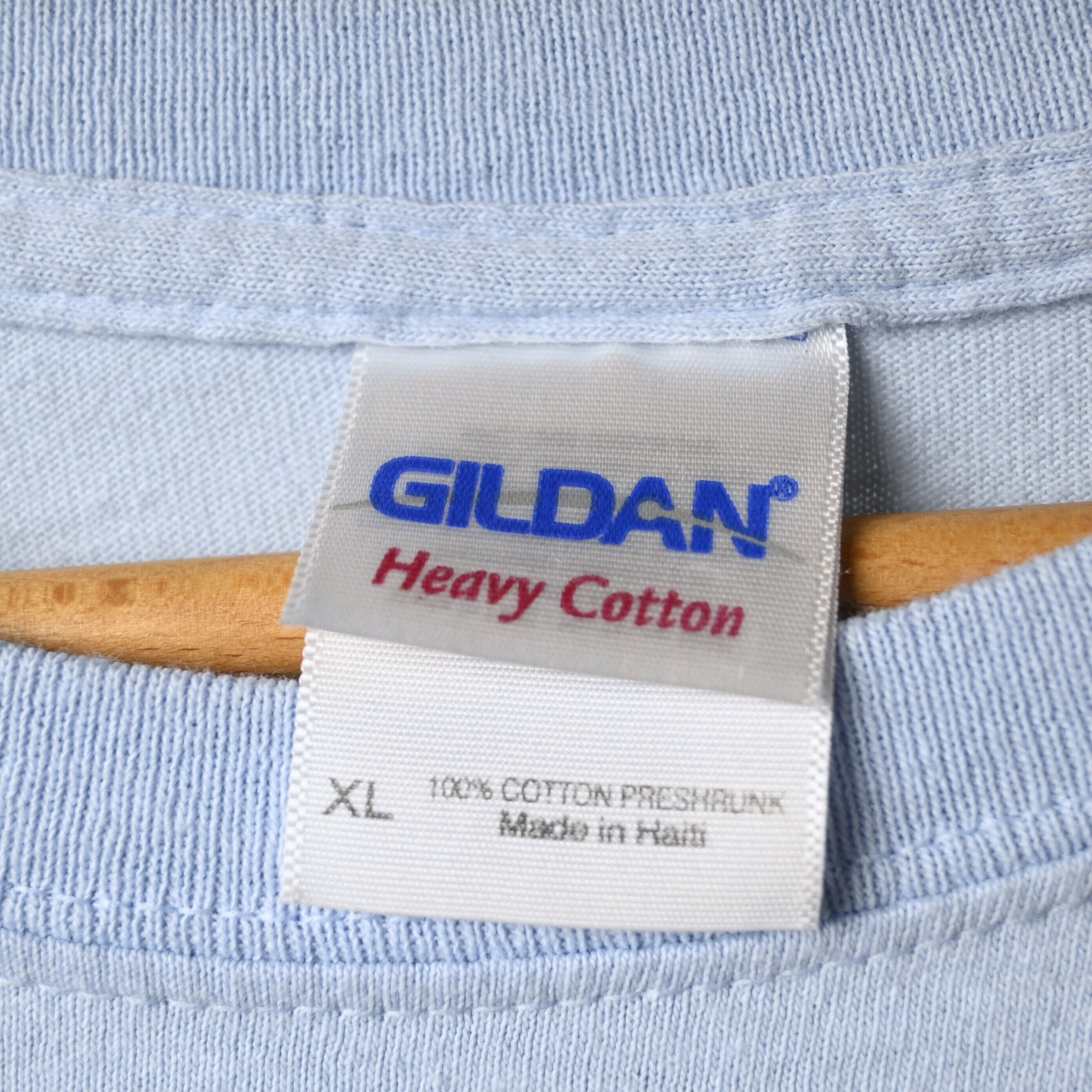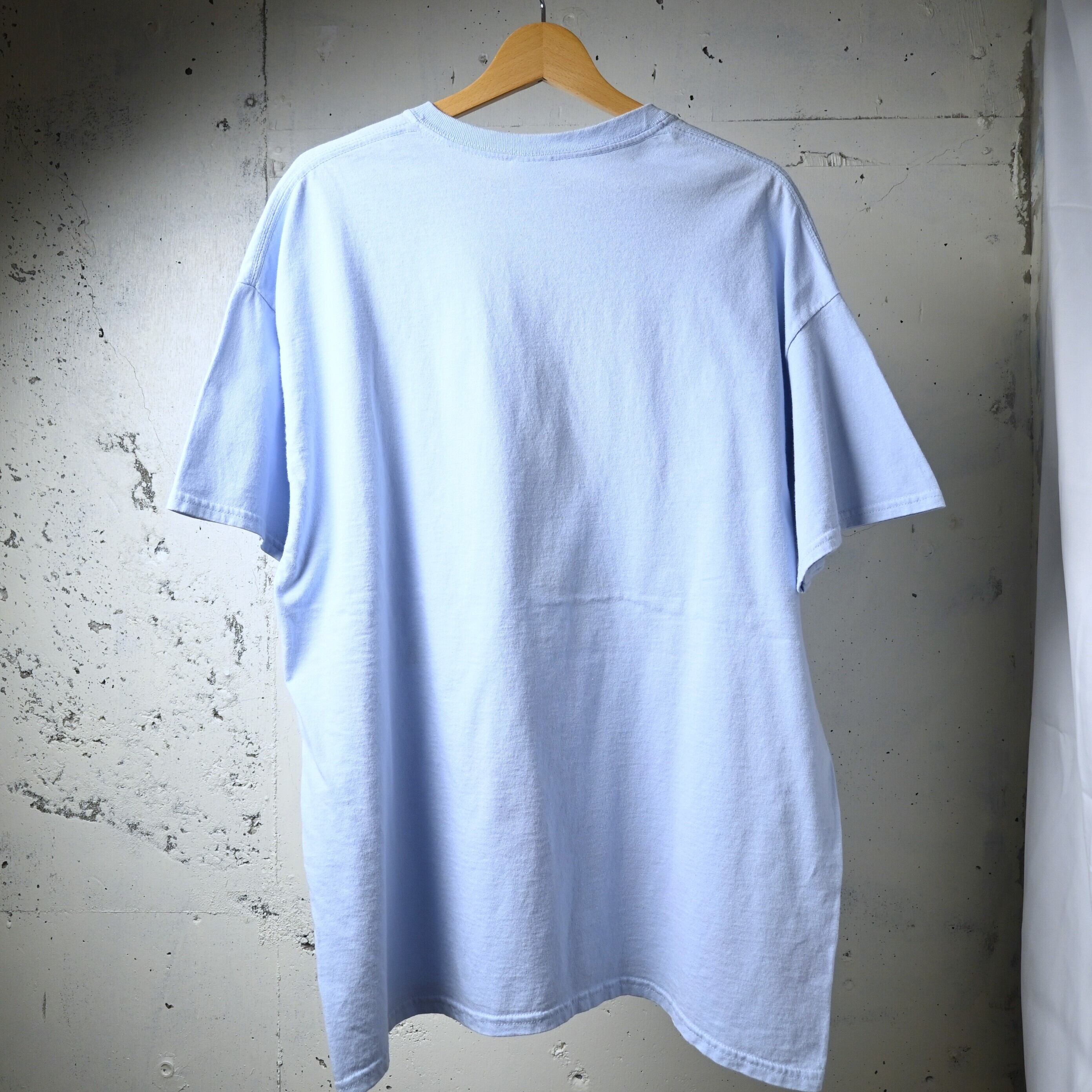淡いサックスカラーのボディはブラック系プリントとのコントラストが強く、一般的なブラックボディとはまた違った見え方が楽しめる仕様です。Gildan のヘビーコットンボディで、生地感もしっかりしており、サイズはXLでゆったり着用可能です。