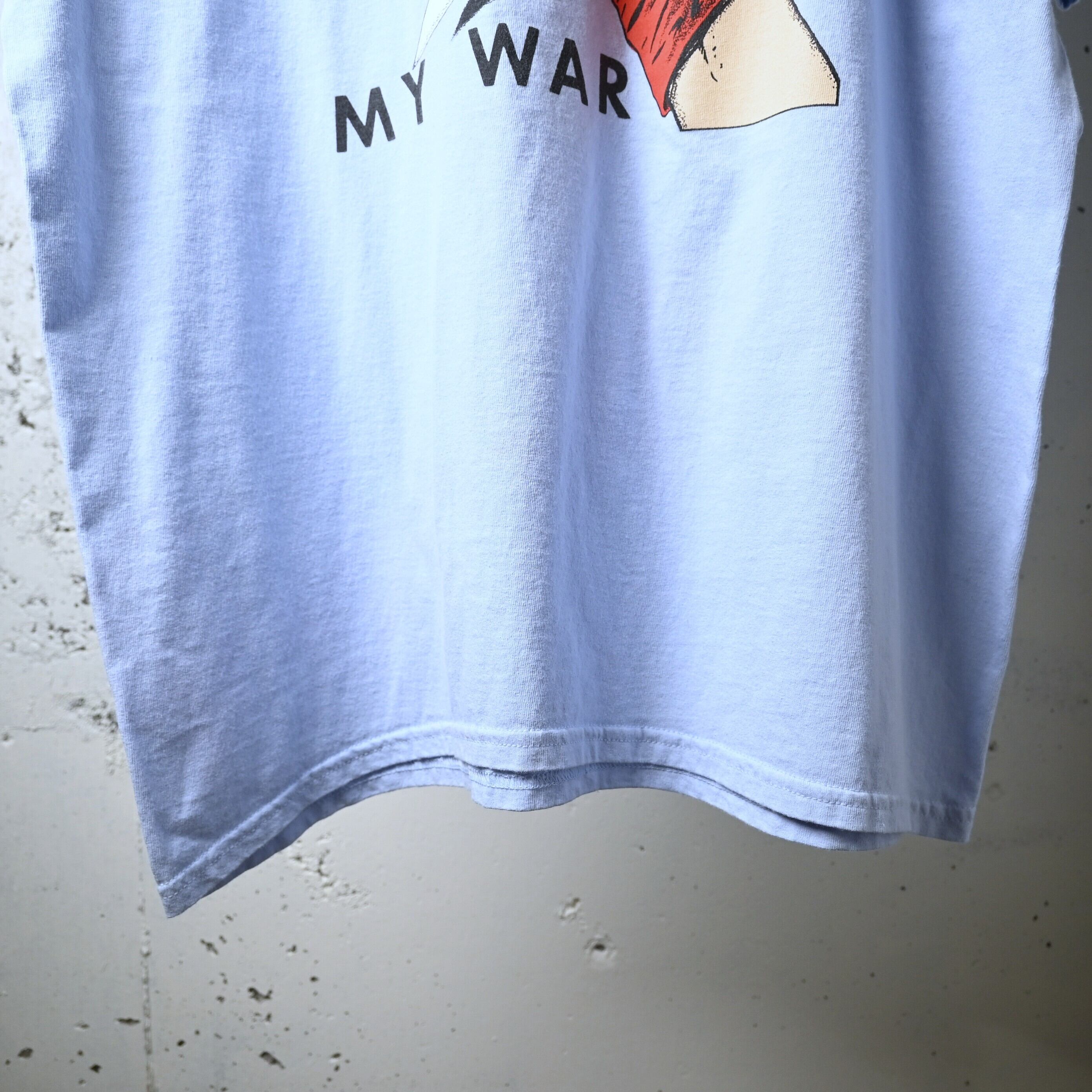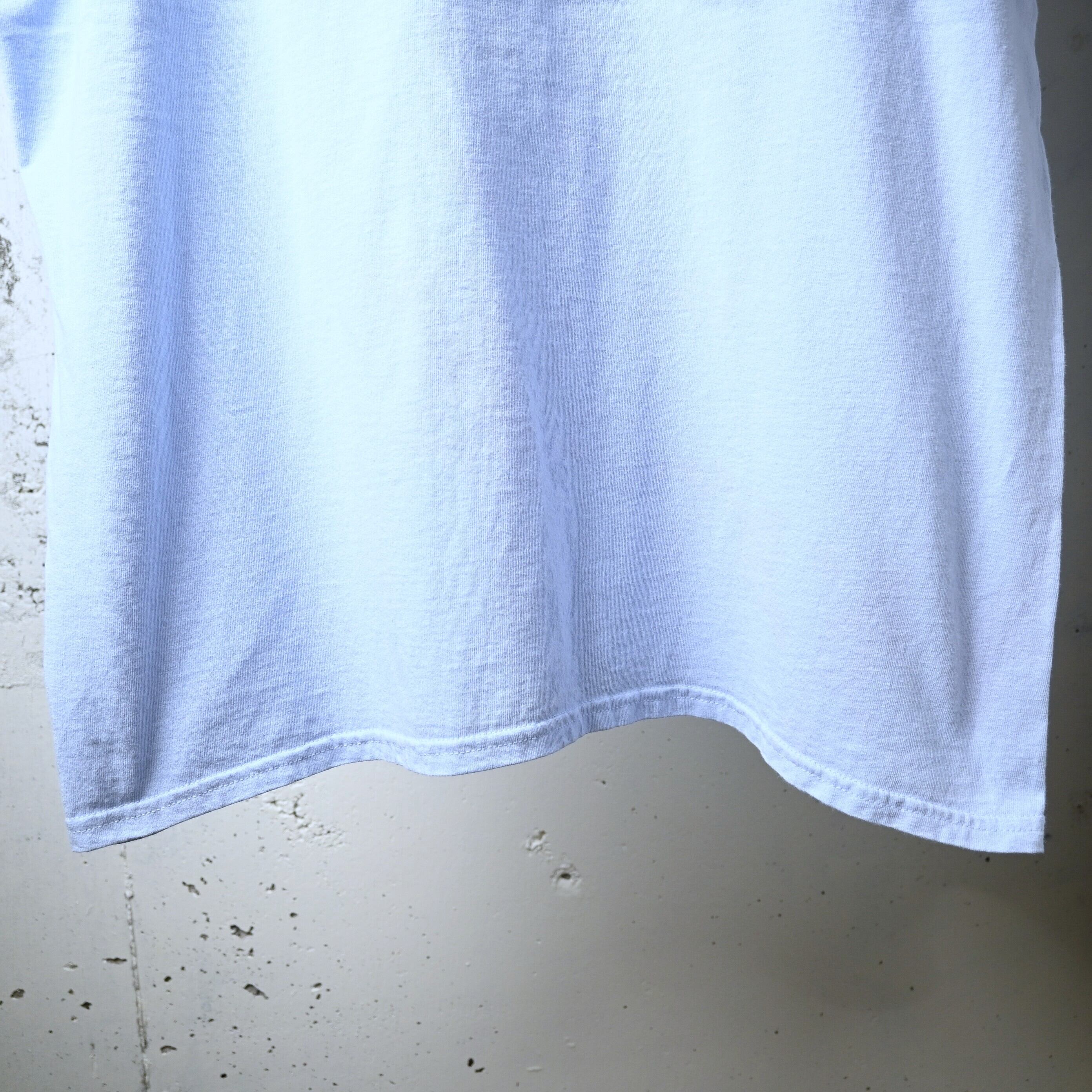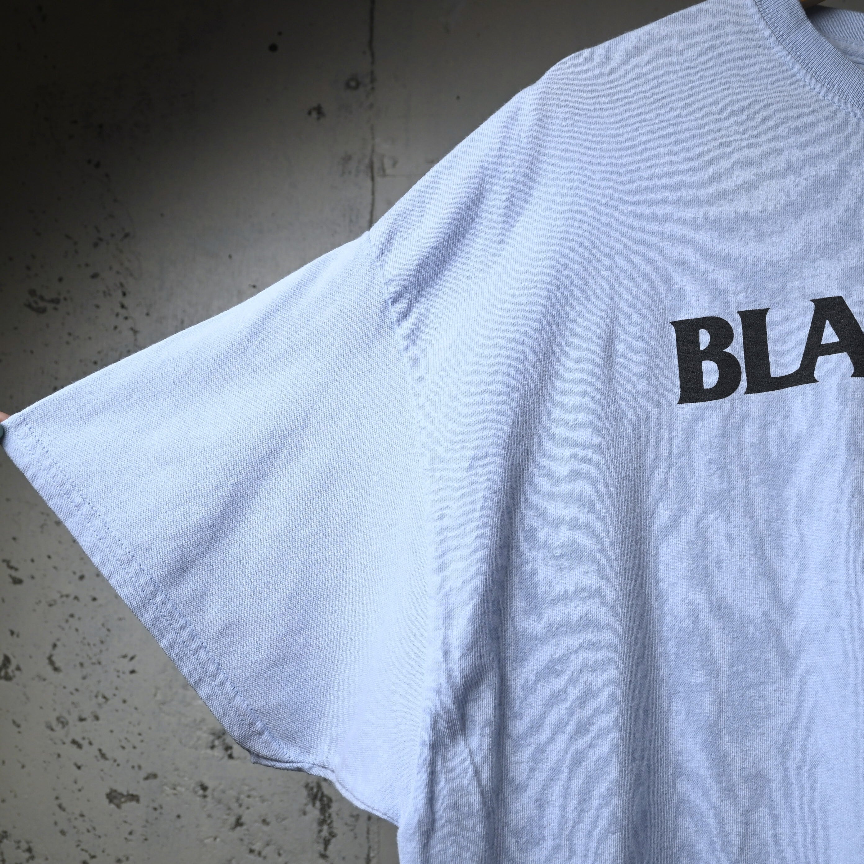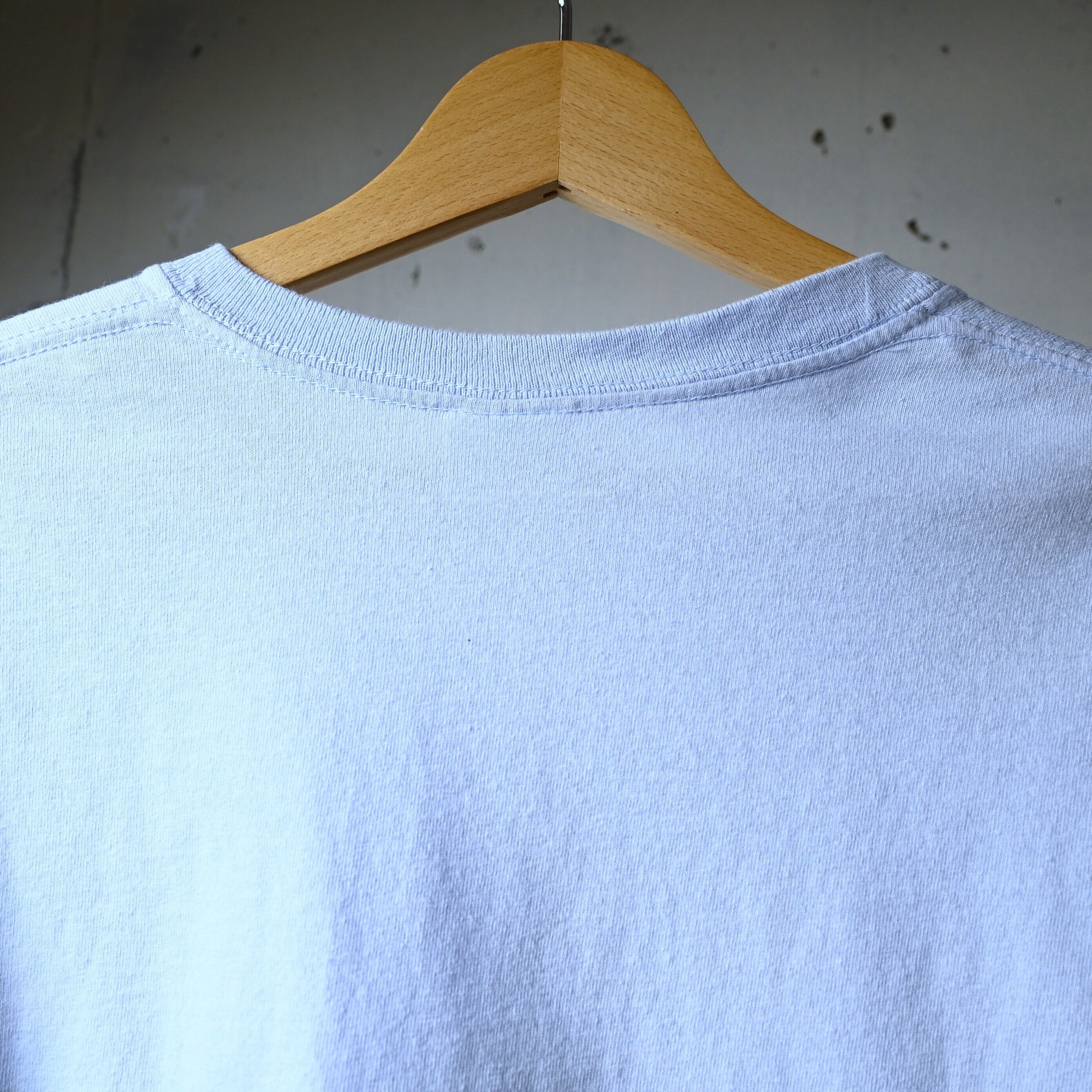 淡いサックスカラーのボディはブラック系プリントとのコントラストが強く、一般的なブラックボディとはまた違った見え方が楽しめる仕様です。Gildan のヘビーコットンボディで、生地感もしっかりしており、サイズはXLでゆったり着用可能です。
