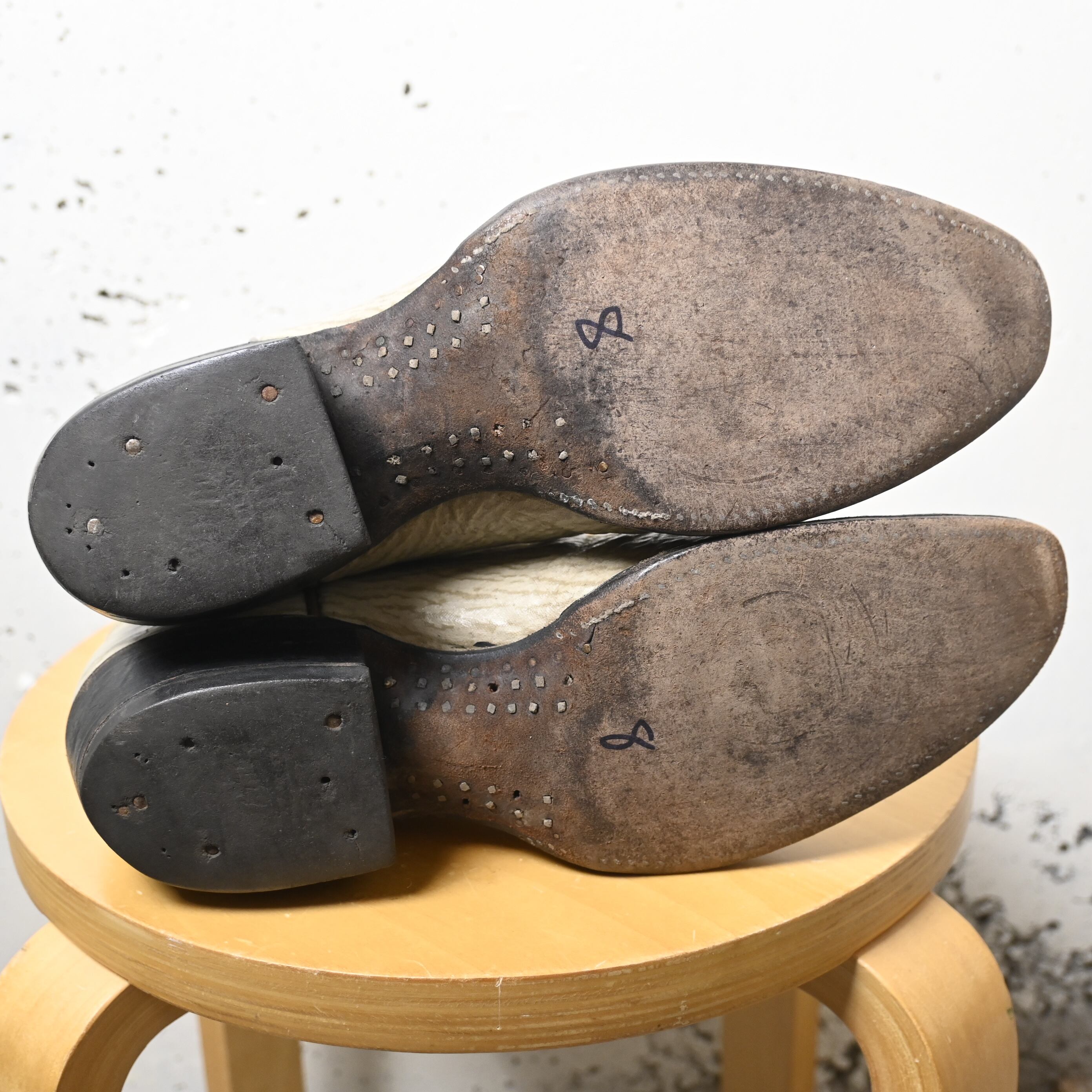 全体的にスレ、汚れ、黒ずみあり。つま先や甲部分に使用感、細かなキズあり。ヒール・ソールに使用感あり。ヴィンテージ特有の風合いとしてお楽しみいただけるコンディションで、着用に支障のあるダメージはございません。
