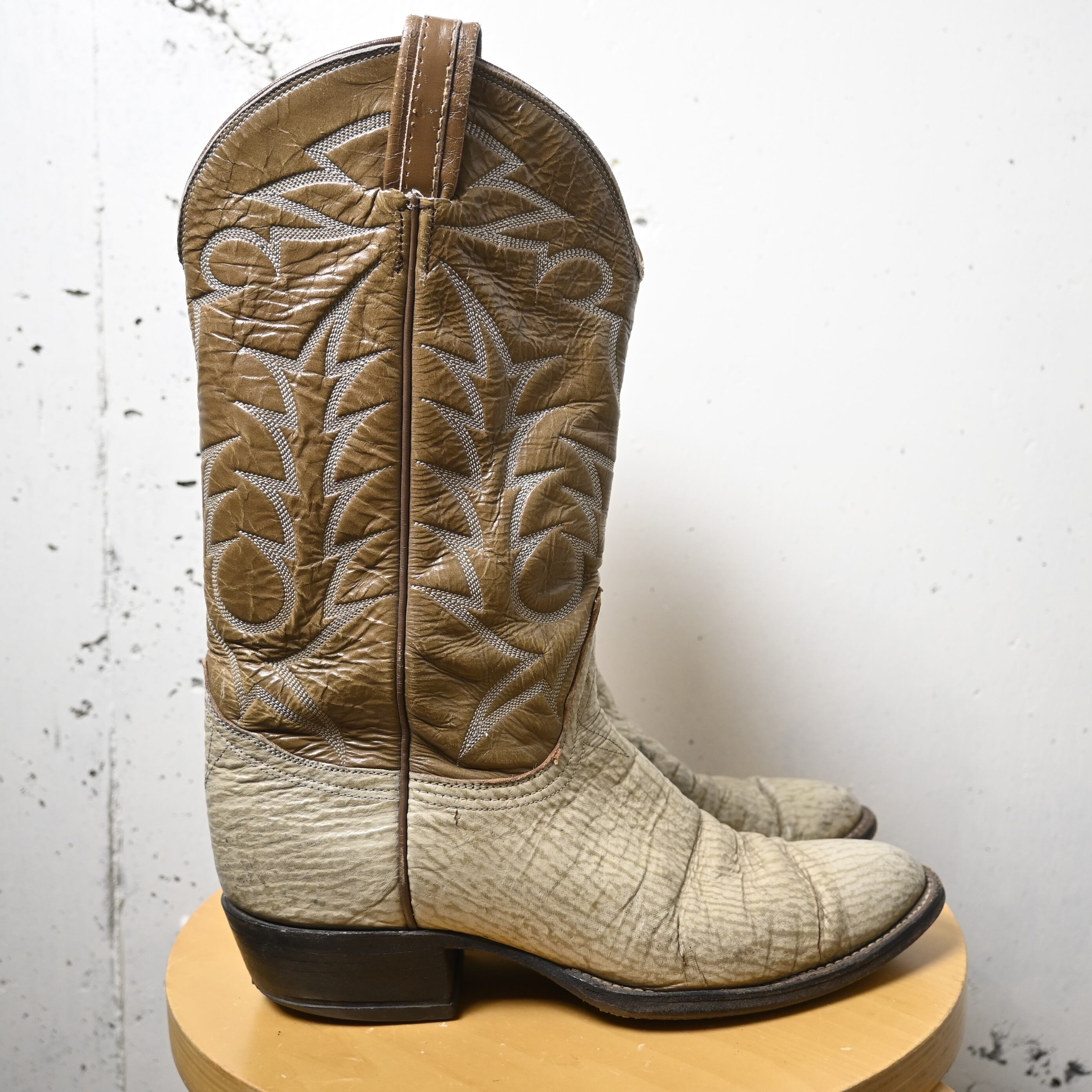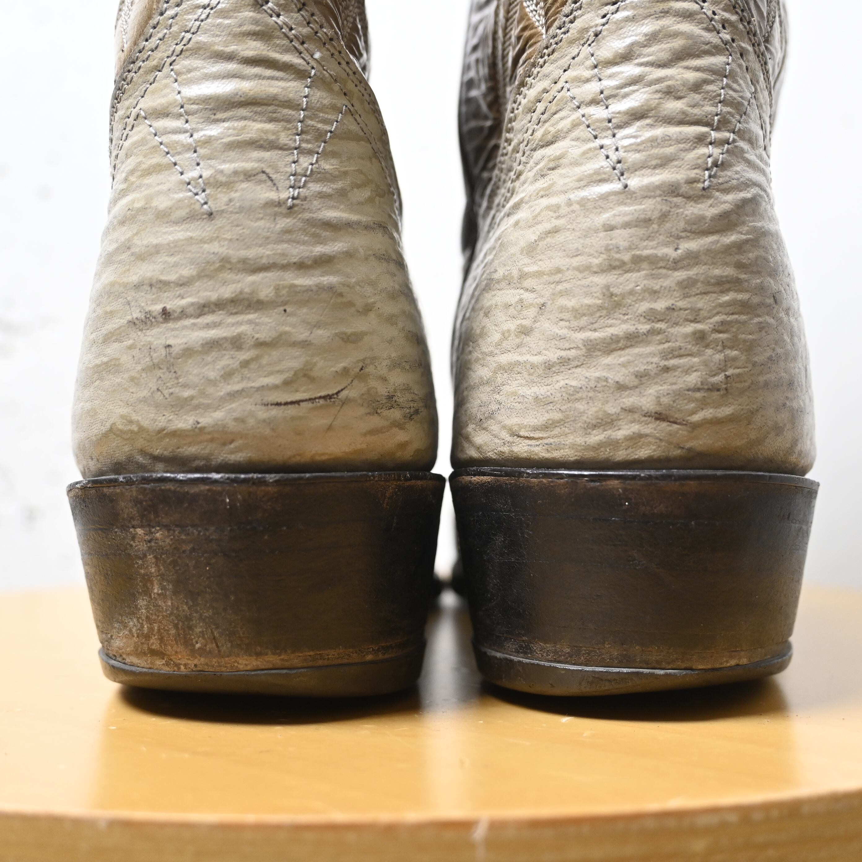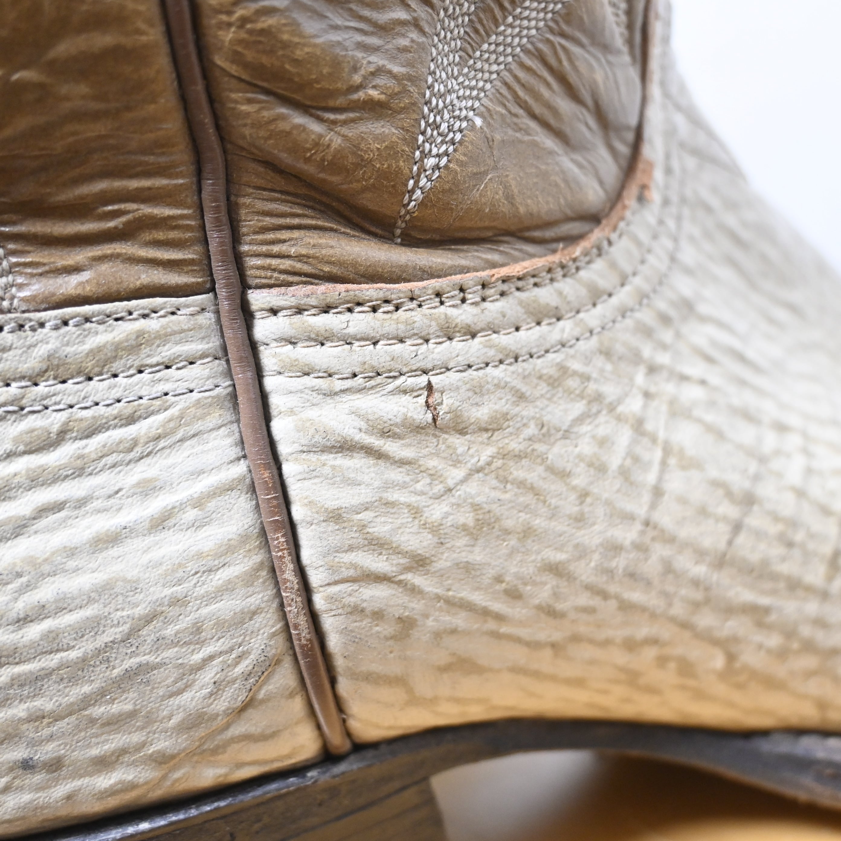 ホワイト系のアッパーにブラウンのシャフトを組み合わせたツートーン仕様で、ウエスタンらしいクラシックな雰囲気とファッション性を兼ね備えた一足です。シャフト部分には繊細なウエスタンステッチが施されており、シンプルながらも存在感のあるデザインに仕上がっています。