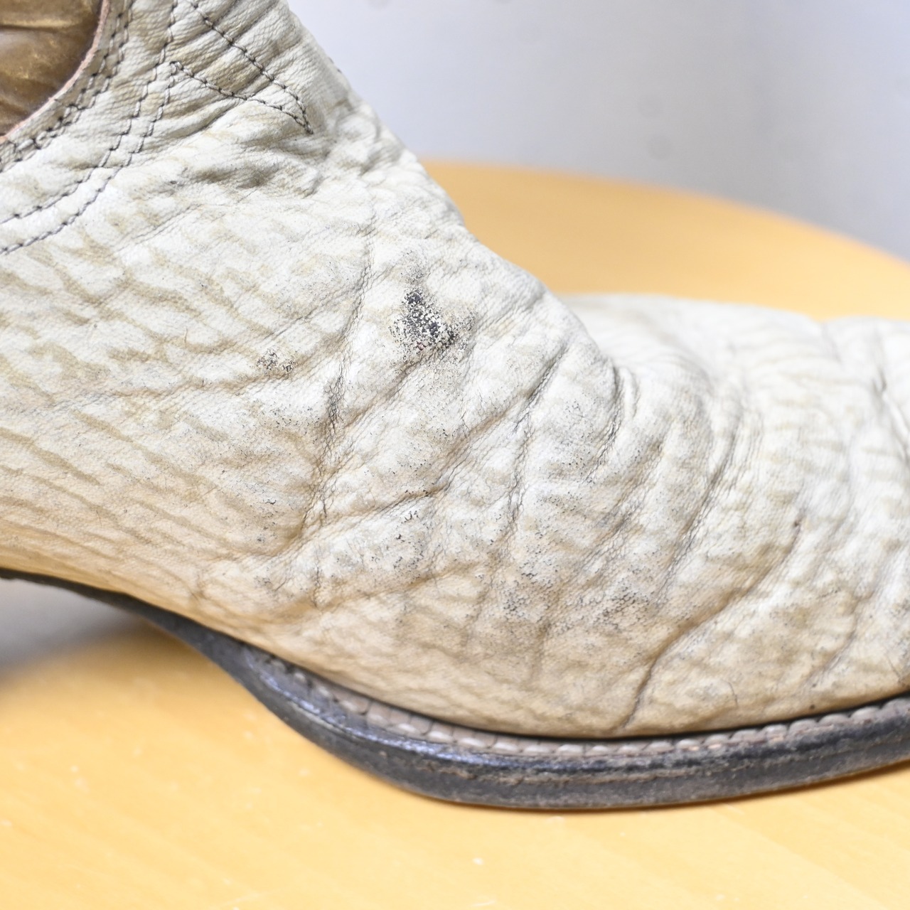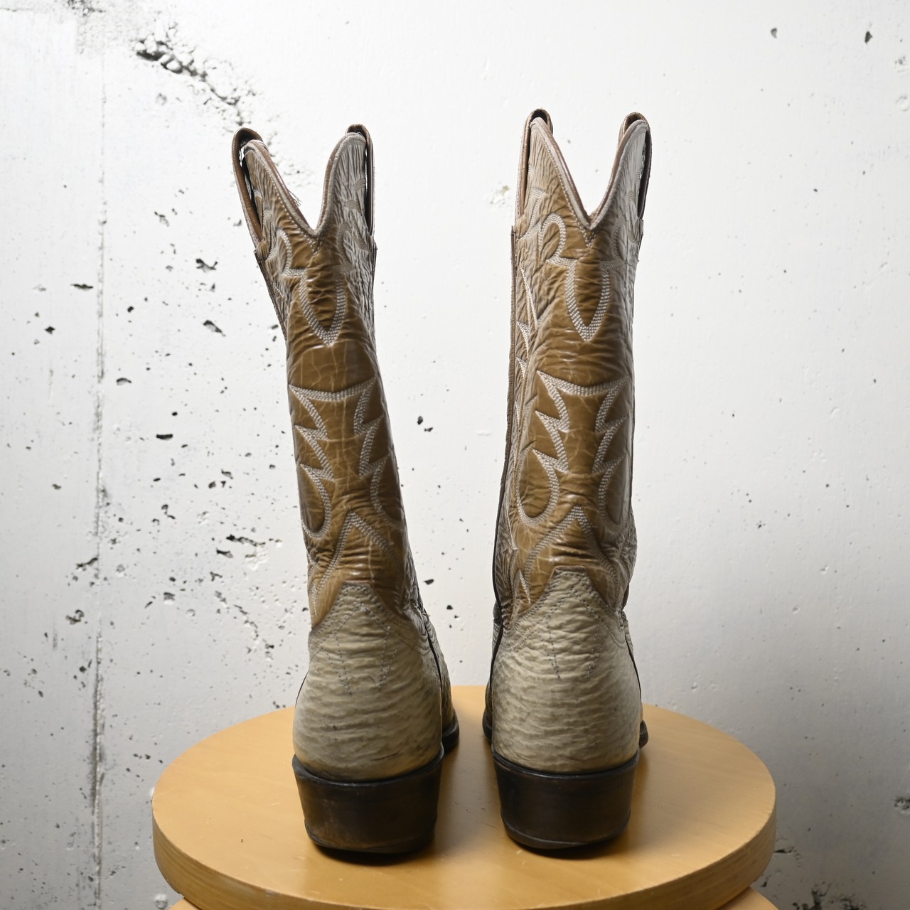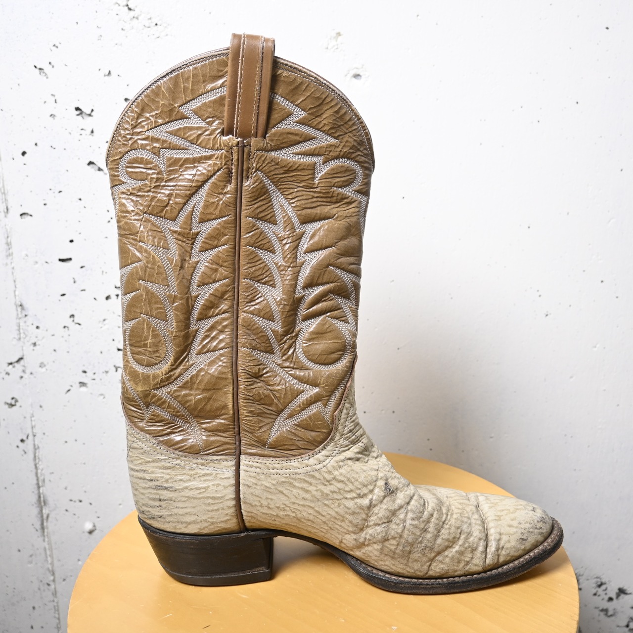 ホワイト系のアッパーにブラウンのシャフトを組み合わせたツートーン仕様で、ウエスタンらしいクラシックな雰囲気とファッション性を兼ね備えた一足です。シャフト部分には繊細なウエスタンステッチが施されており、シンプルながらも存在感のあるデザインに仕上がっています。