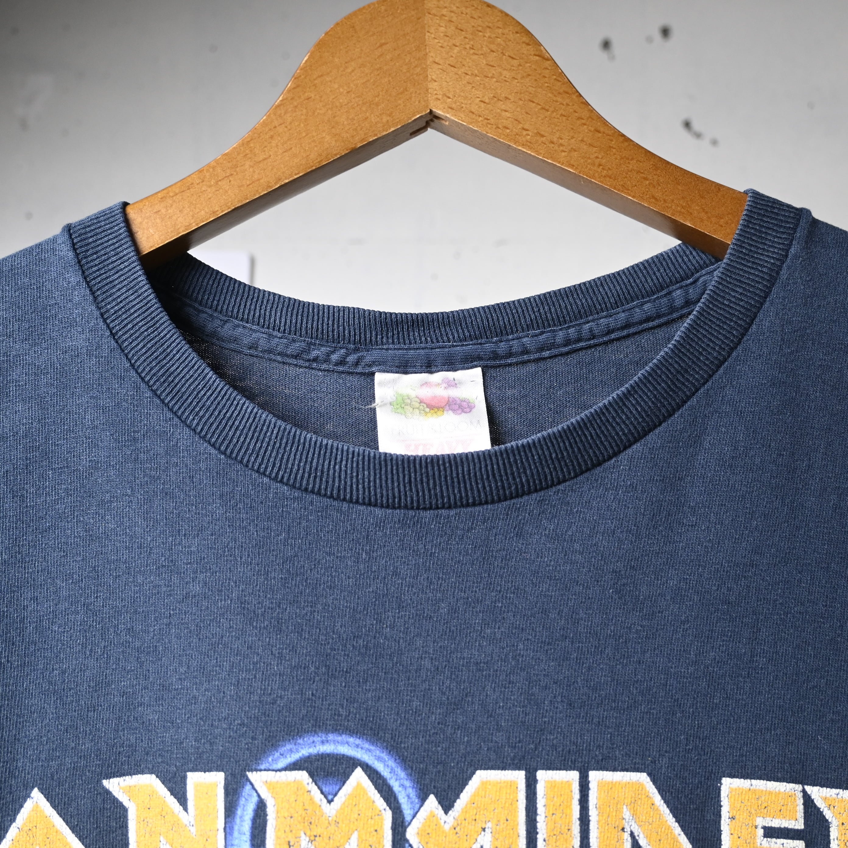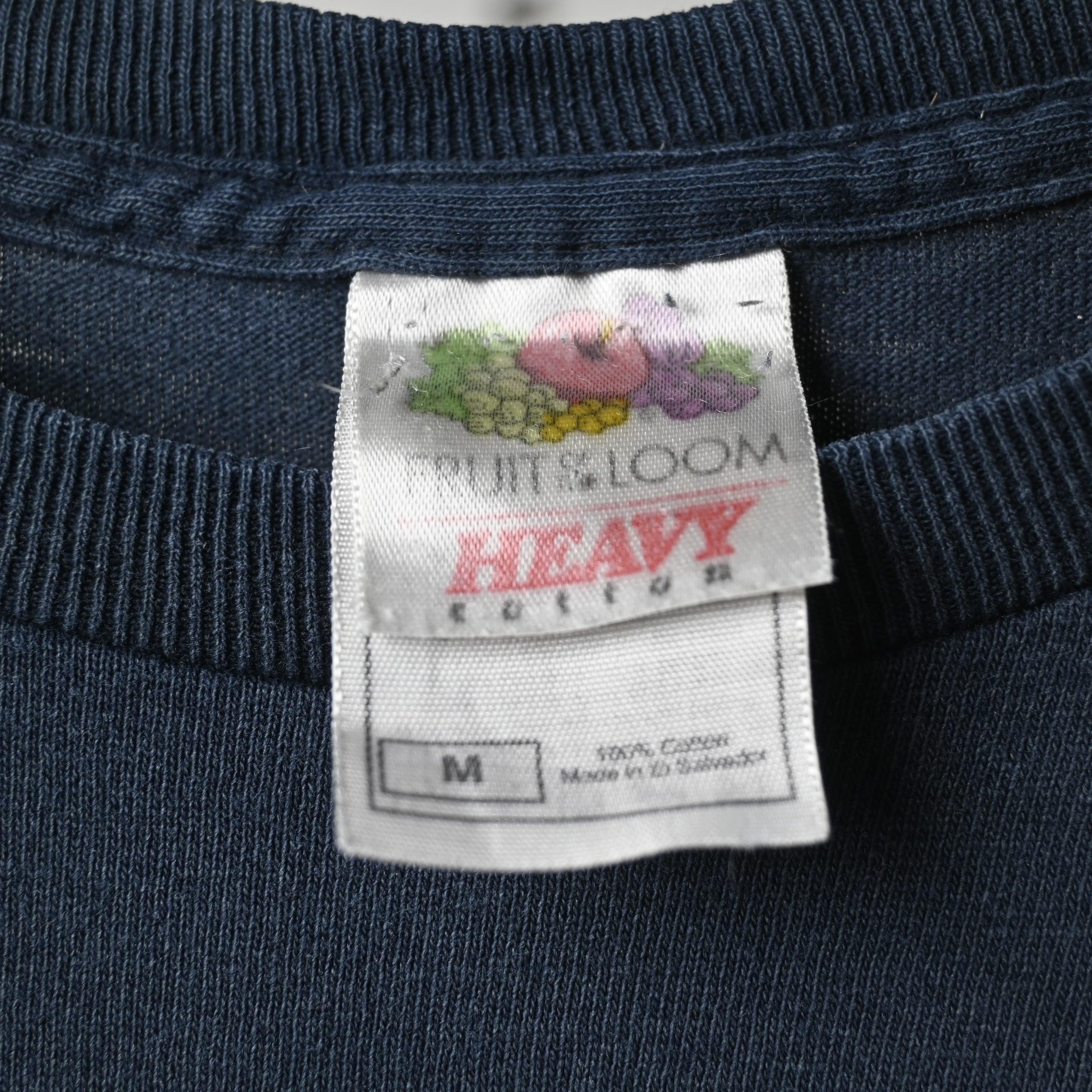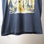 ボディはFRUIT OF THE LOOM(フルーツオブザルーム)製。ややフェードしたブラックカラーに加え、袖カットオフ仕様となっており、ヴィンテージライクな雰囲気が魅力。着込まれた風合いも相まって、雰囲気系の一枚として仕上がっています。