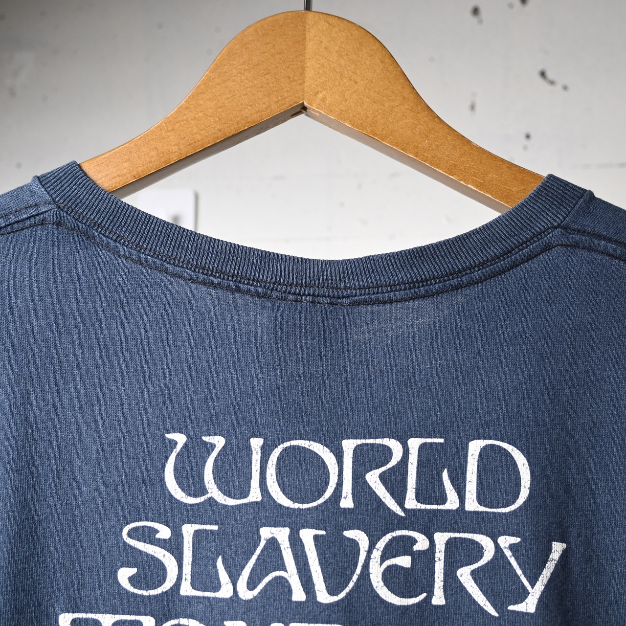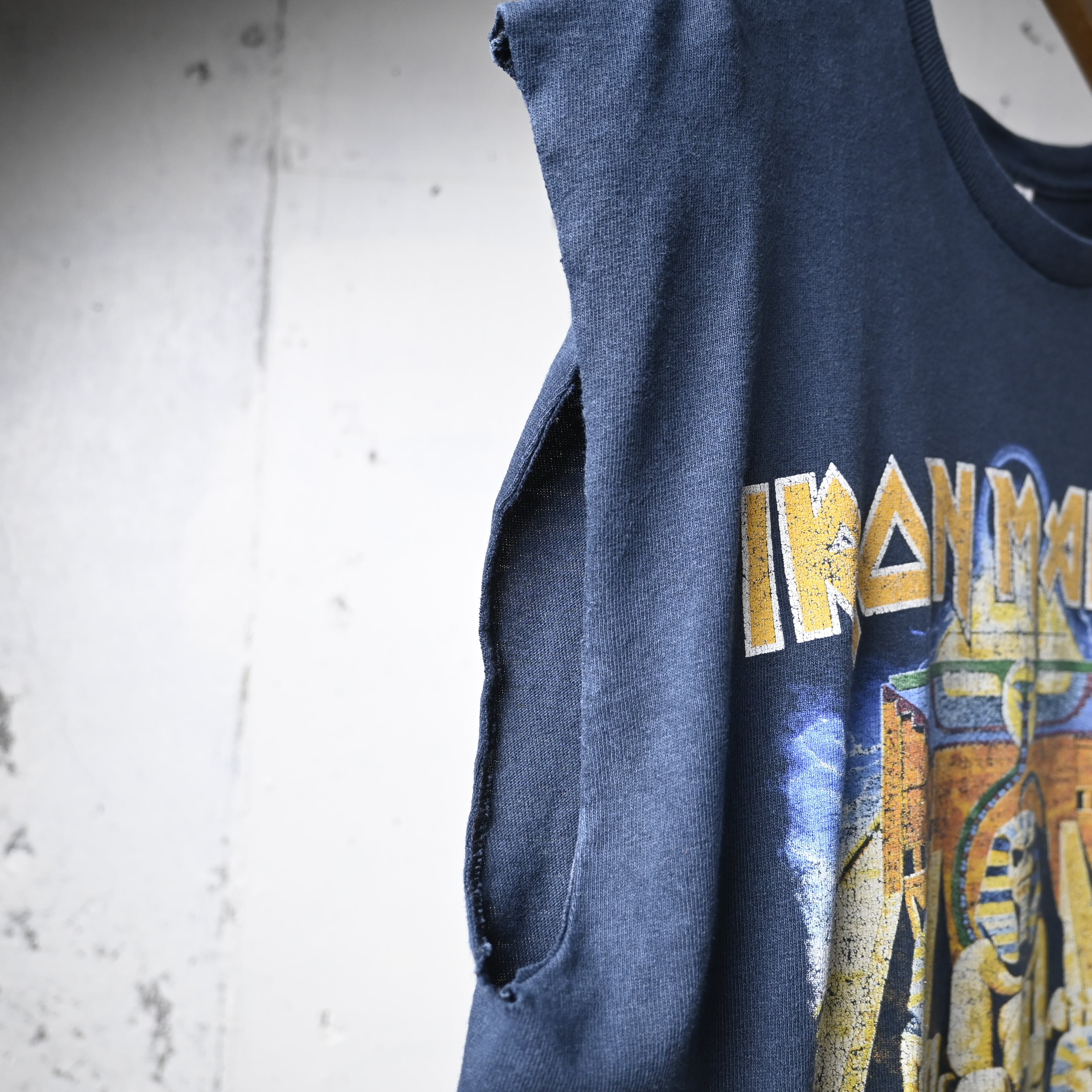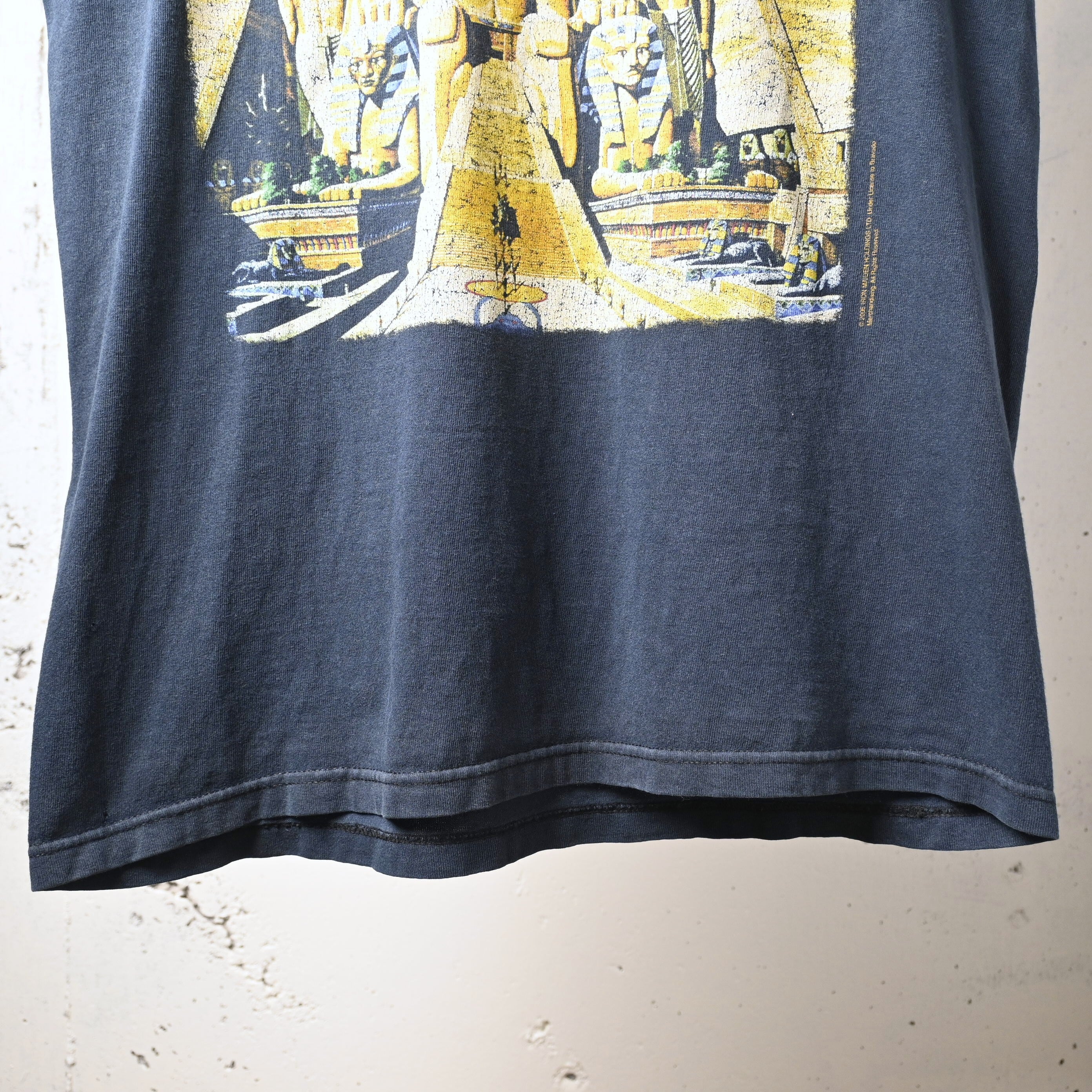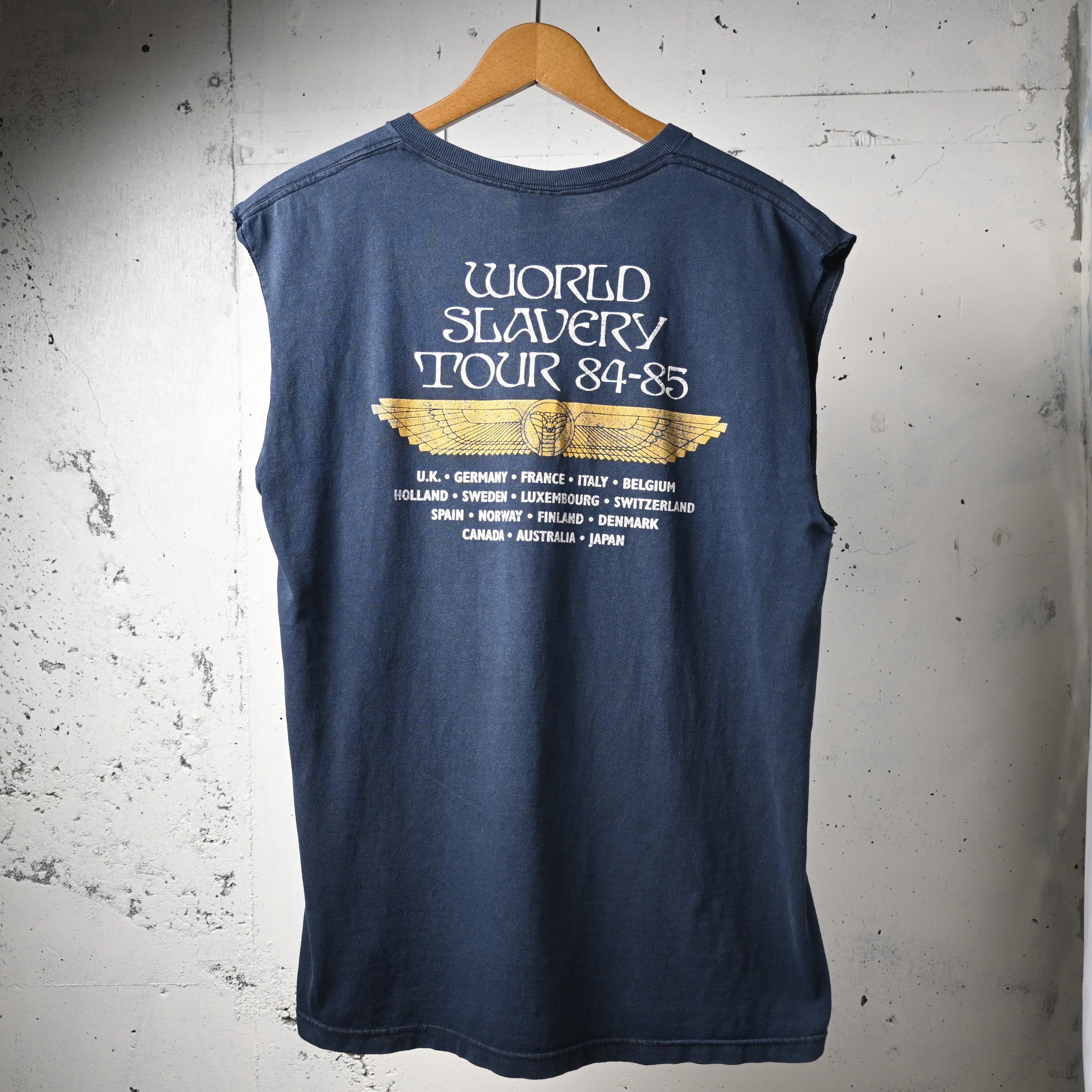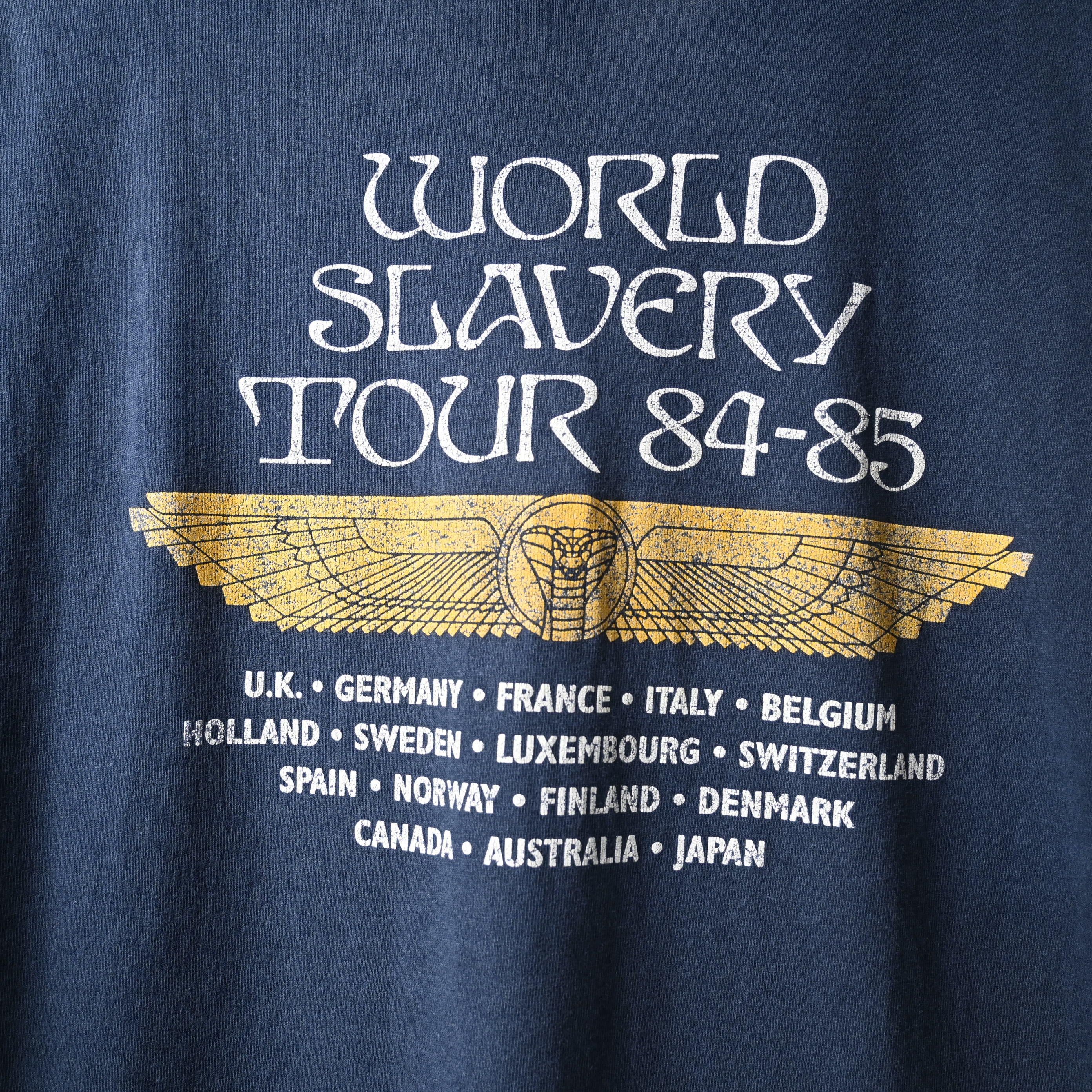 フロントにはエジプトモチーフの印象的なグラフィック、バックには「WORLD SLAVERY TOUR 84-85」のツアープリントが入る、ファンにはたまらない両面プリント仕様。1984-85年の名ツアーをモチーフにしたデザインで、バンドの世界観を色濃く反映した一枚です。