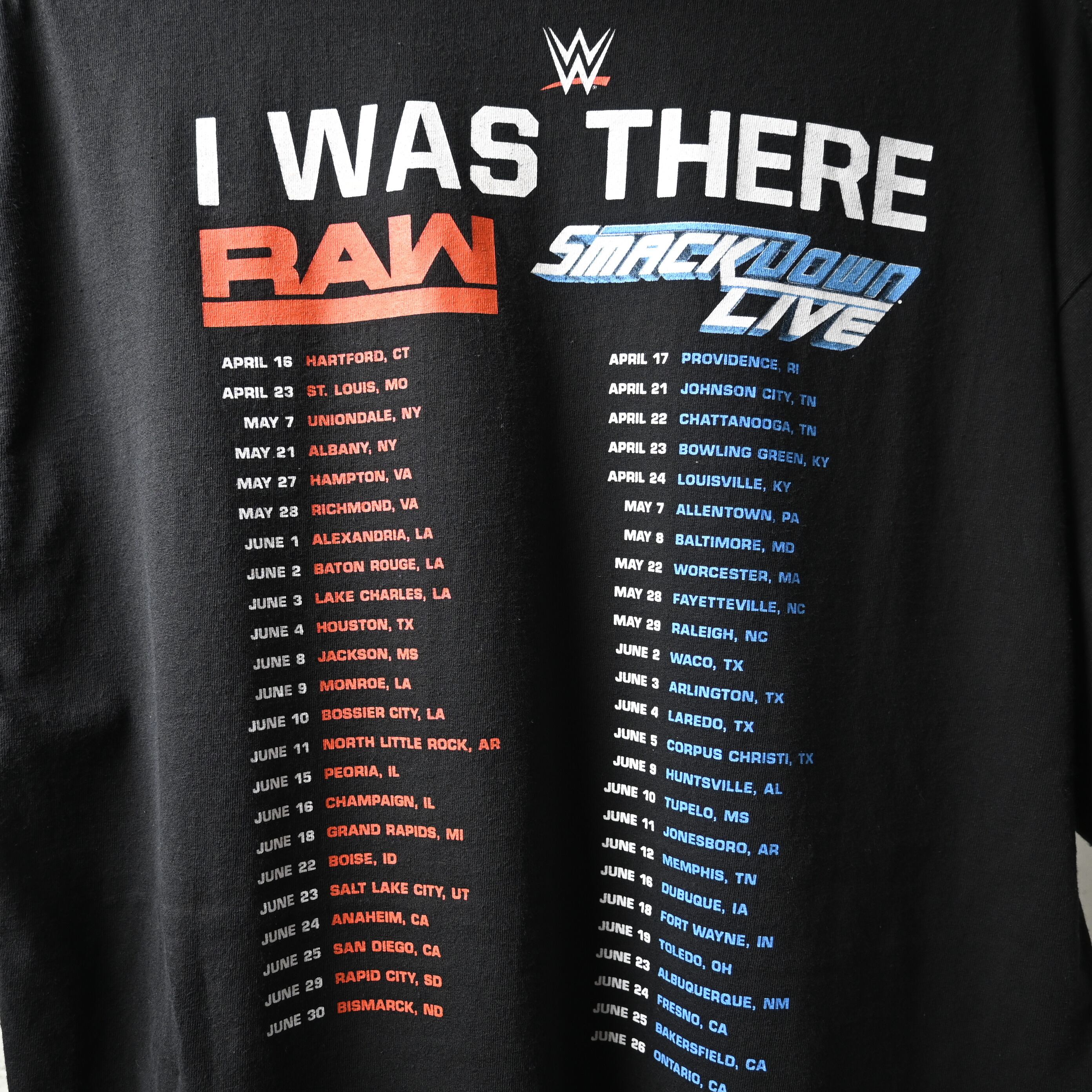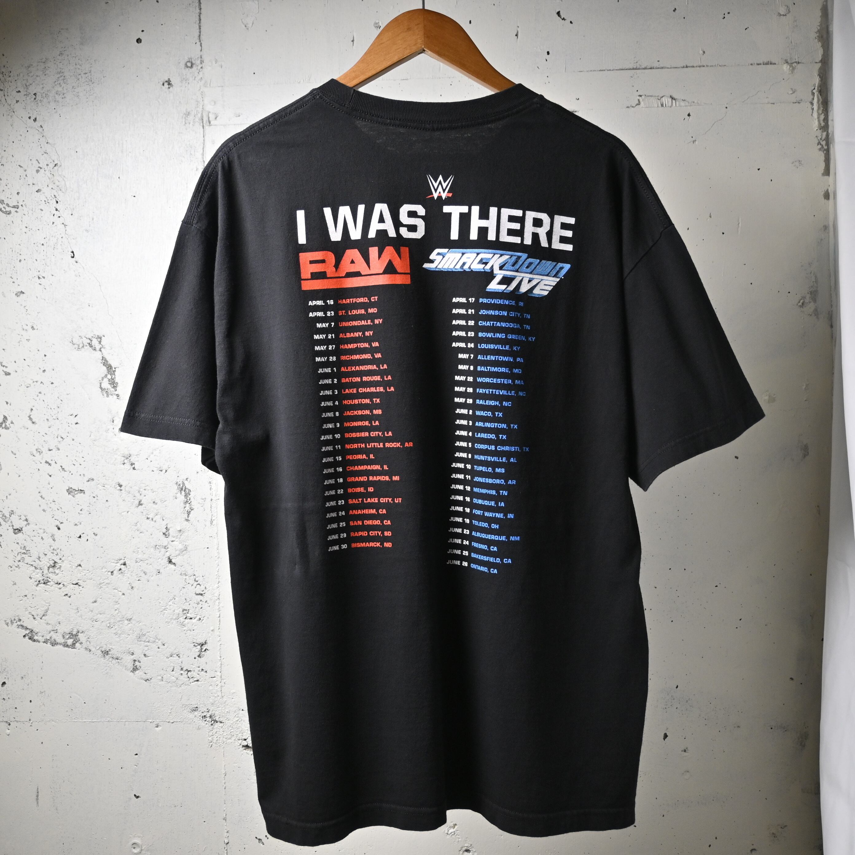 バックには「I WAS THERE」のメッセージとともに、RAW・SmackDown Liveのツアー日程がプリントされた、リアルな現場感を感じられる一枚です。