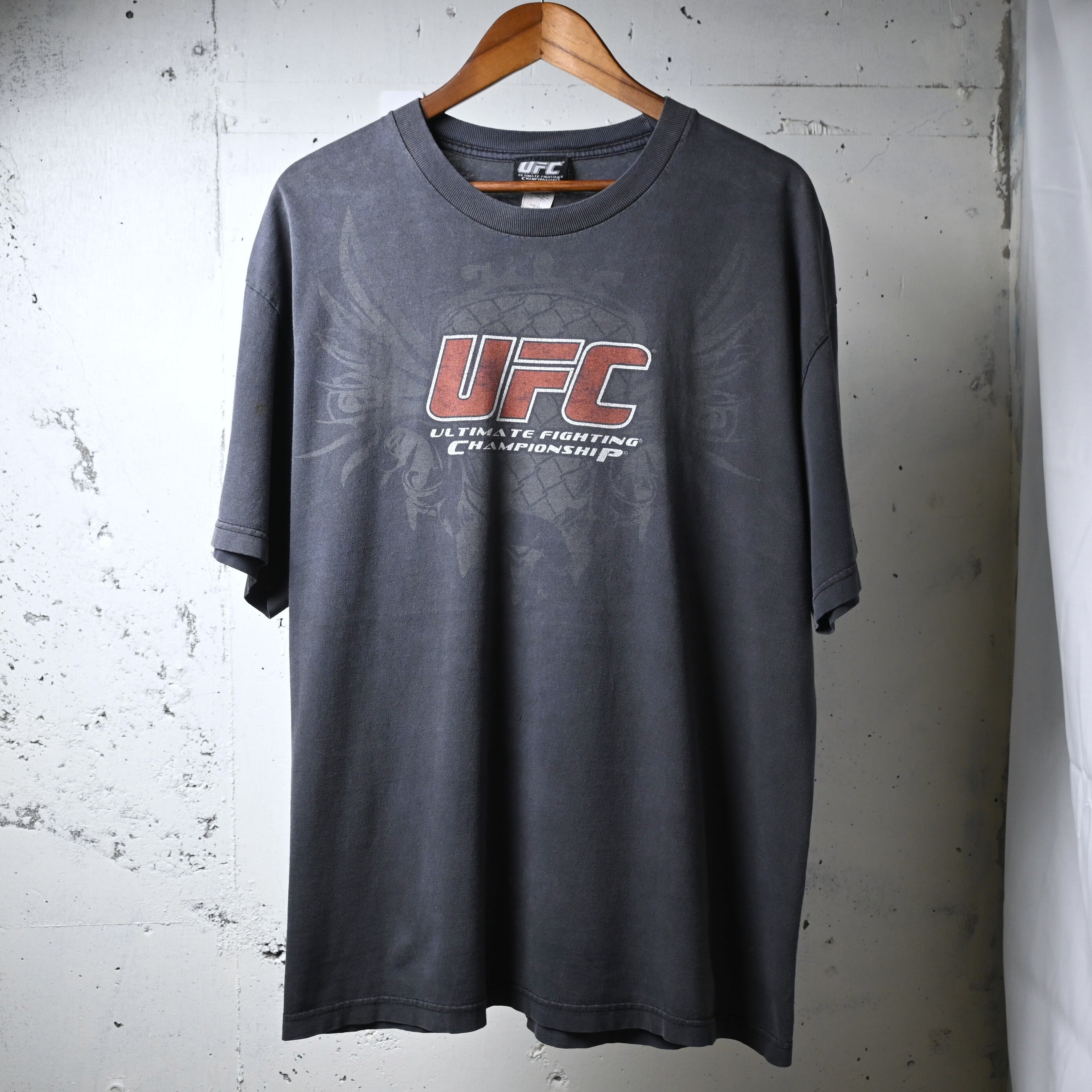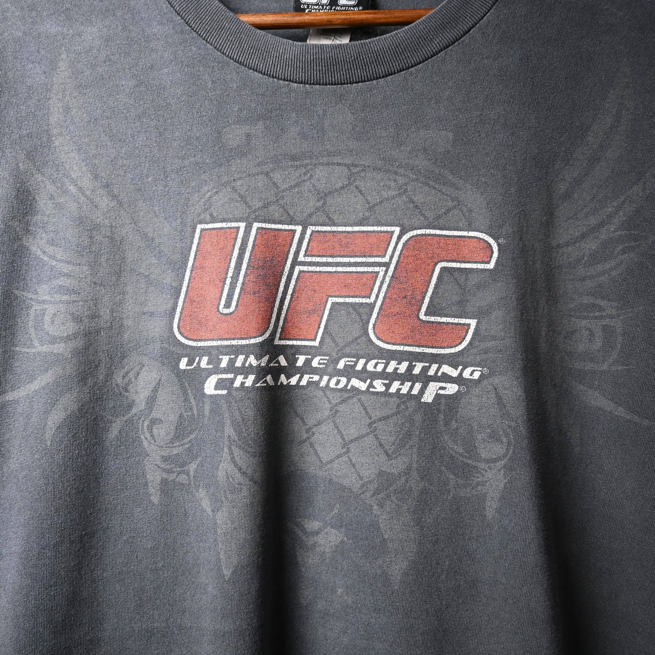 フロントには象徴的なUFCロゴに加え、「ULTIMATE FIGHTING CHAMPIONSHIP」の文字と、背後にさりげなく入るウイング調のグラフィックが特徴的なデザイン。