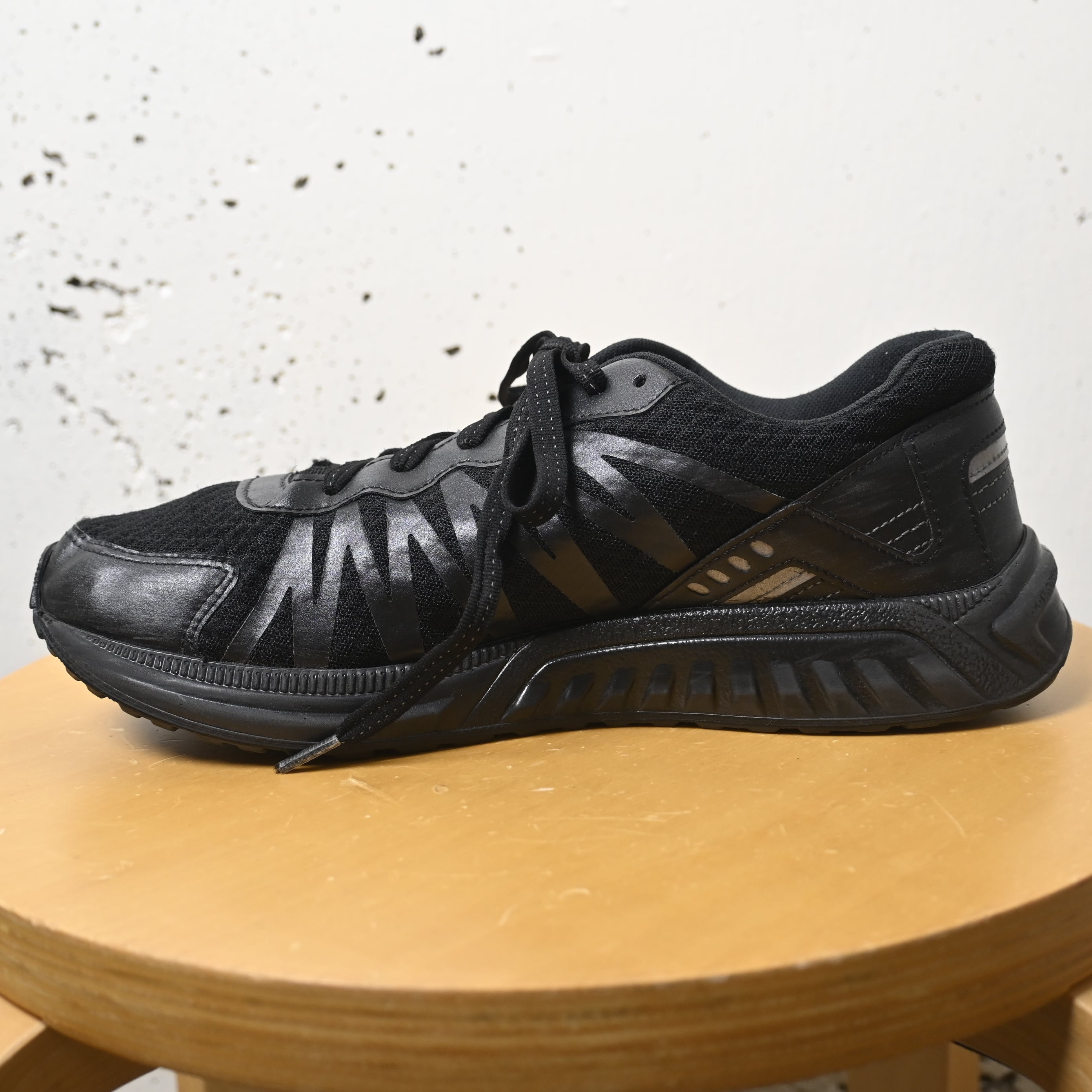 メッシュとレザーのコンビアッパーに、ブラックで統一されたミニマルなデザイン。