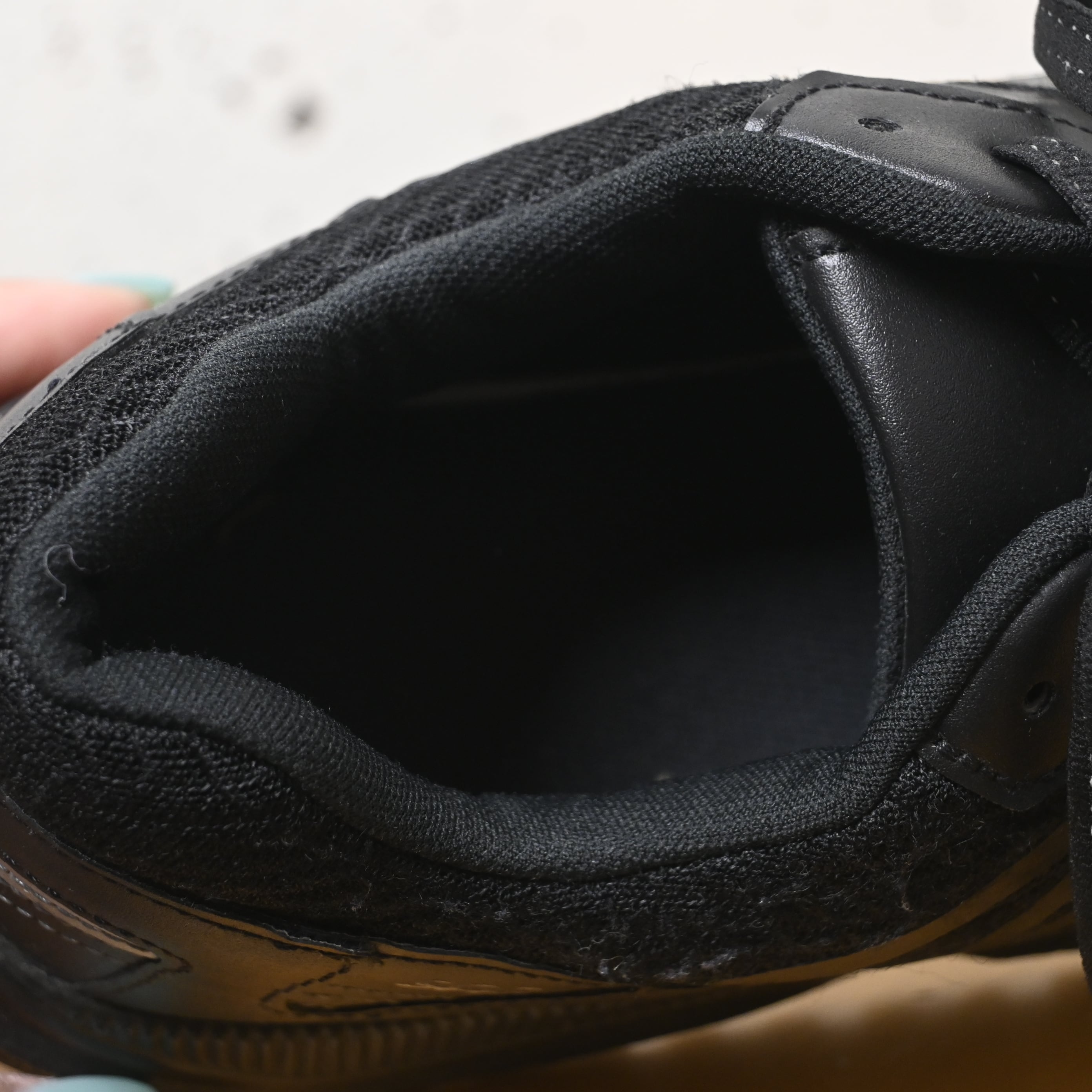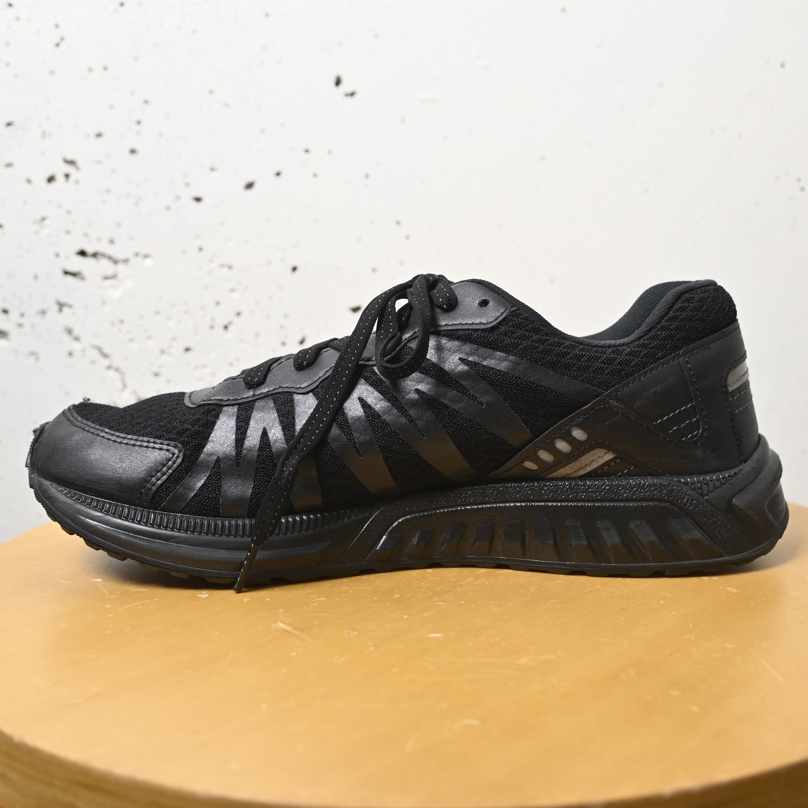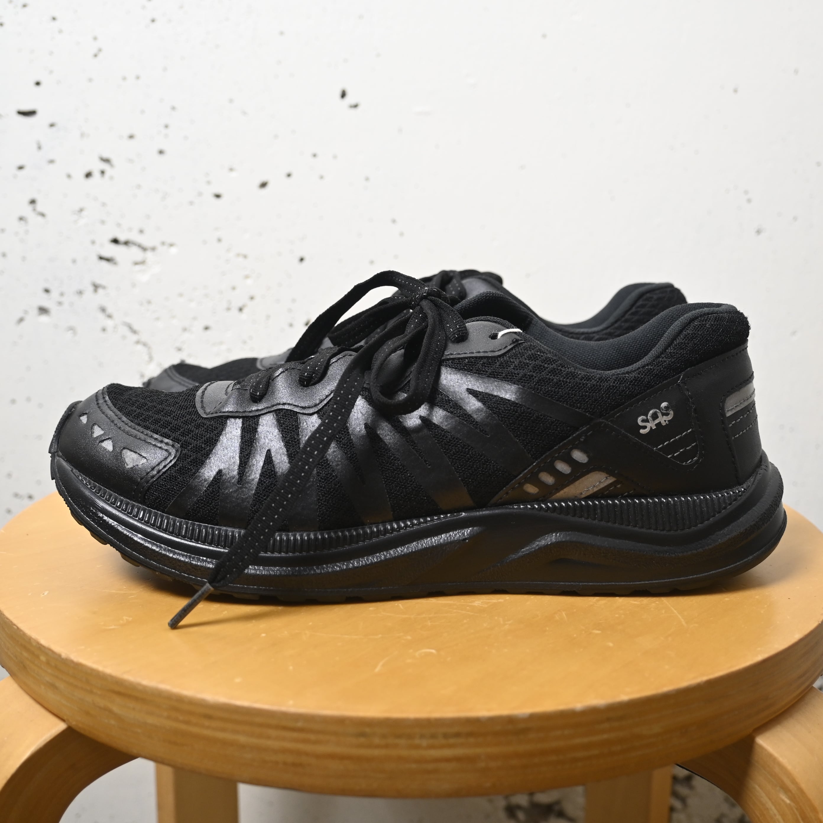 メッシュとレザーのコンビネーションアッパーに、ブラックで統一されたミニマルなデザイン。