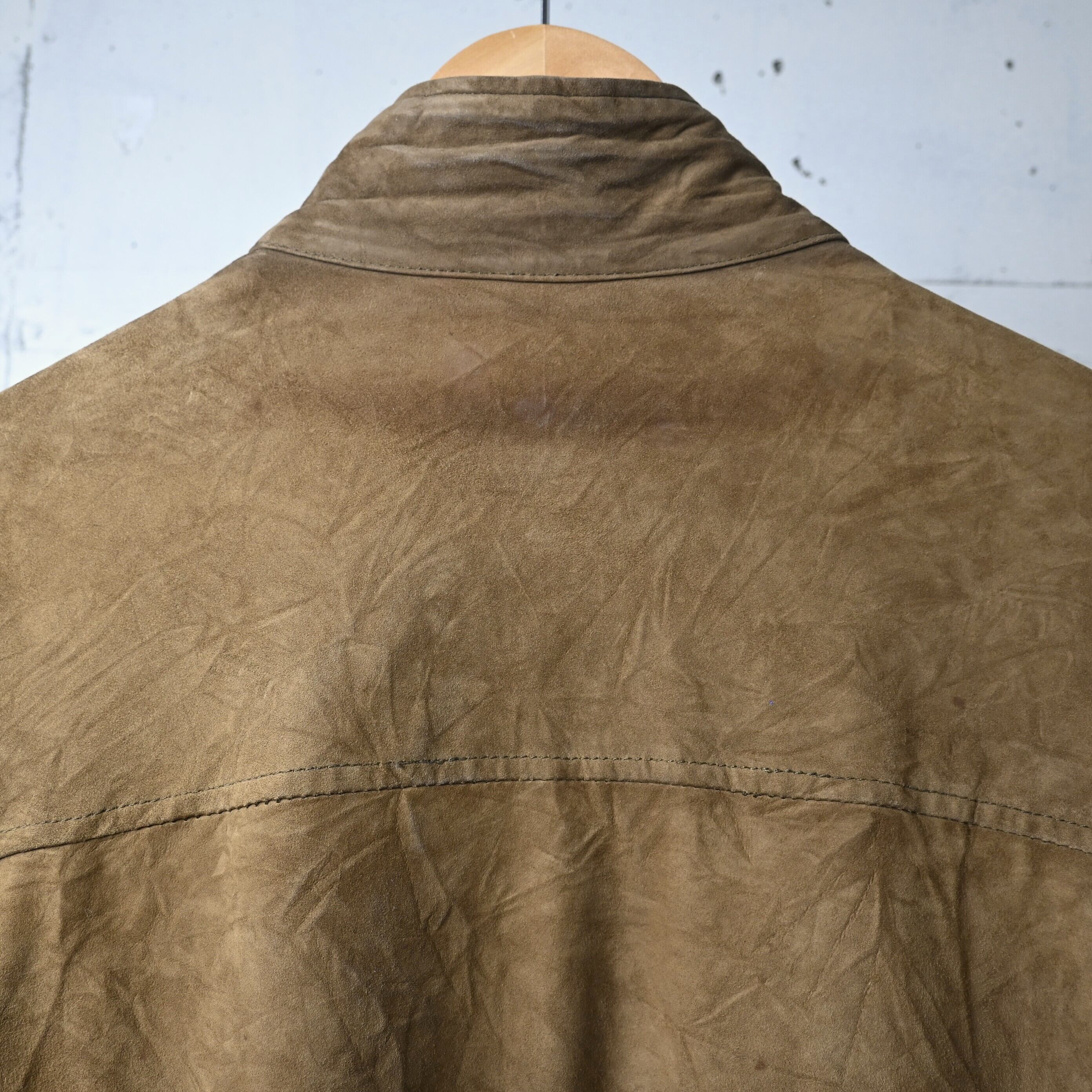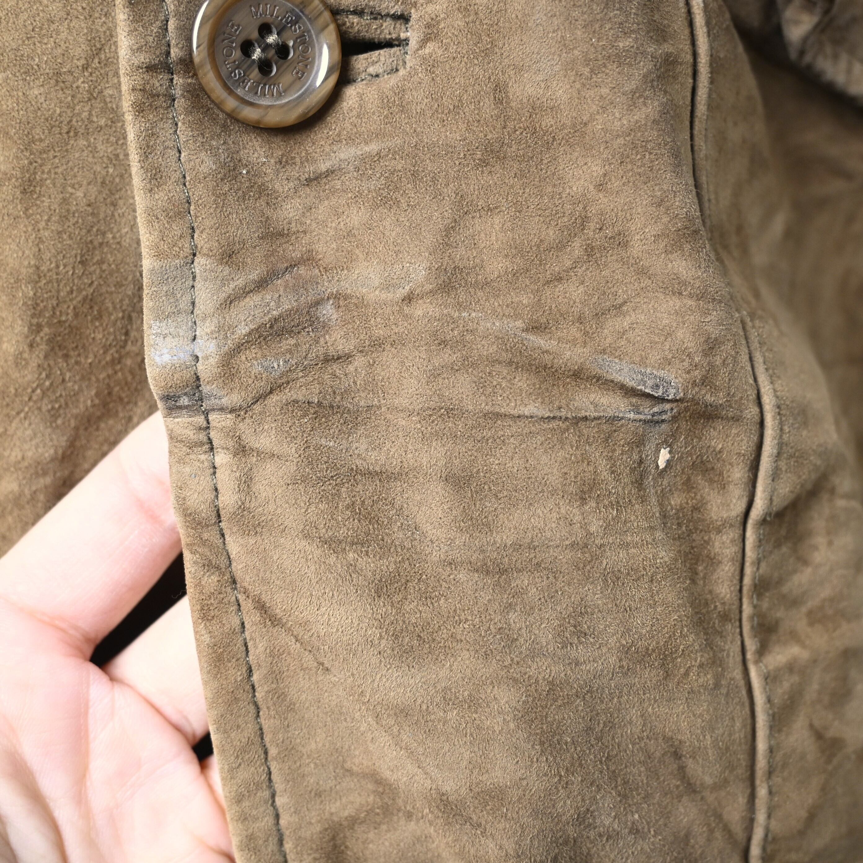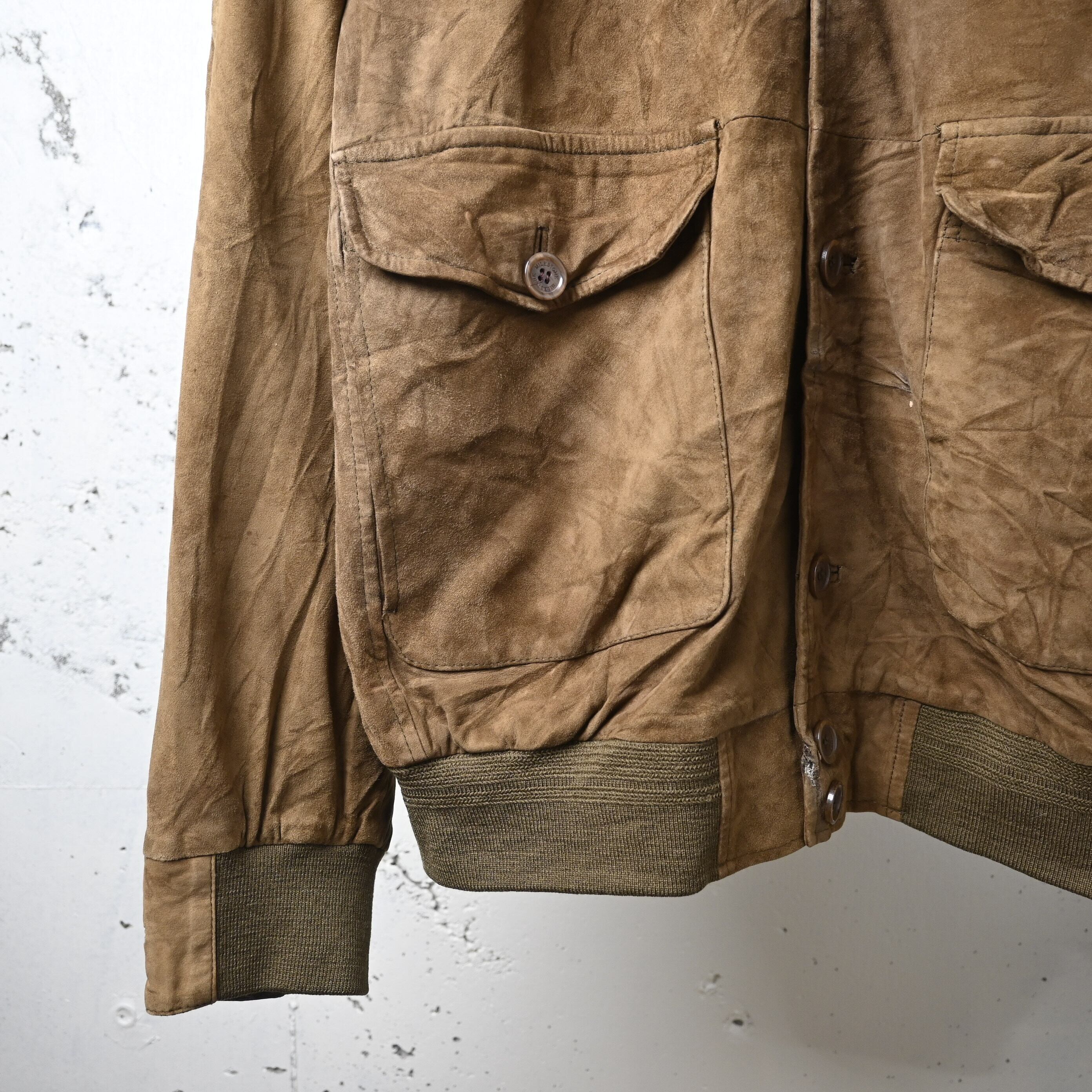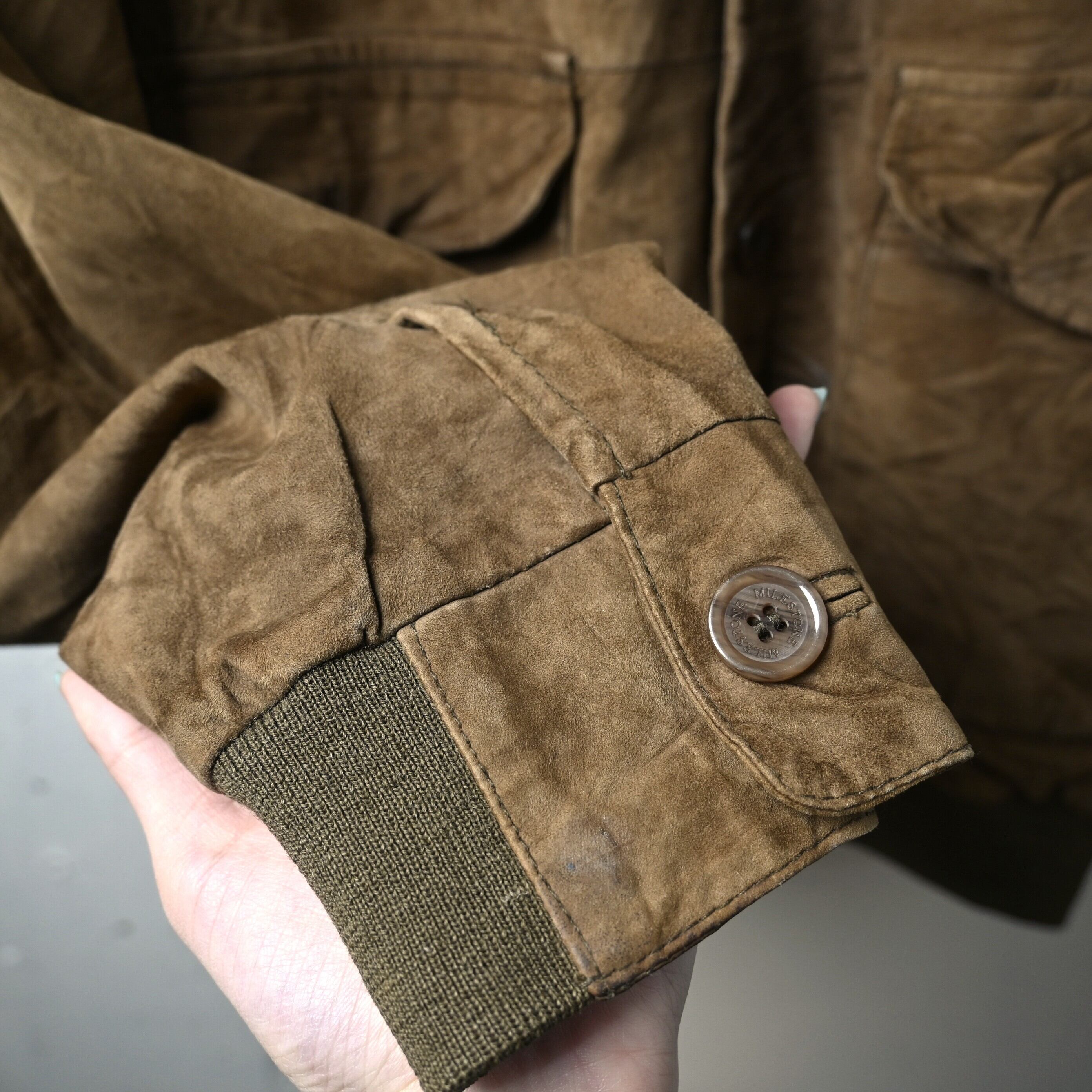スエード特有の擦れ、色ムラ、アタリ、軽微な汚れが見られます。一番下のボタン横にダメージがあります。ポケットの中補修あり。全体的に着用に問題はなく、ヴィンテージらしい雰囲気としてお楽しみいただけるコンディションです。