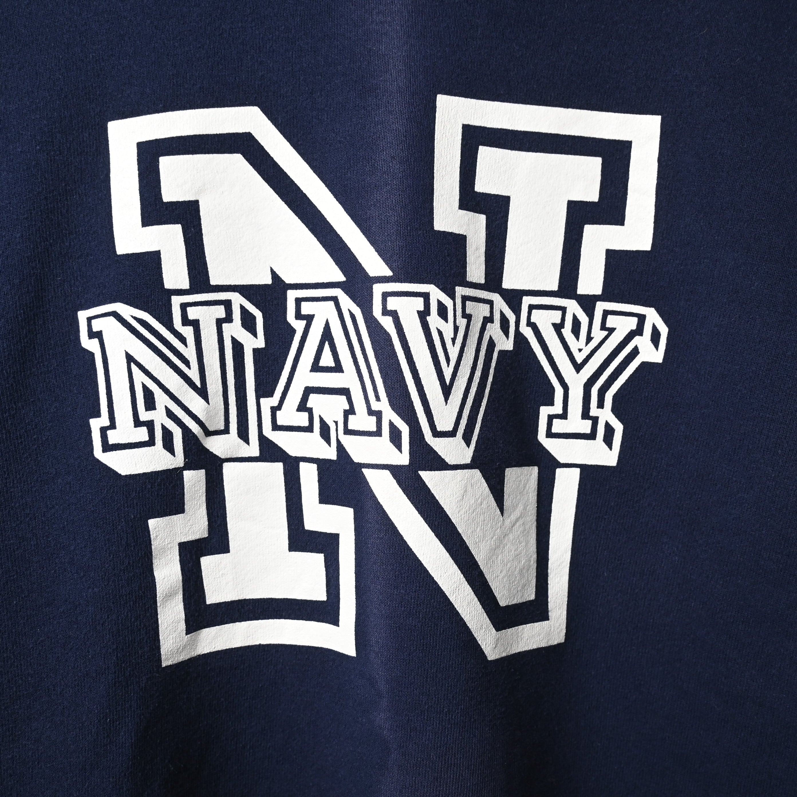アメリカ海軍(U.S. NAVY)を象徴するデザインで、ミリタリーらしい無骨さとカレッジライクな雰囲気を兼ね備えた一枚です。
