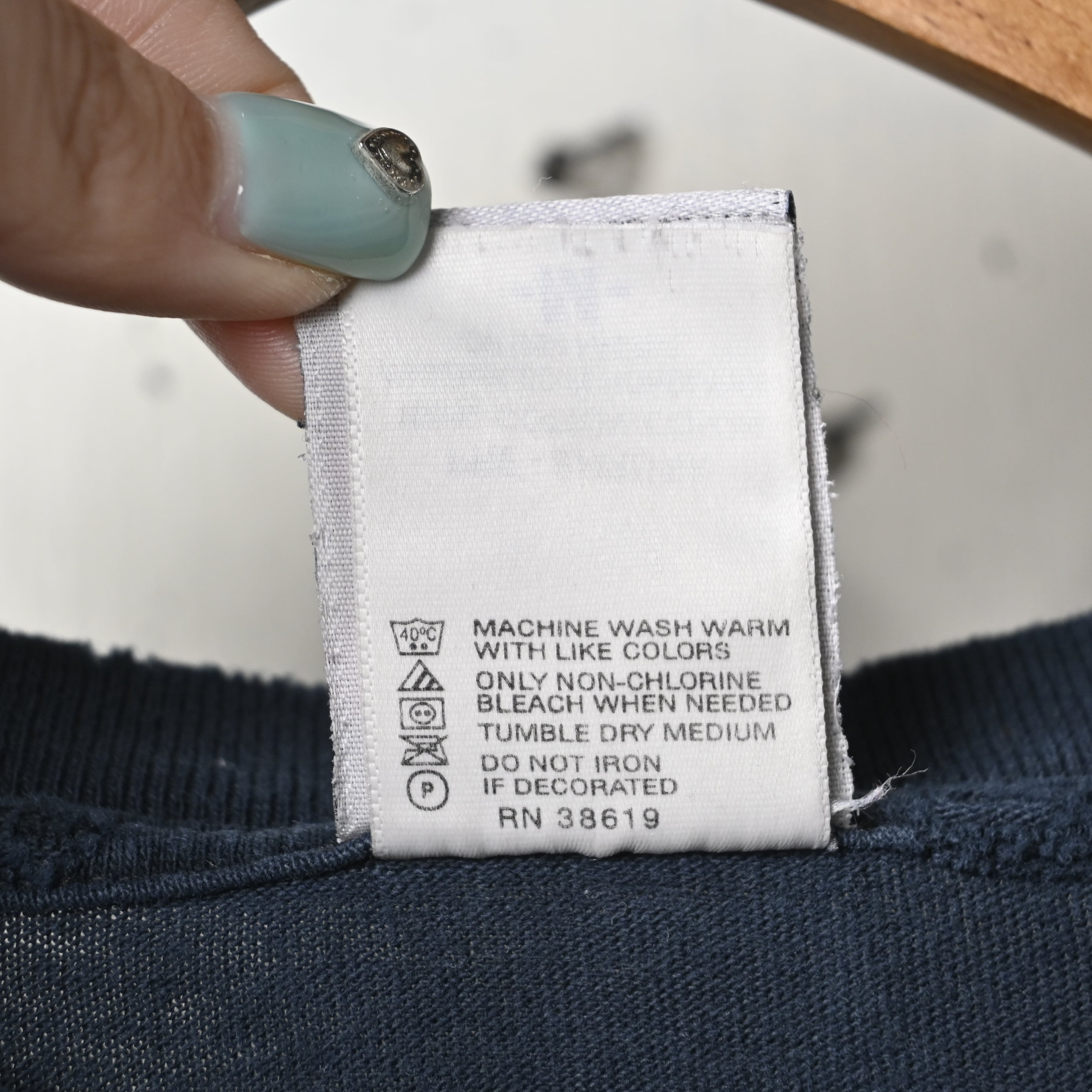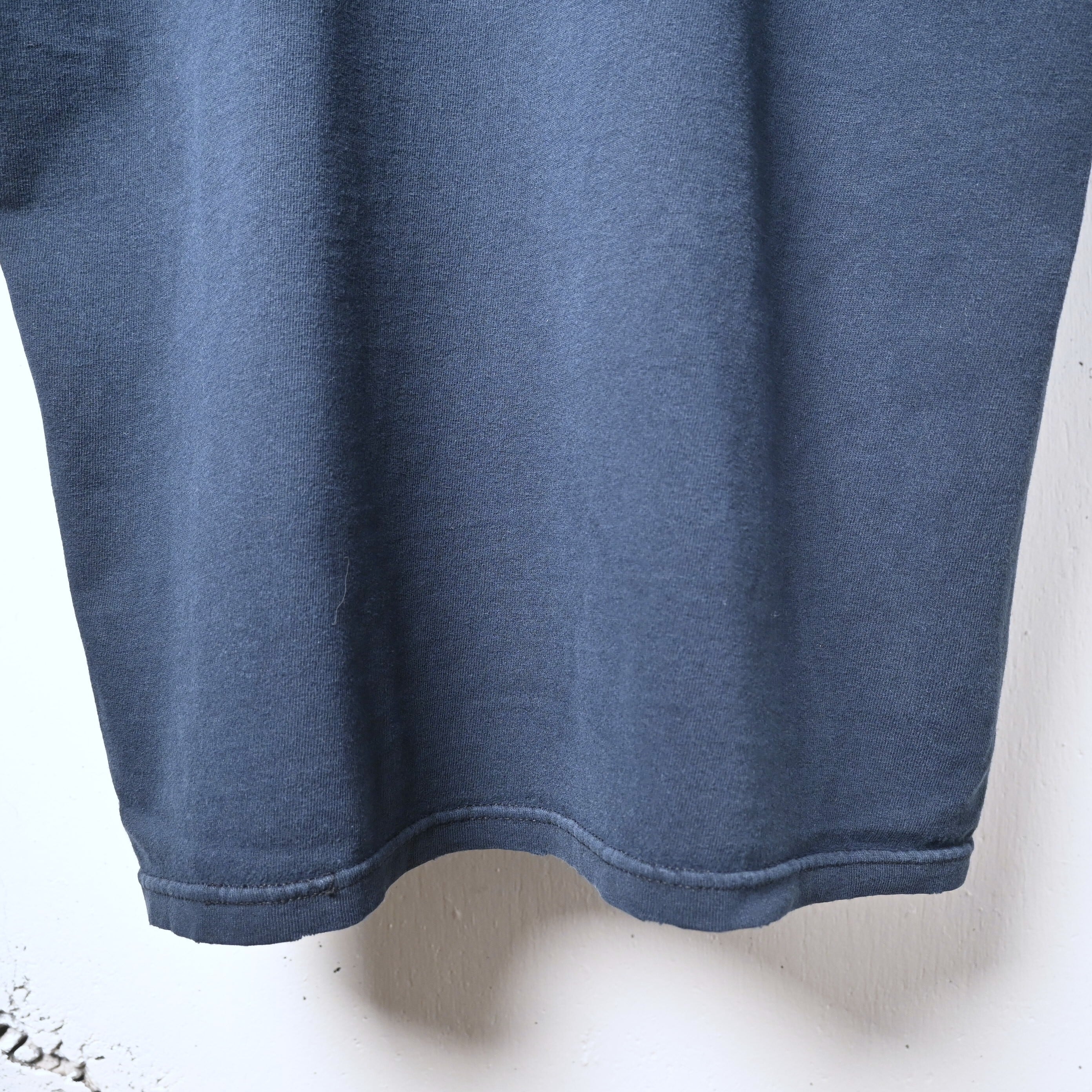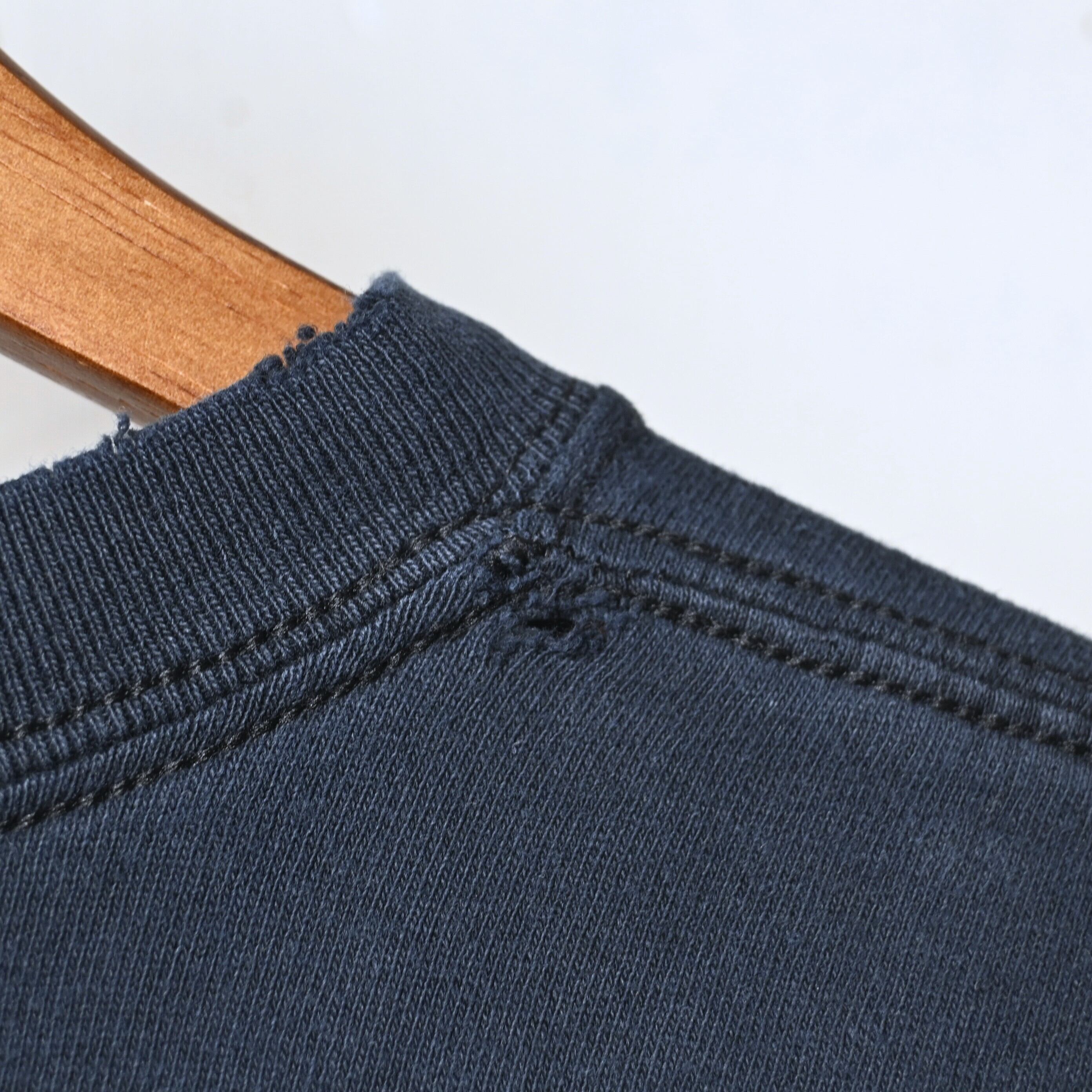 首元のダメージ、背面の右肩付近に小穴があります。プリントの下に小さな色落ちの跡があります。全体的にフェードや使用感が見られます。古着らしい風合いとしてお楽しみいただけるコンディションで、着用に支障のあるダメージはありません。