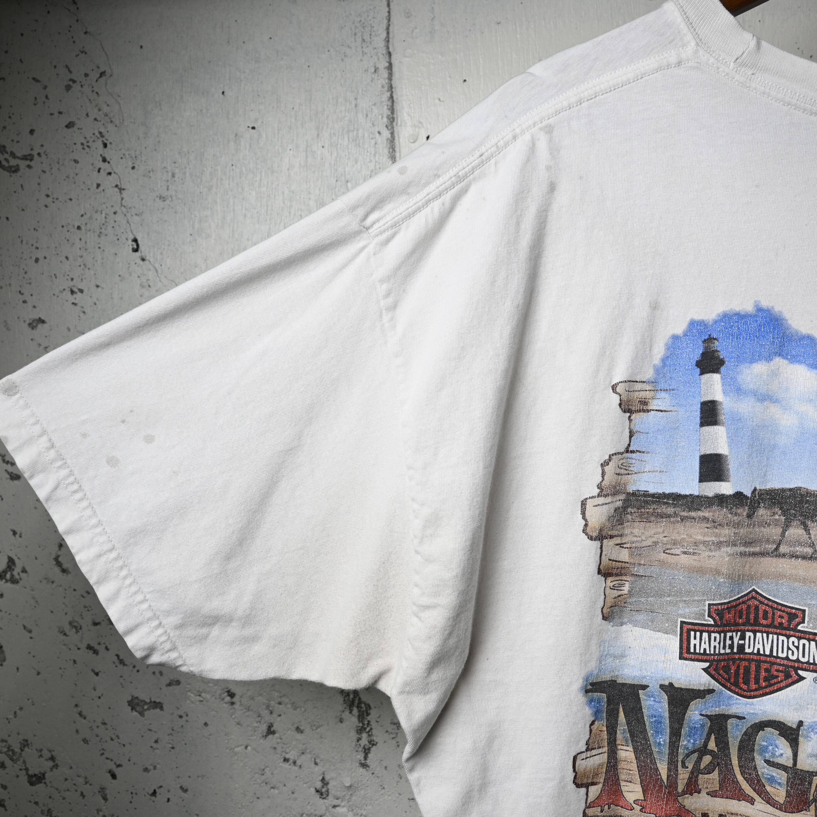 灯台や海岸のモチーフは、ハーレーの“旅”や“自由”といったカルチャーともリンクし、単なる企業Tシャツとは一線を画すデザイン。