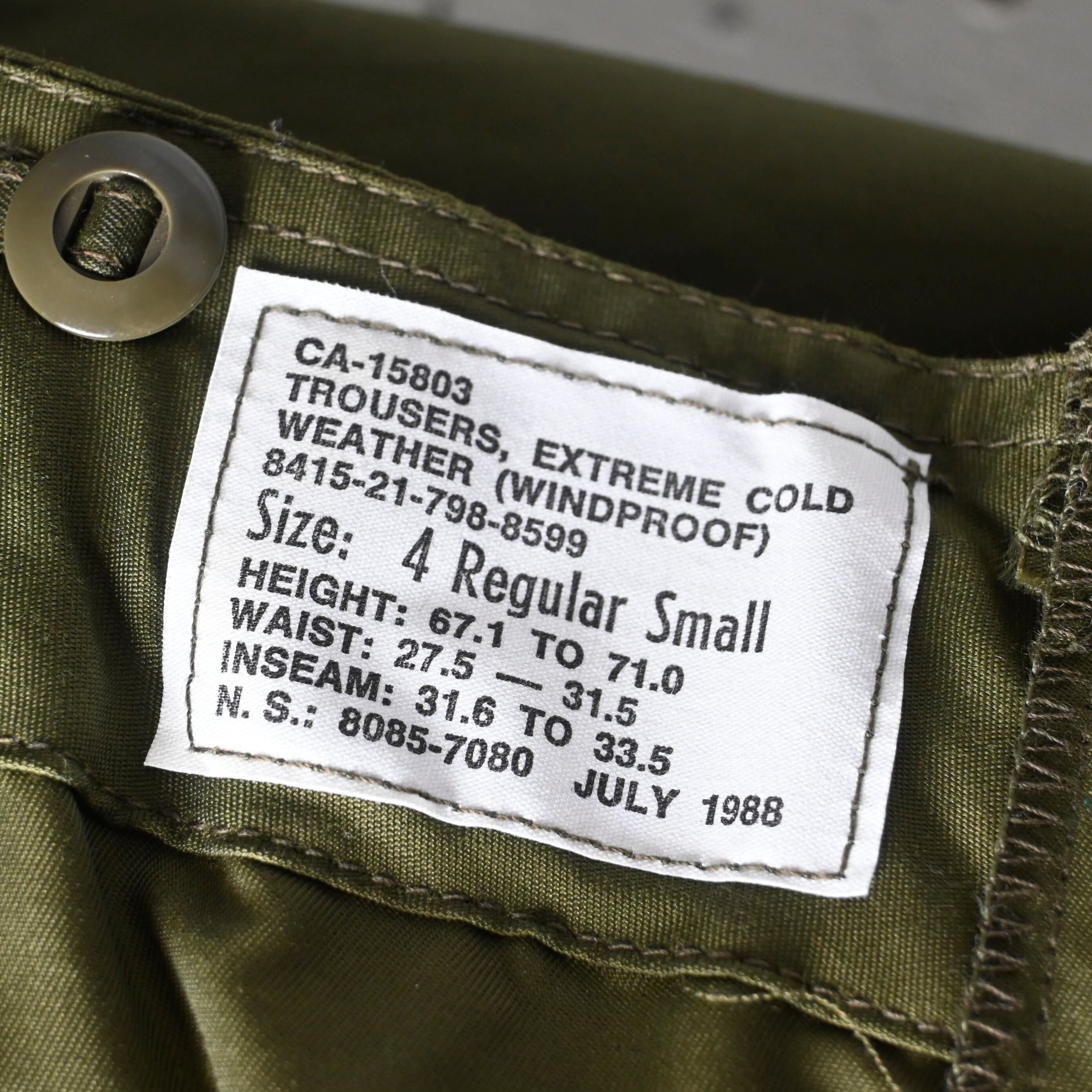 [ 4 Regular Small ] Canadian Army 1988年会計 Extreme Cold Weather Trousers , OG