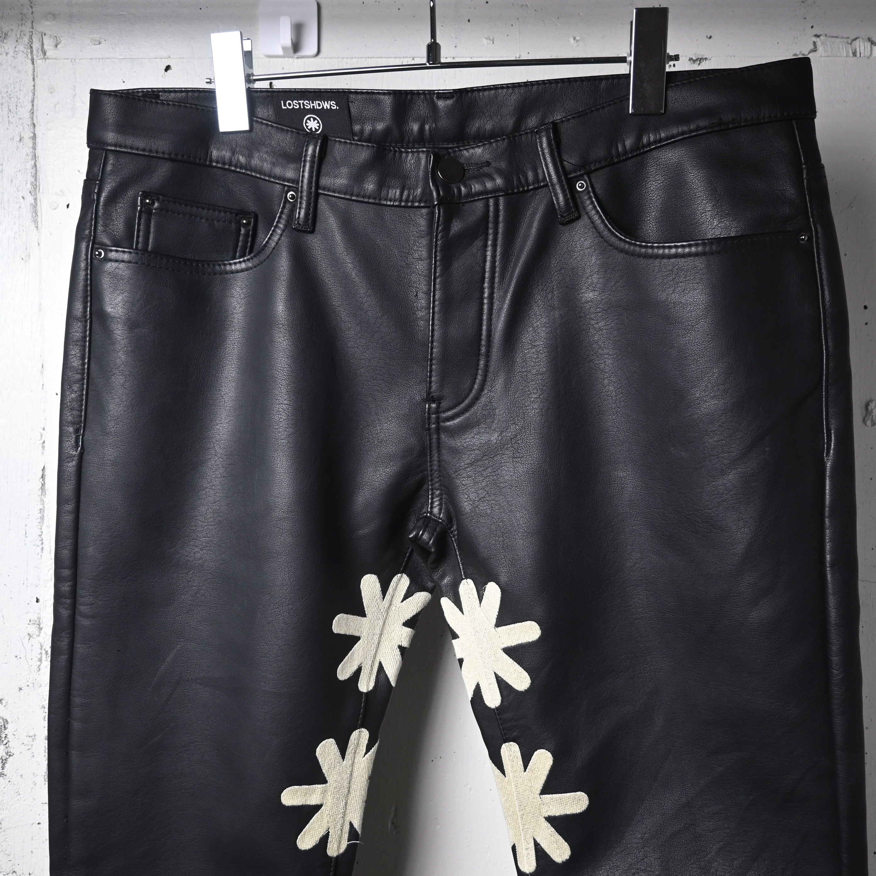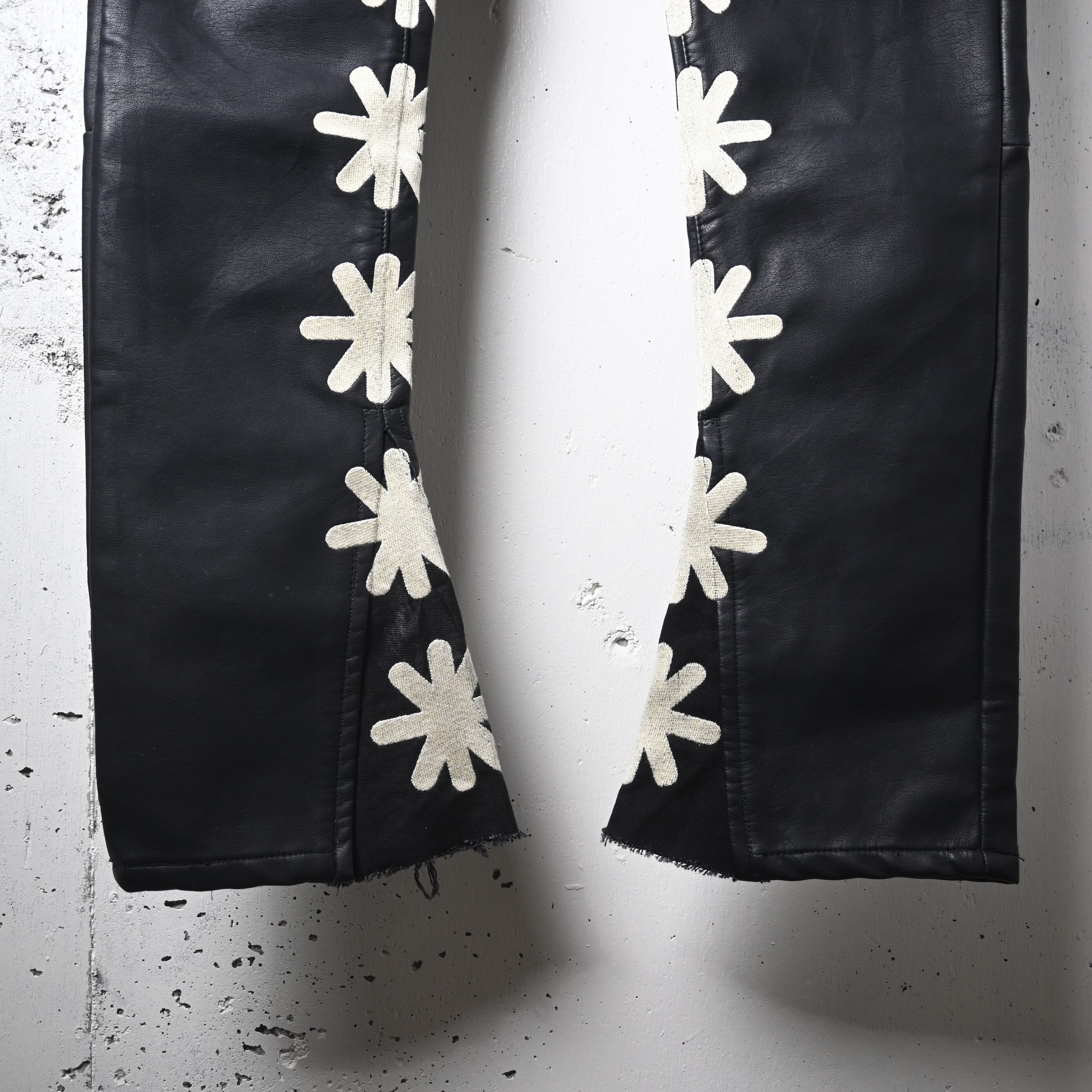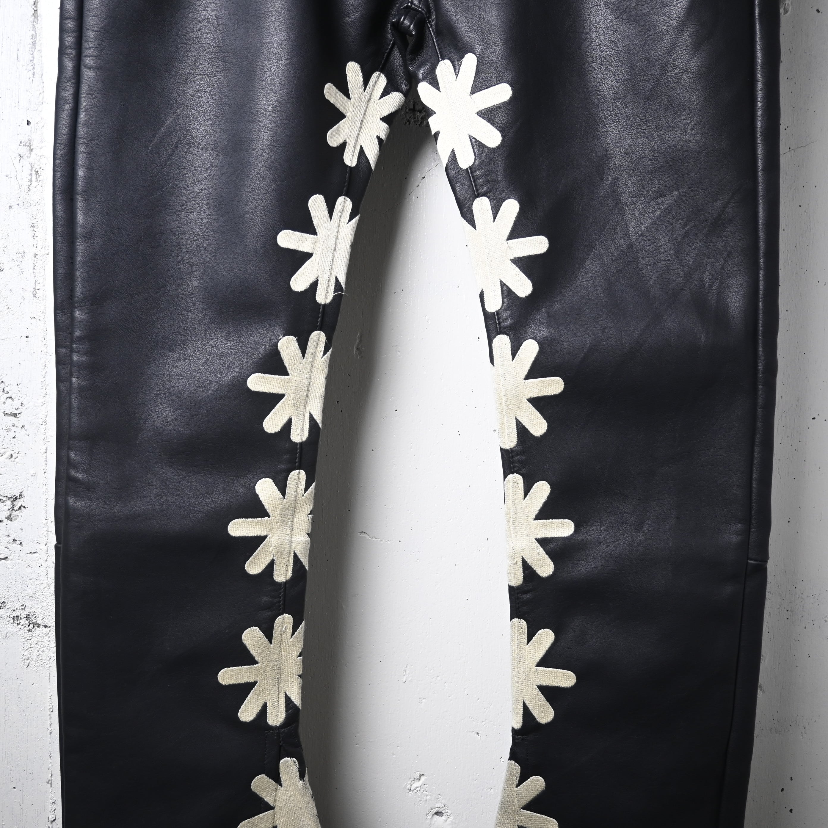 ブラックのPUレザーボディに対し、両脚内側へ大胆に施されたホワイトのフラワー状パッチデザインが目を惹く一本。シンプルなレザーパンツとは一線を画す、ストリート感とモードな雰囲気を兼ね備えたデザインに仕上がっています。
