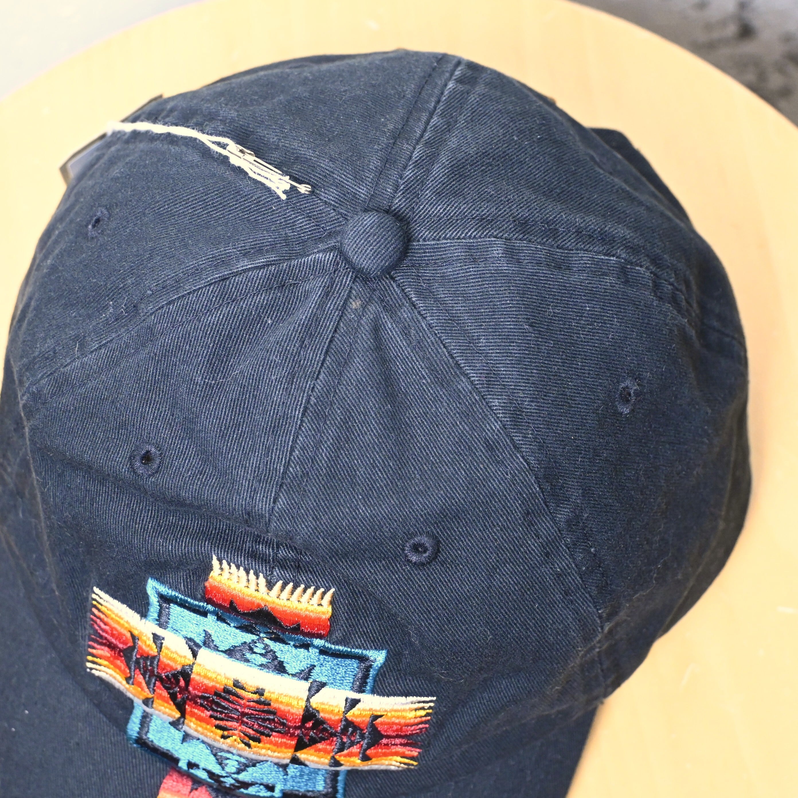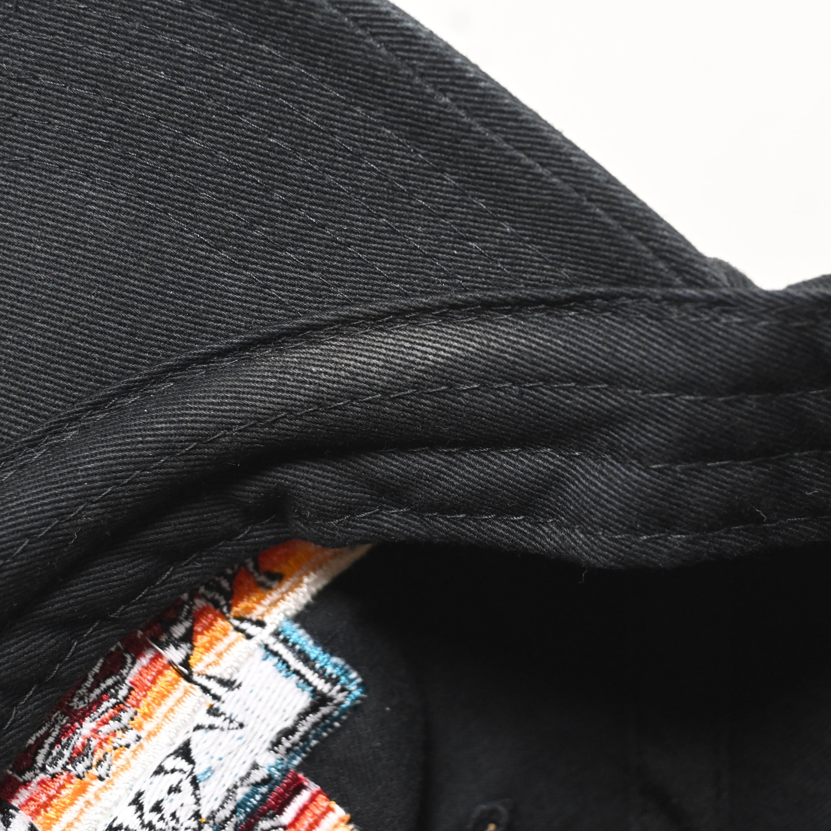 こちらはブラックボディをベースに、フロントへブランドらしいネイティブパターン刺繍を大胆に配置した一本。赤・オレンジ・イエロー・ブルーを組み合わせた配色が映え、シンプルな黒ボディの中でしっかり存在感があります。