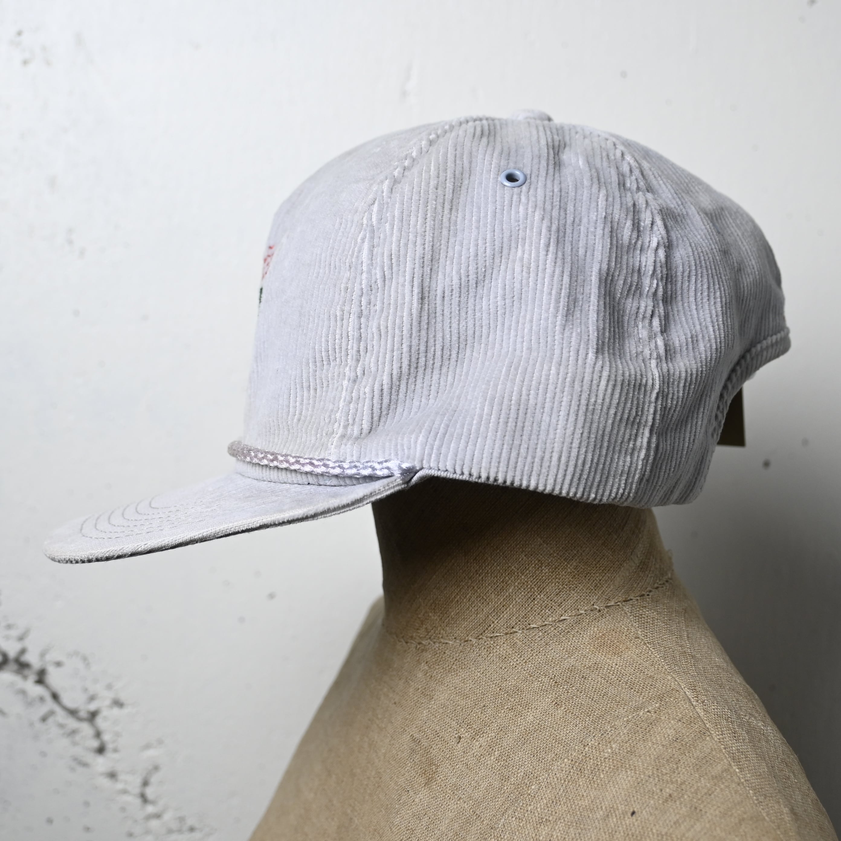 こちらは淡いグレーカラーの細畝コーデュロイ素材を使用した一本。フロントには "diet 7UP" ロゴがグリーン×レッドで刺繍され、ホワイト〜ライトグレー系の柔らかなボディカラーとのコントラストが非常に良い仕上がりです。