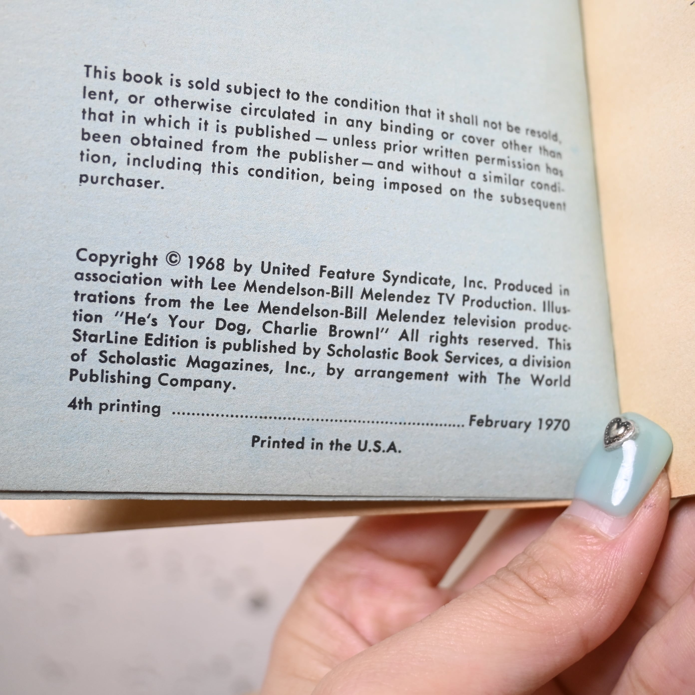 1968年コピーライト表記、Charles M. SchulzによるPeanutsシリーズの一冊で、Scholastic Book Services発行の当時流通していたスクールブック仕様。紙質や印刷の風合い、経年によるやや焼けたページまで含めてヴィンテージブックならではの雰囲気があります。