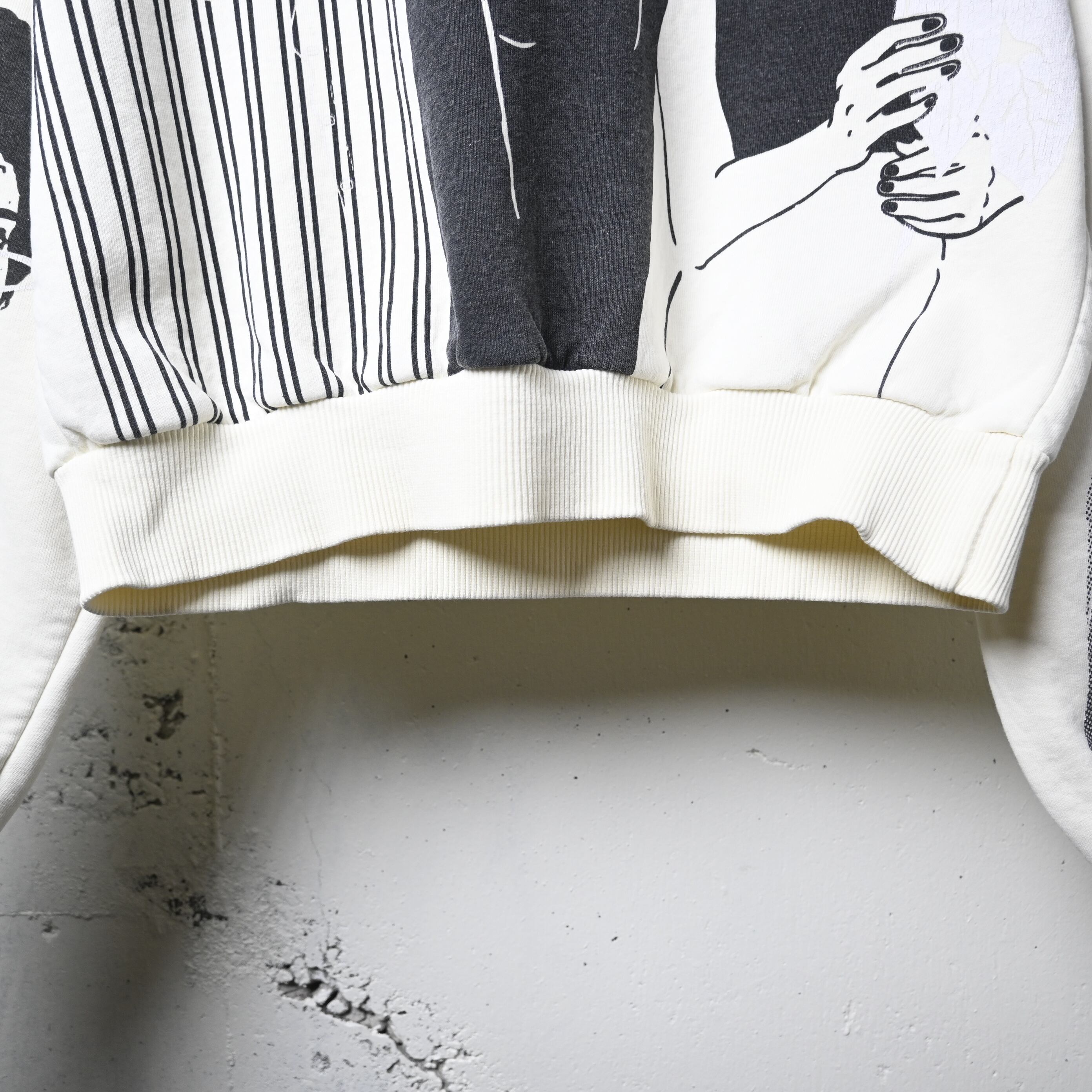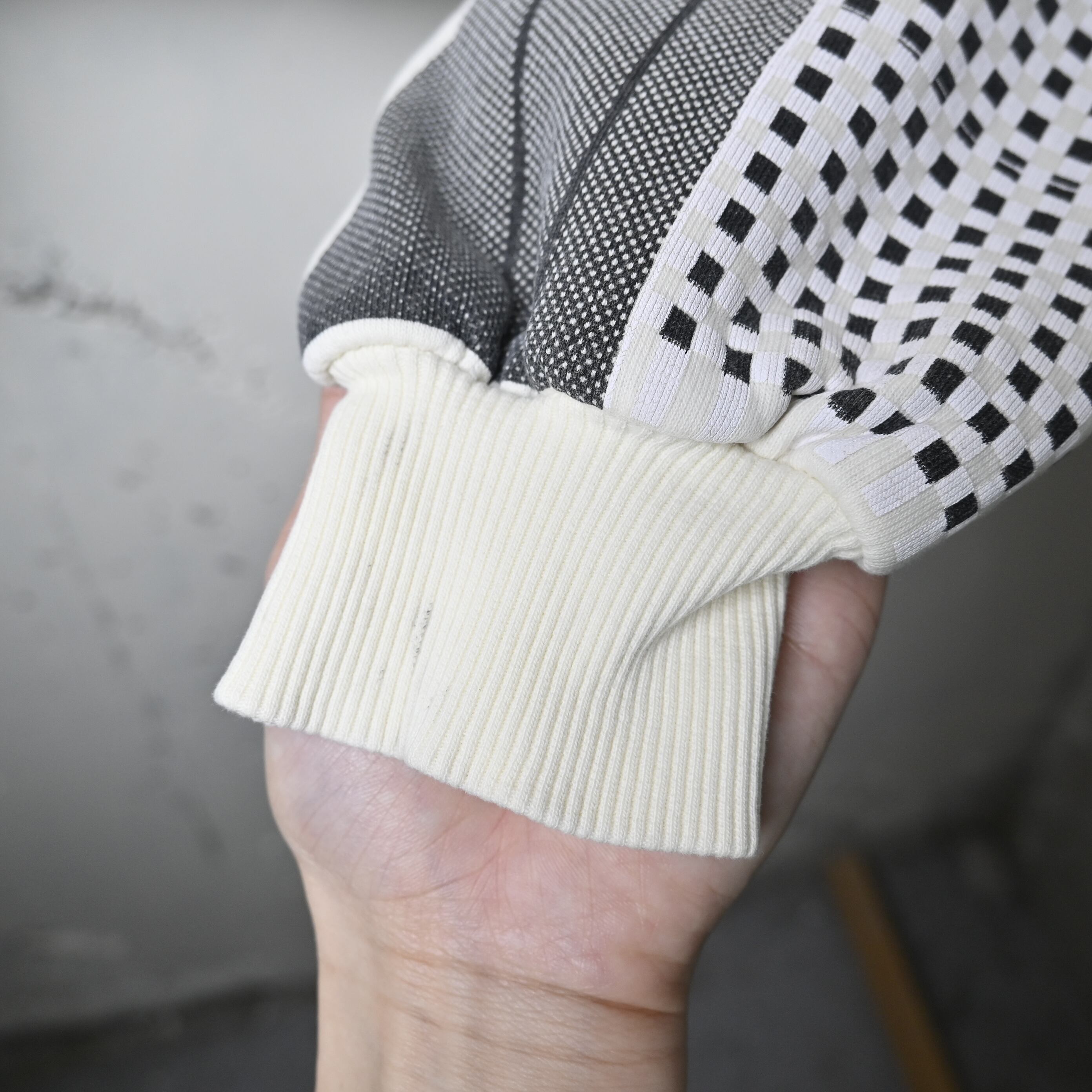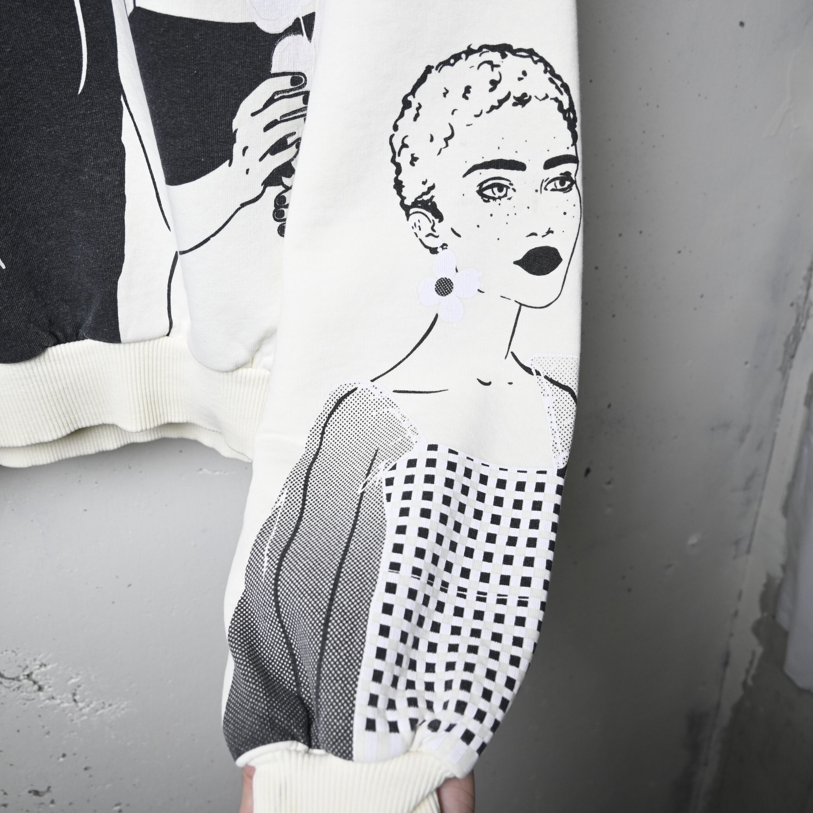 モノトーンで統一された配色ながら、ドットやストライプなど細かな表現が効いており、シンプルになりがちなスウェットの中でもしっかり主張できるアイテム。80〜90年代らしいアート寄りのグラフィックで、今のファッションにも自然にハマります。