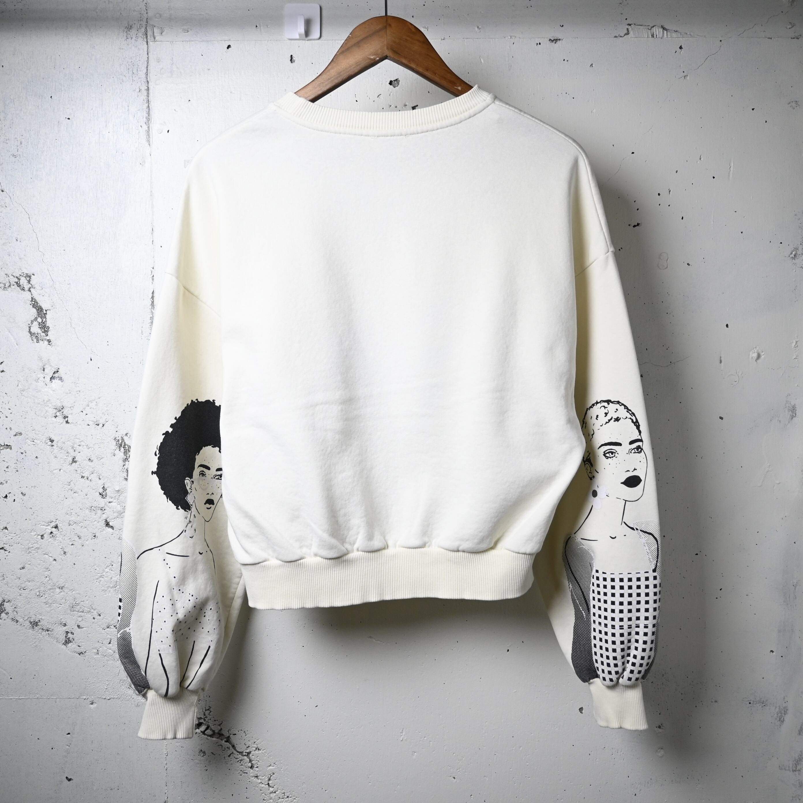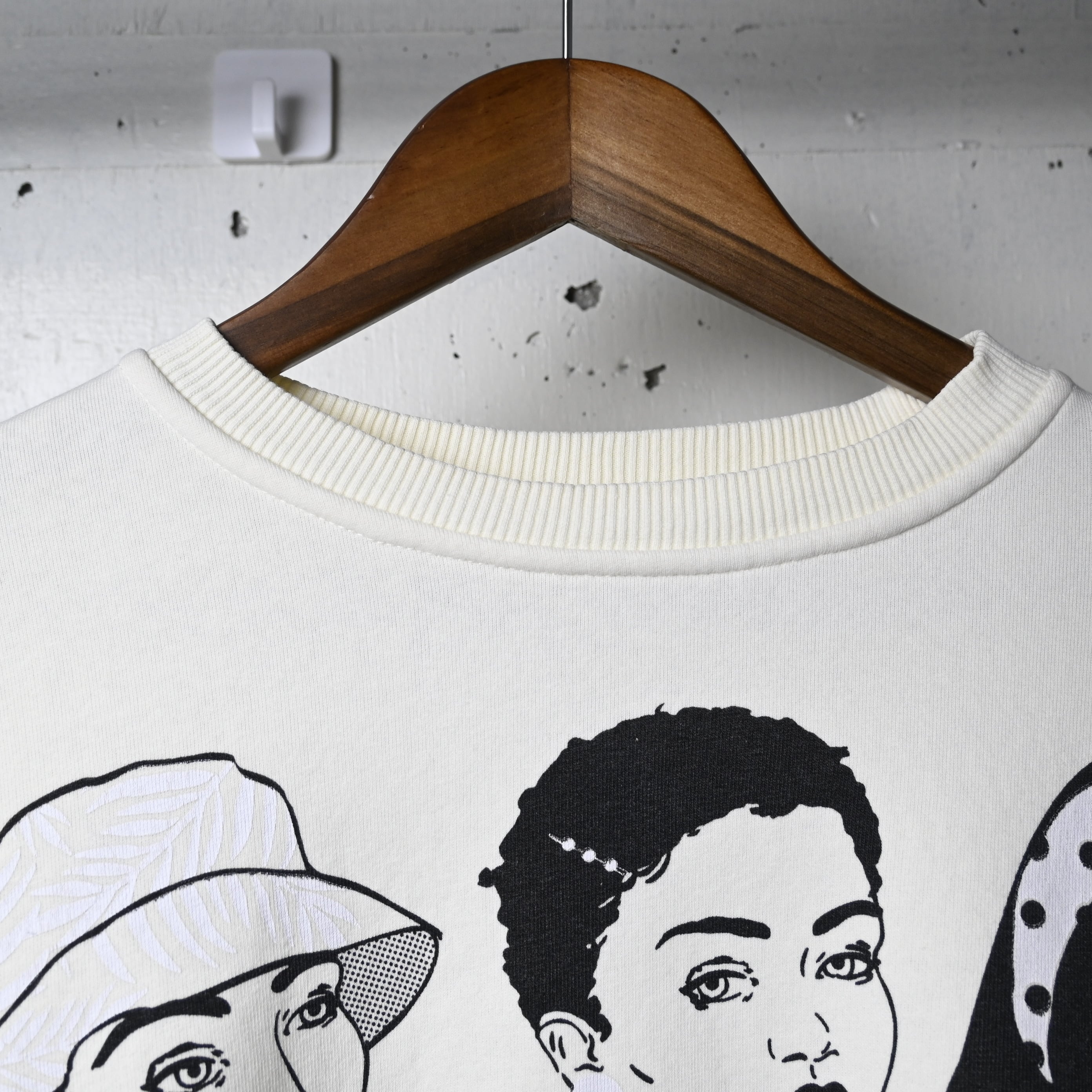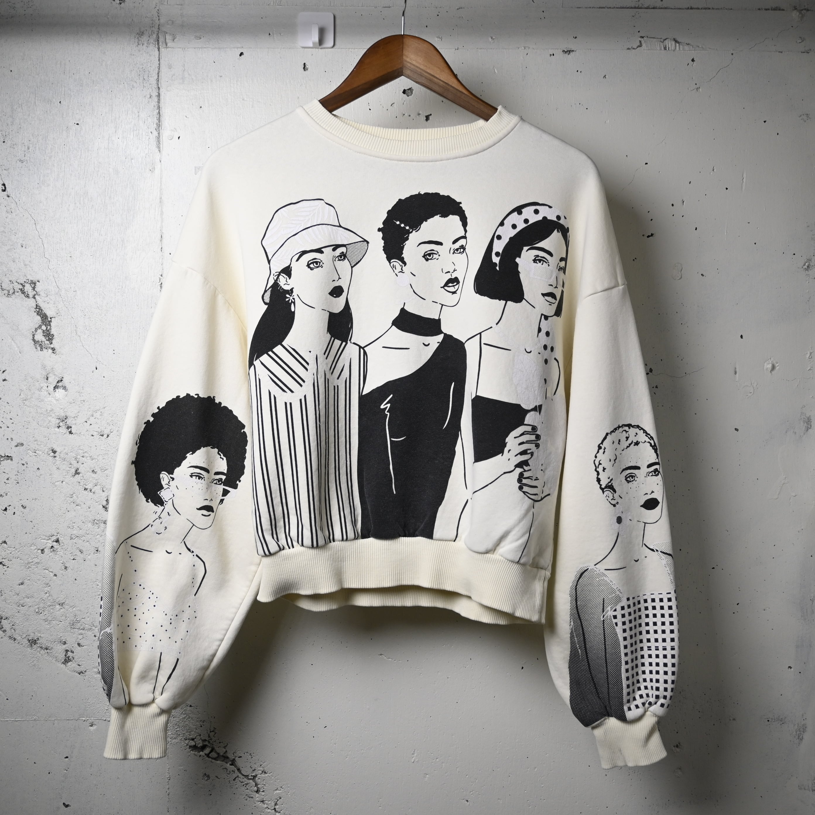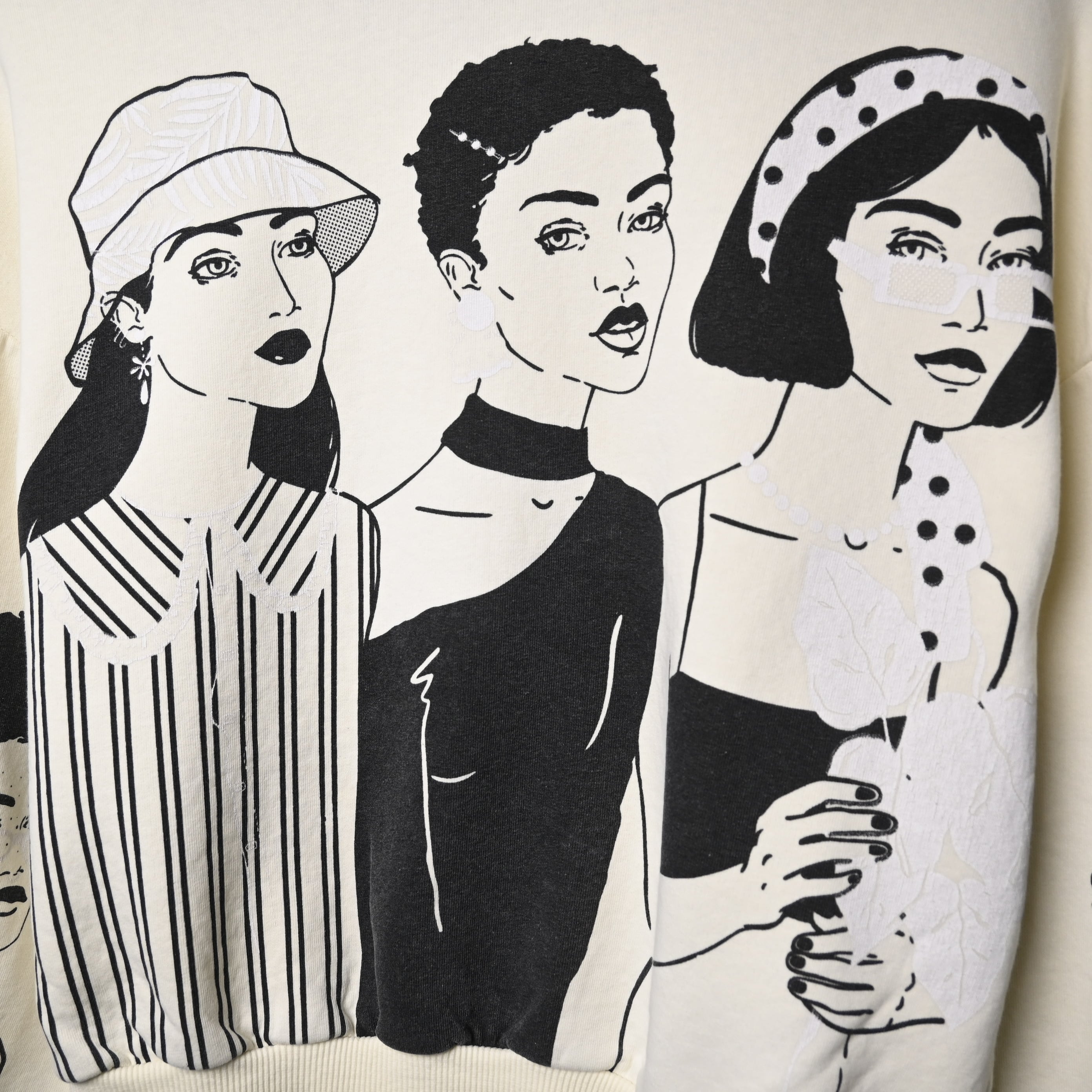 フロントには異なるスタイルの女性たちが並ぶ印象的なグラフィック。さらに両袖にもそれぞれ別の女性像が配置されており、全体で一つの作品のように仕上がったデザイン性の高い一枚です。