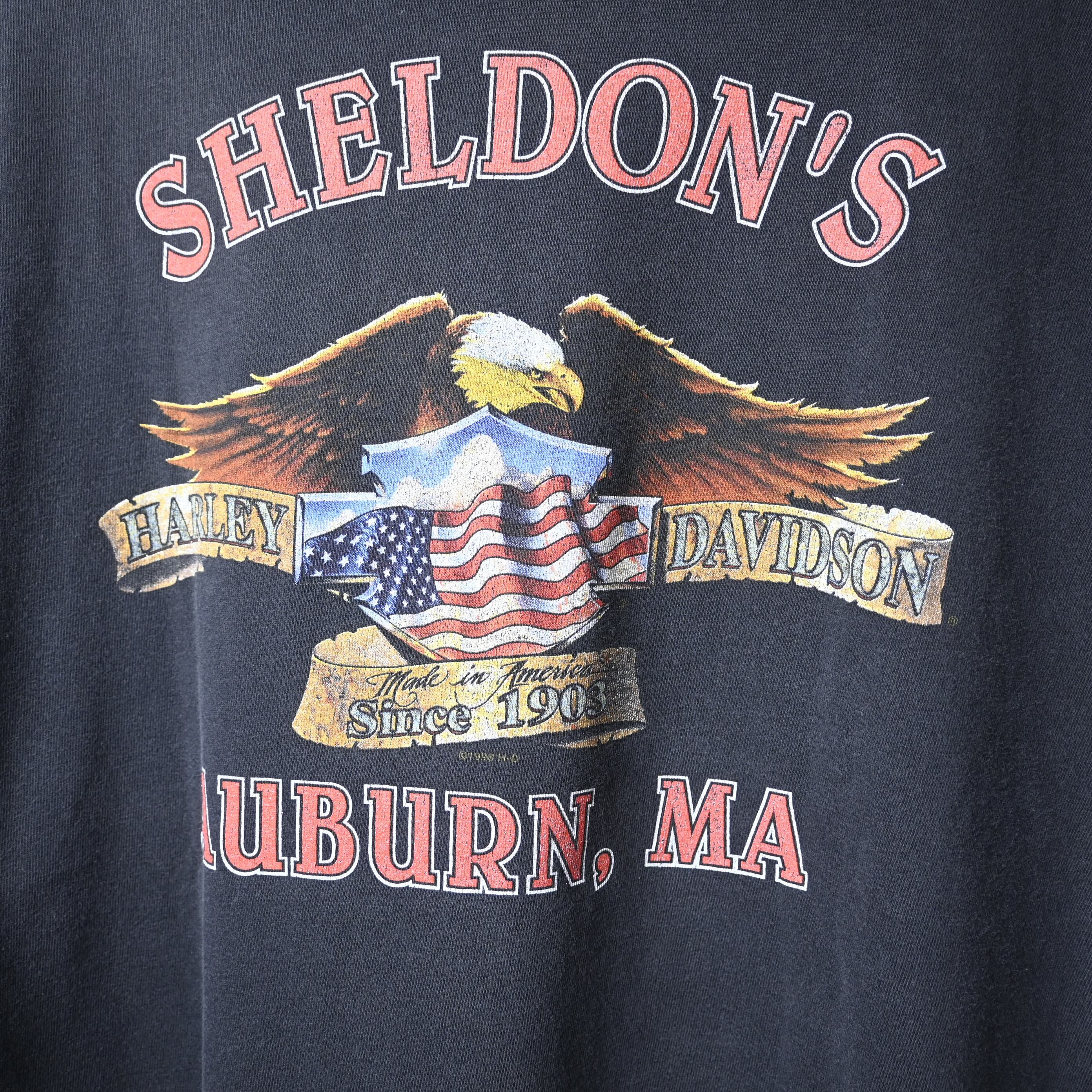 バックには“SHELDON’S / AUBURN, MA”のローカルディーラープリント。イーグル×アメリカ国旗の王道モチーフに、“Made in America Since 1903”の表記も入り、ハーレーらしいアメリカンカルチャーを強く感じるグラフィックです。