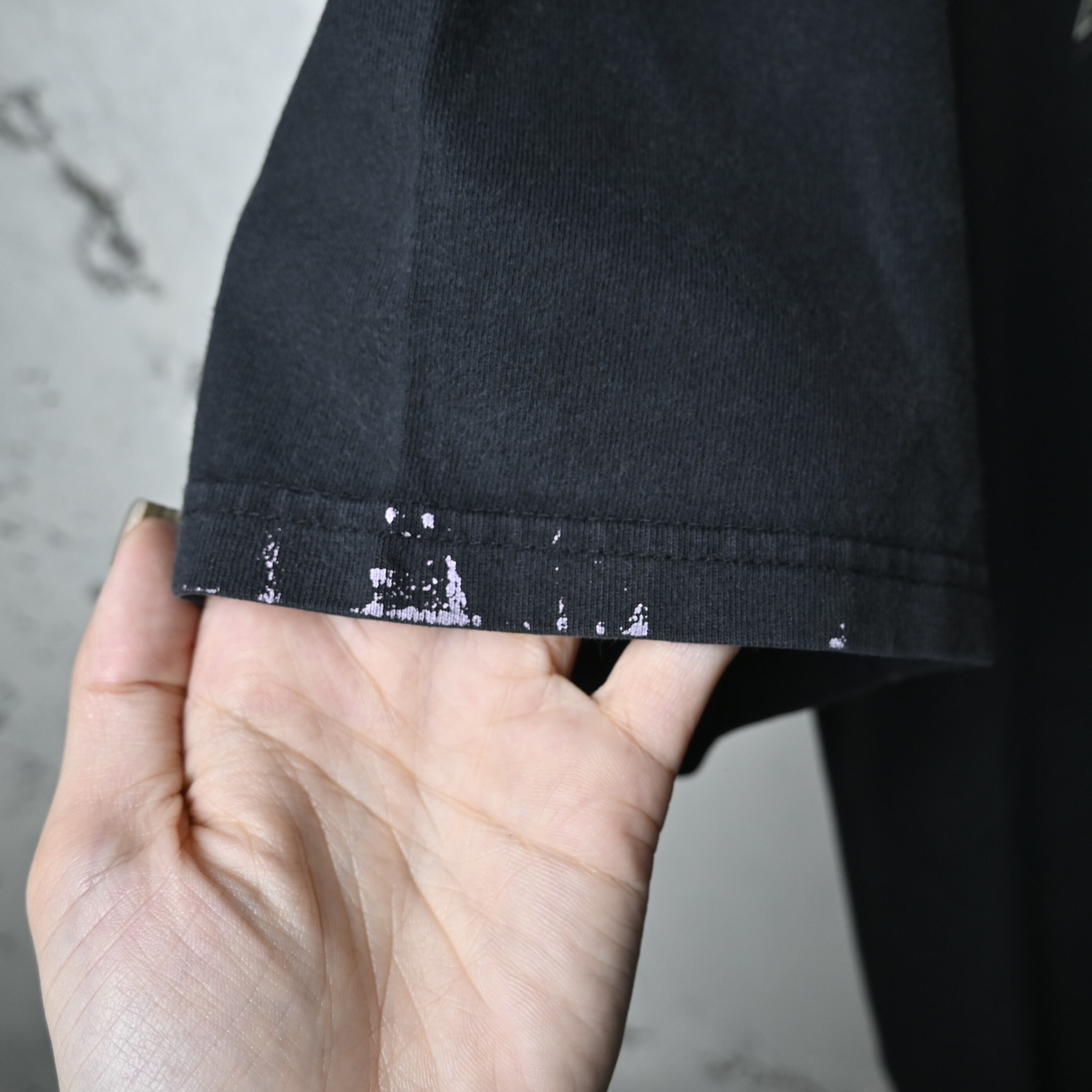 さらに袖付近にペンキ汚れのようなダメージがあり、リアルなエイジングとして一点モノ感を強めています。