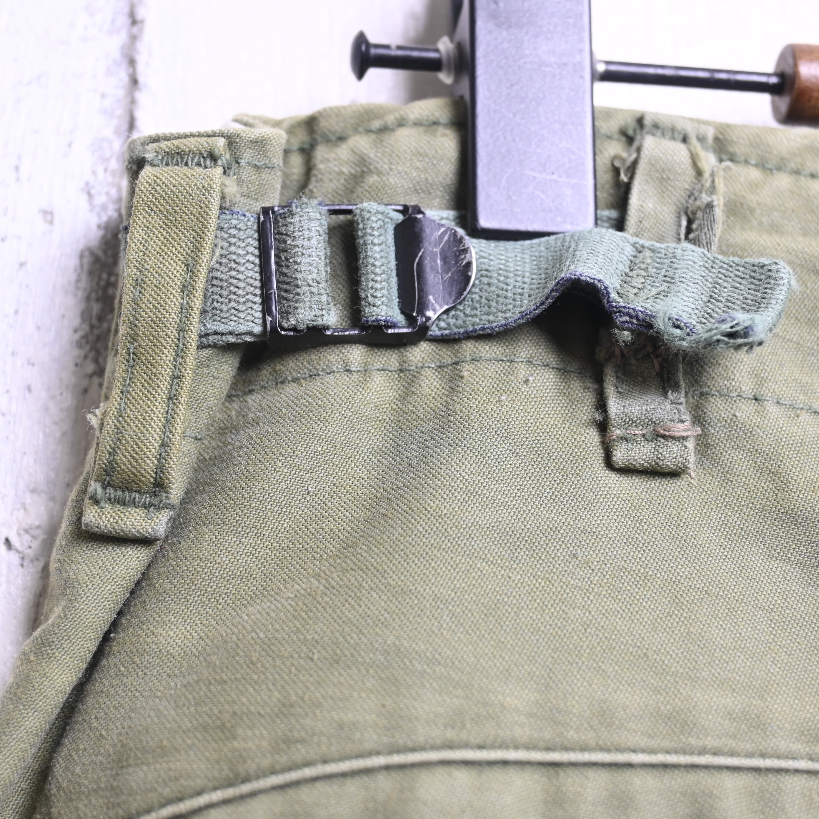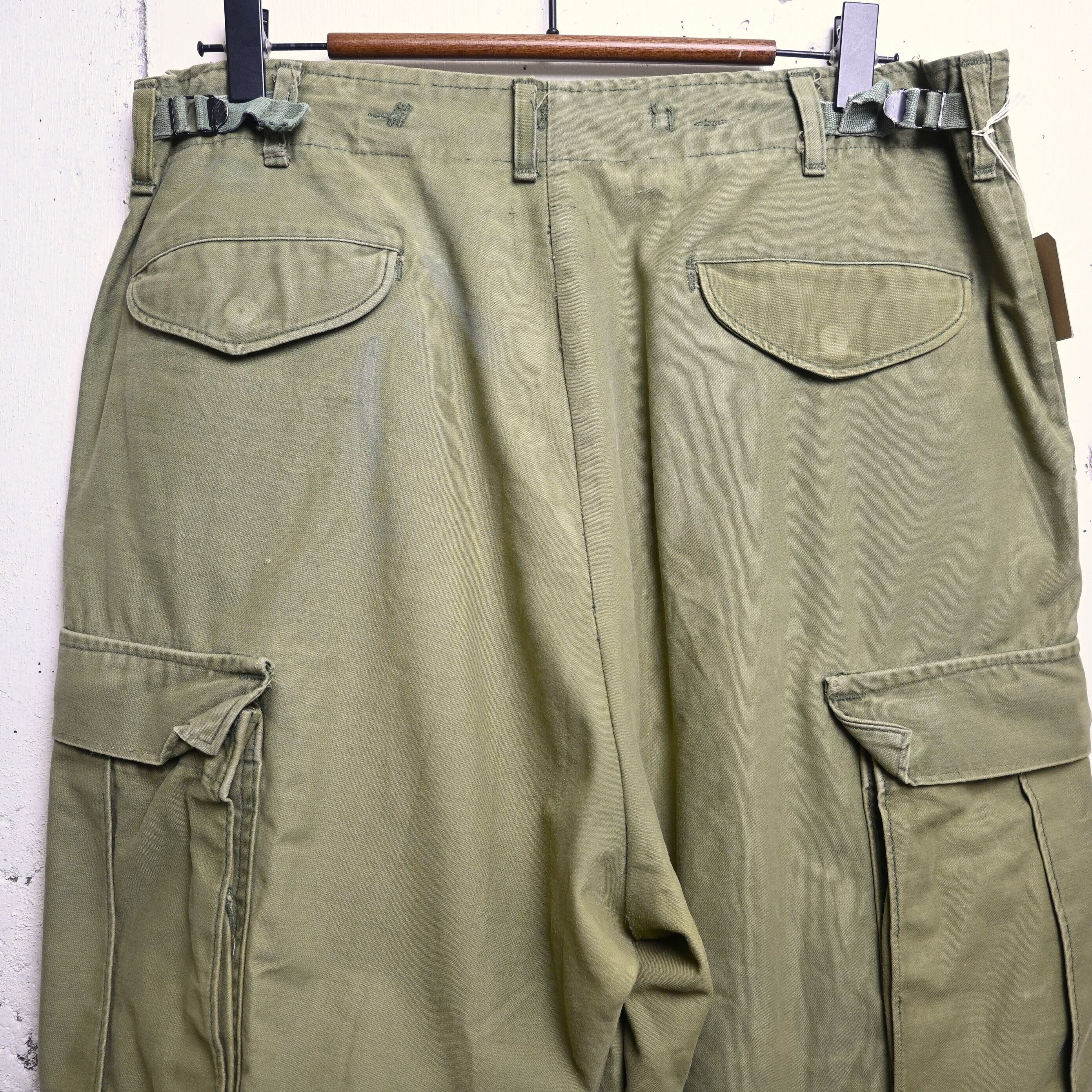 フロントの大型カーゴポケット、バックフラップポケット、ウエストアジャスター、裾ドローコード、ライナー装着用の内部ボタンなど、M-65ならではの機能的なディテールがしっかり残っています。1970年代前半らしいやや淡いオリーブカラーも魅力で、履き込むことでさらに風合いが増していく個体です。